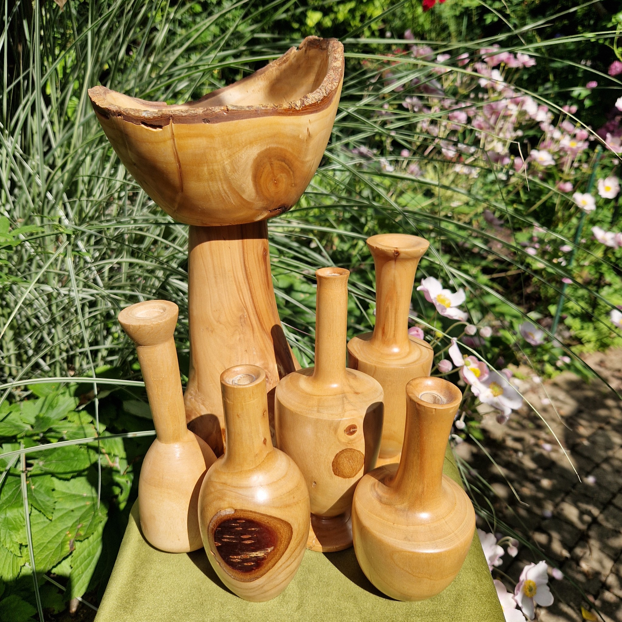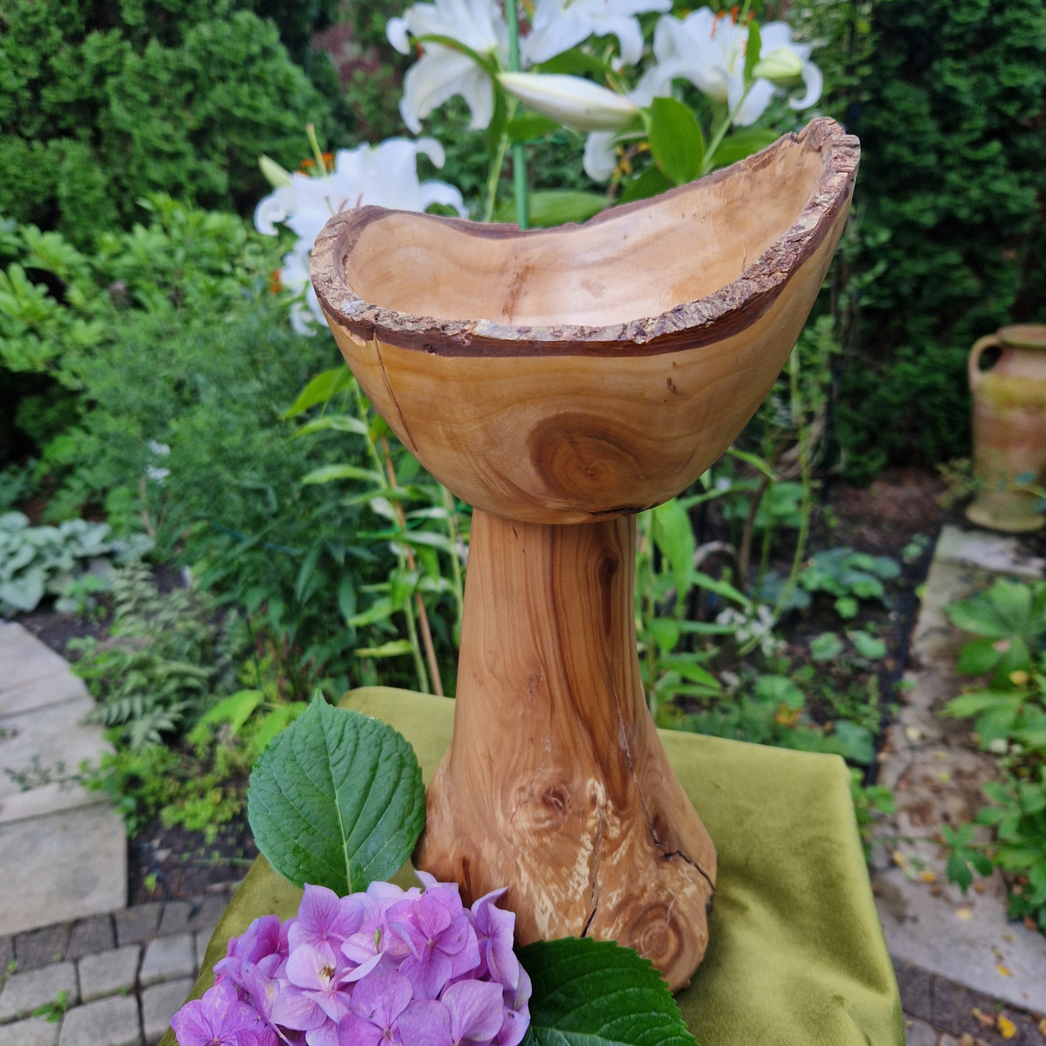 Our asymmetric wood chalice or goblet channels that same mythic spirit. Shaped in the wabi-sabi tradition, it honours natural form and imperfection. The bowl retains its bark edge, rising unevenly like a windswept crest. The stem leans off-centre, forming a soft, organic arc. The base holds knots, cracks, and bark—marks of the living tree. Crafted from dense fruitwood, the chalice feels solid, stable, and full of character.