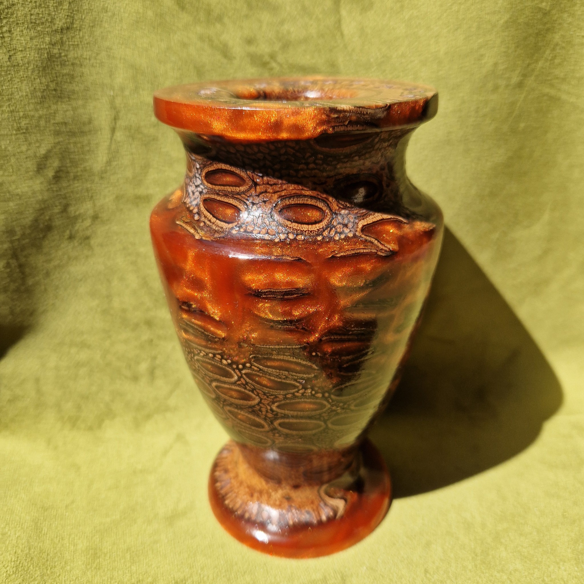 This Epoxy Banksia Vase in Orange showcases the natural beauty of the Banksia Seed Pod in stunning detail. Suspended in deep, swirling orange resin streaked with shimmering lighter tones, each pod reveals unique ellipsoids, swirls, and bold dots. Native to Australia, the Banksia Pod creates a dramatic, eye-catching centerpiece.