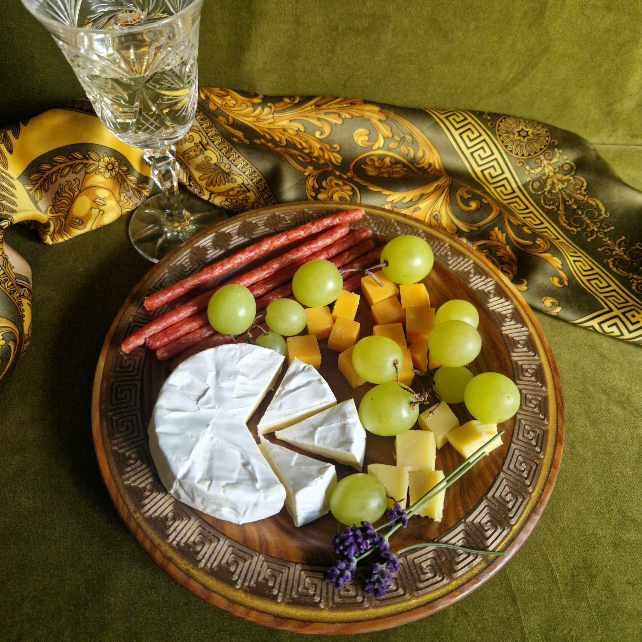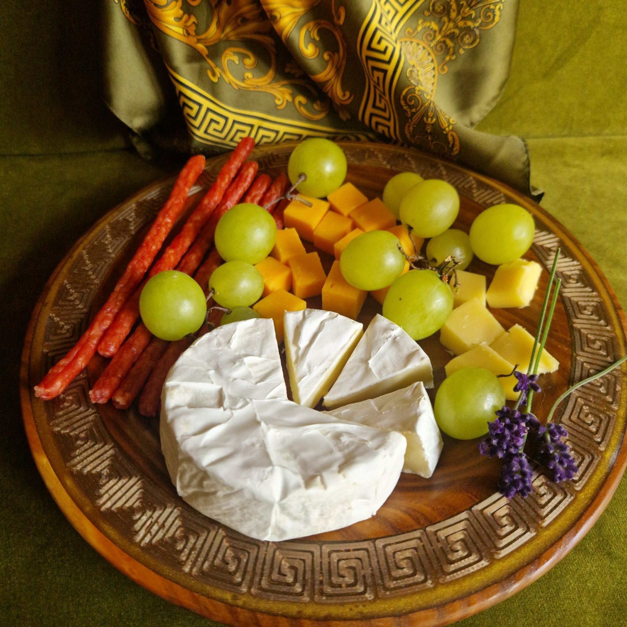 Sunlight makes the Greek key glow like ancient bronze. As you turn the plate, the shimmer shifts, adding a magical depth. Indoor lighting reveals the wood’s warm, natural brown tones, even if photos hint at red.