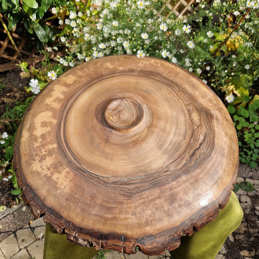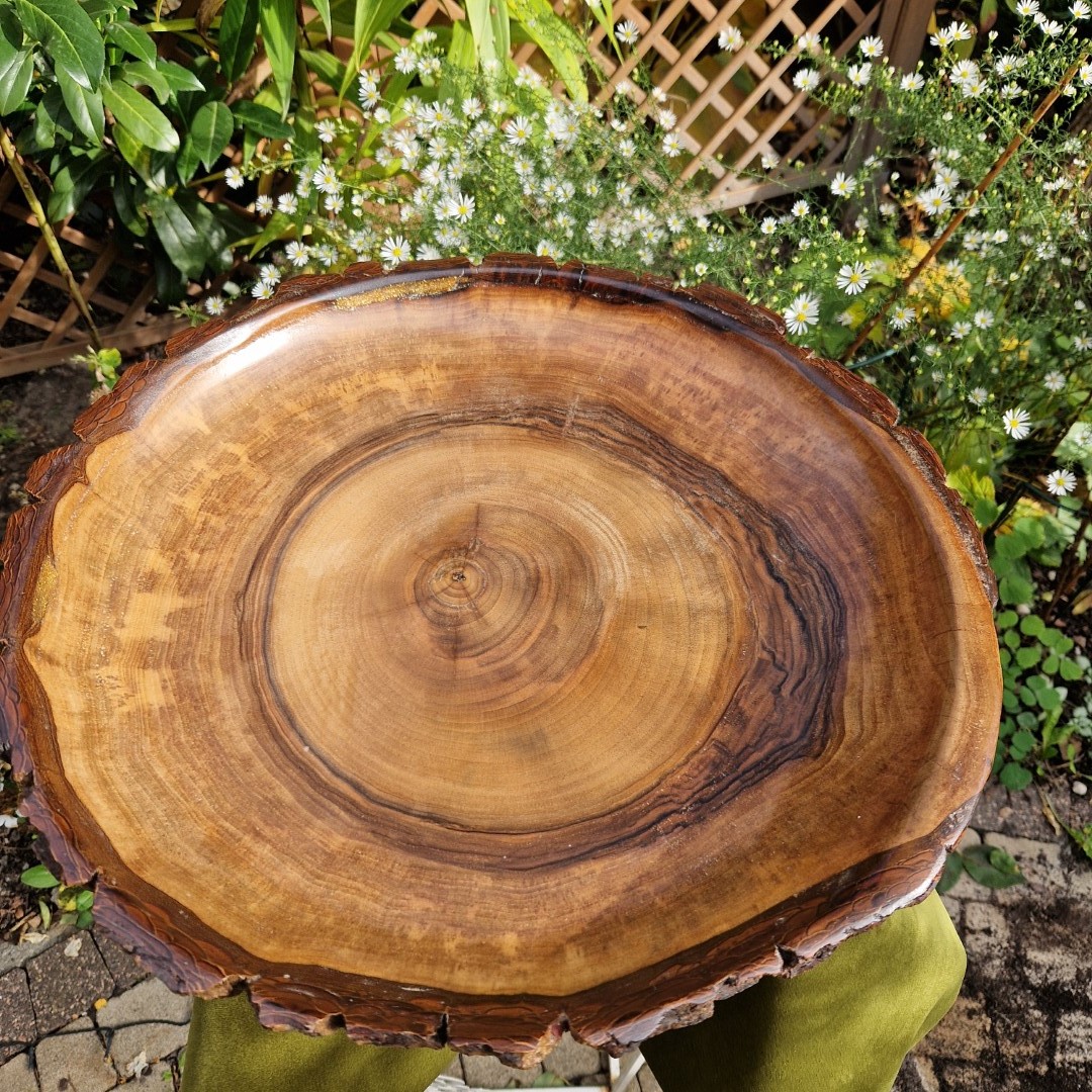 This large wood platter (European Walnut, Live Edge) shows the beauty of real wood. It highlights the difference between finished wood and the living tree it came from. Many makers lose the soul of the tree in the process. This handcrafted platter keeps it alive. The end-grain cut displays growth rings that reveal age, seasons, and resilience. A thick live edge of bark wraps the rim. It reminds us the platter was once part of a living tree.
