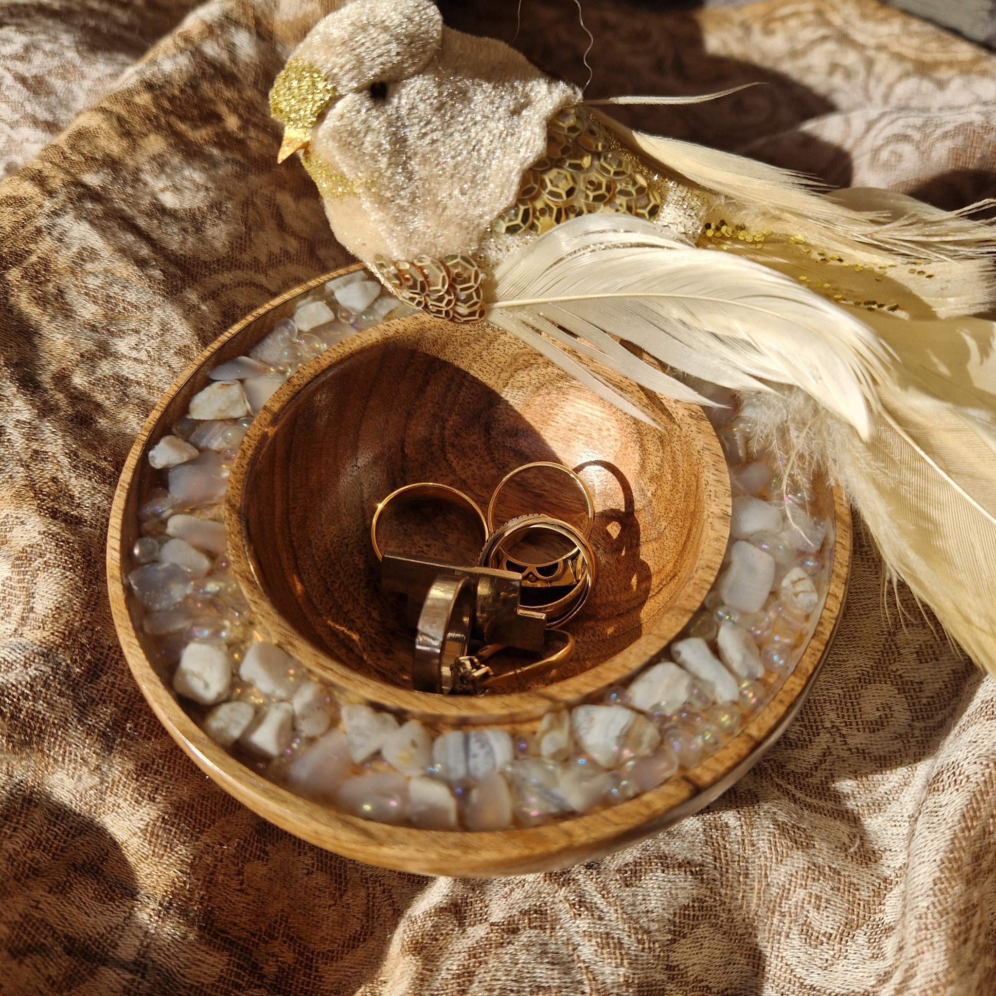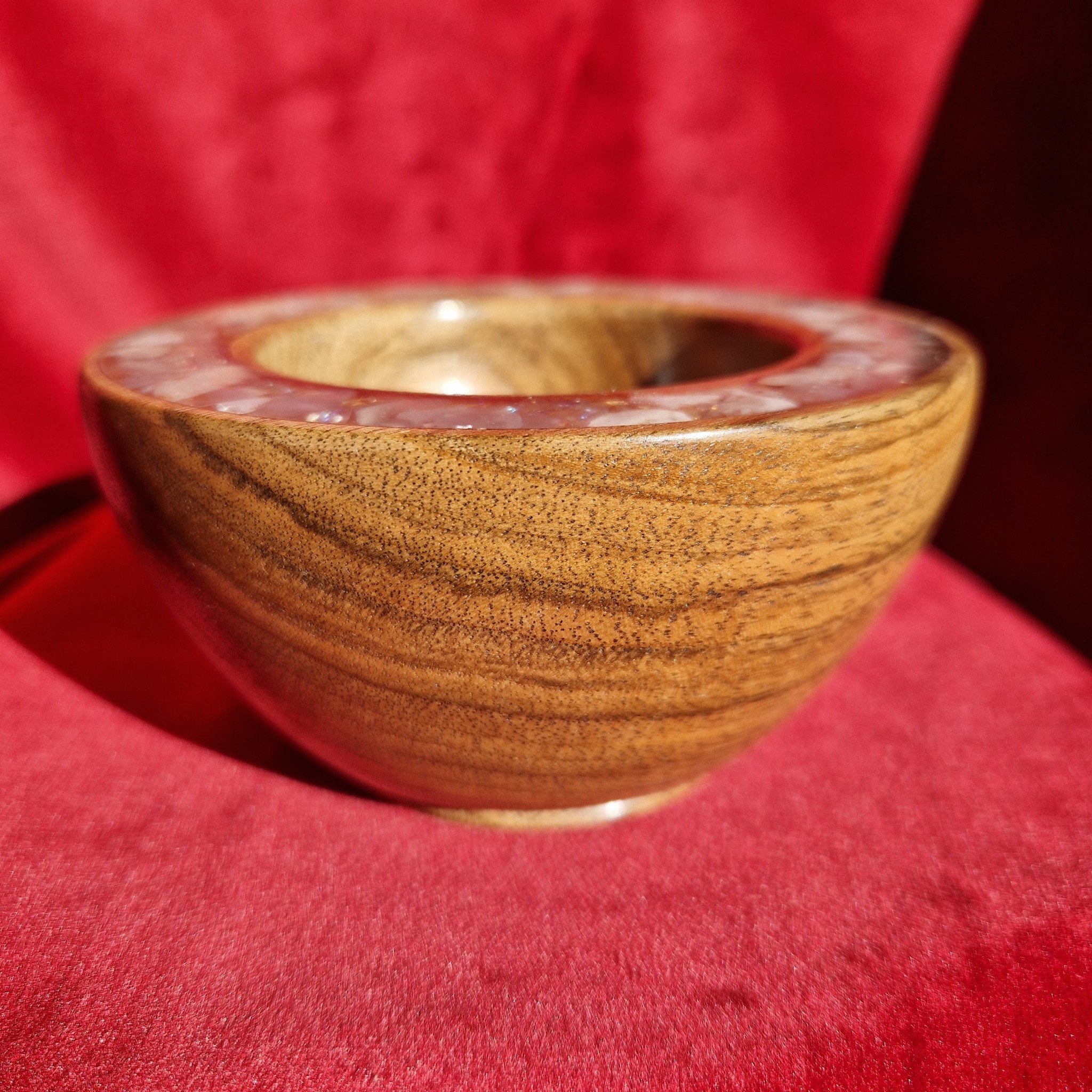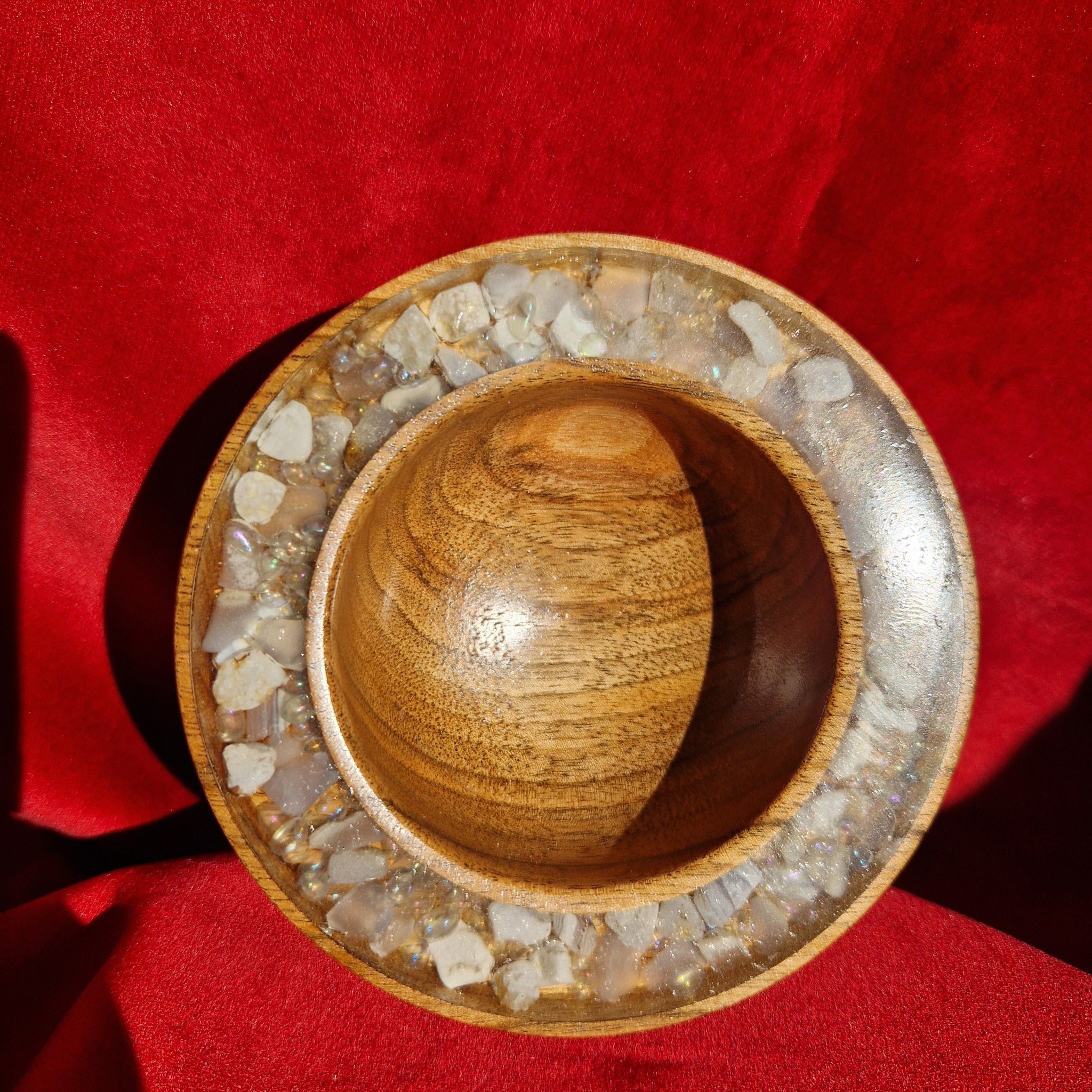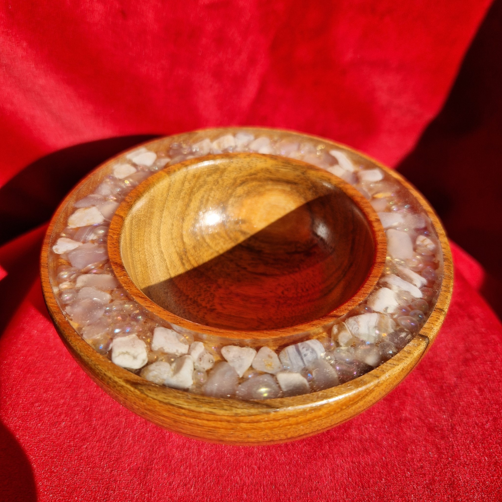 A glossy walnut ring bowl inlaid with Chalcedony and moon-aura quartz. For precious jewels, peaceful spaces, and moments of quiet glamour.