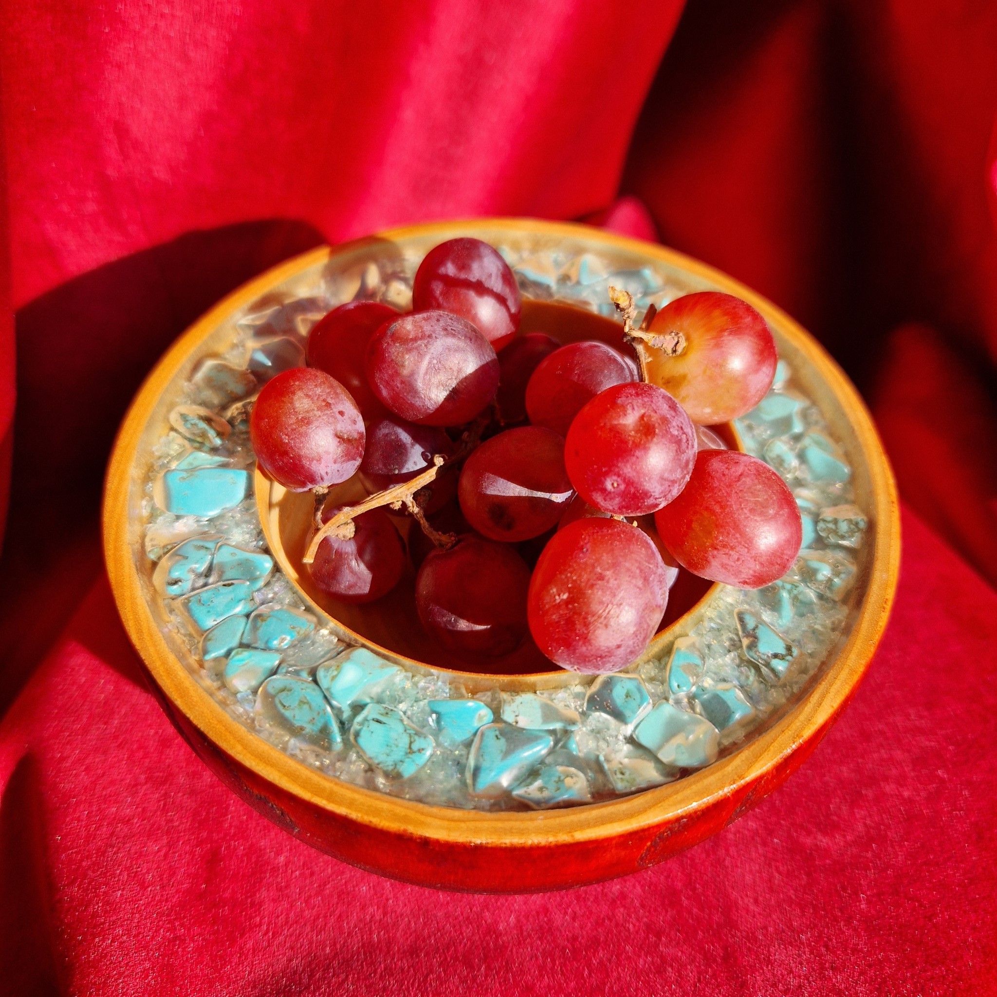 Artisans carefully hand-turn each bowl on a lathe. They polish it to a high-gloss shine. A transparent epoxy rim frames the piece, inlaid with semi-precious stones and minerals. Each detail celebrates the beauty of the treasures it holds. Small but striking, the bowl stands on a raised foot and features a deep hollow. It cradles your jewelry with care, precision, and style.