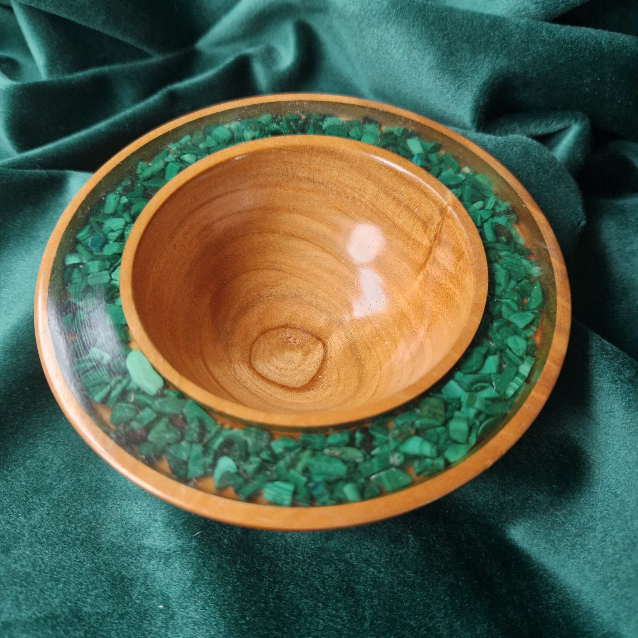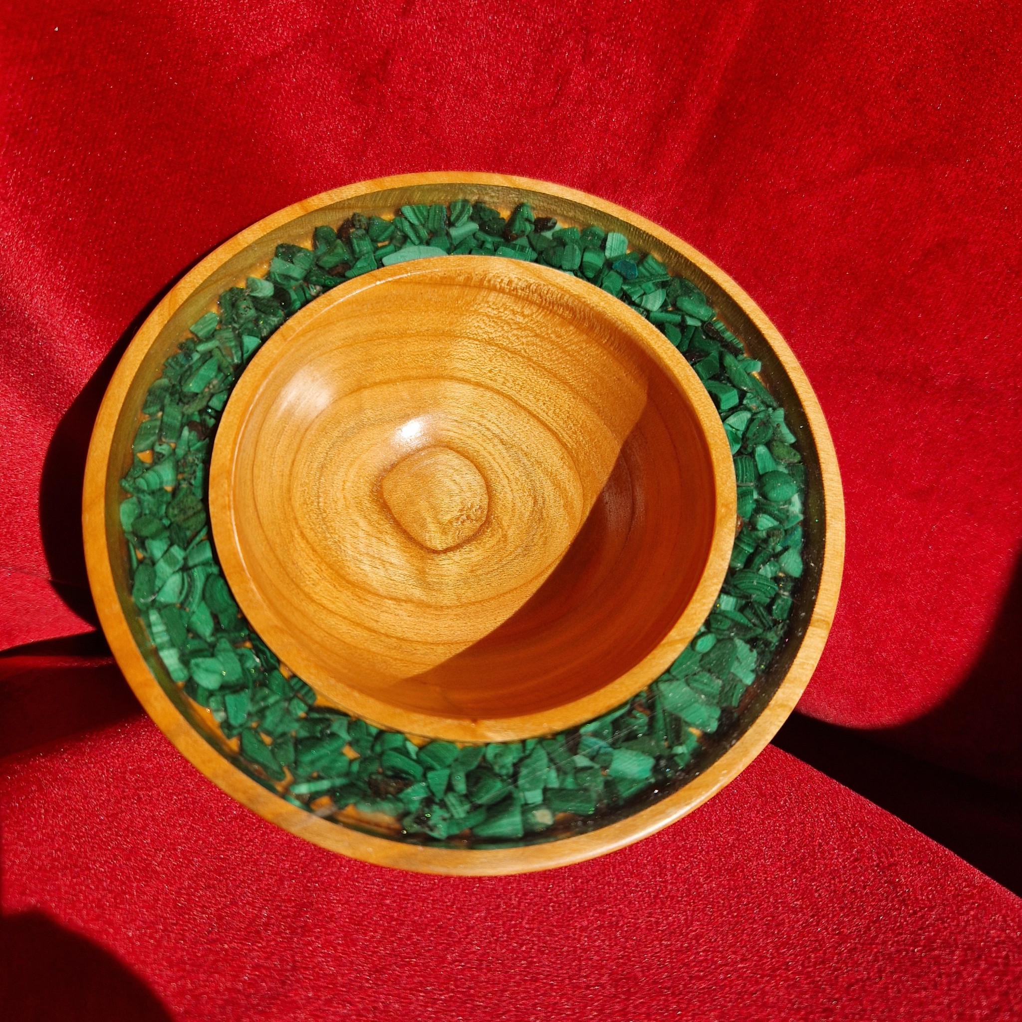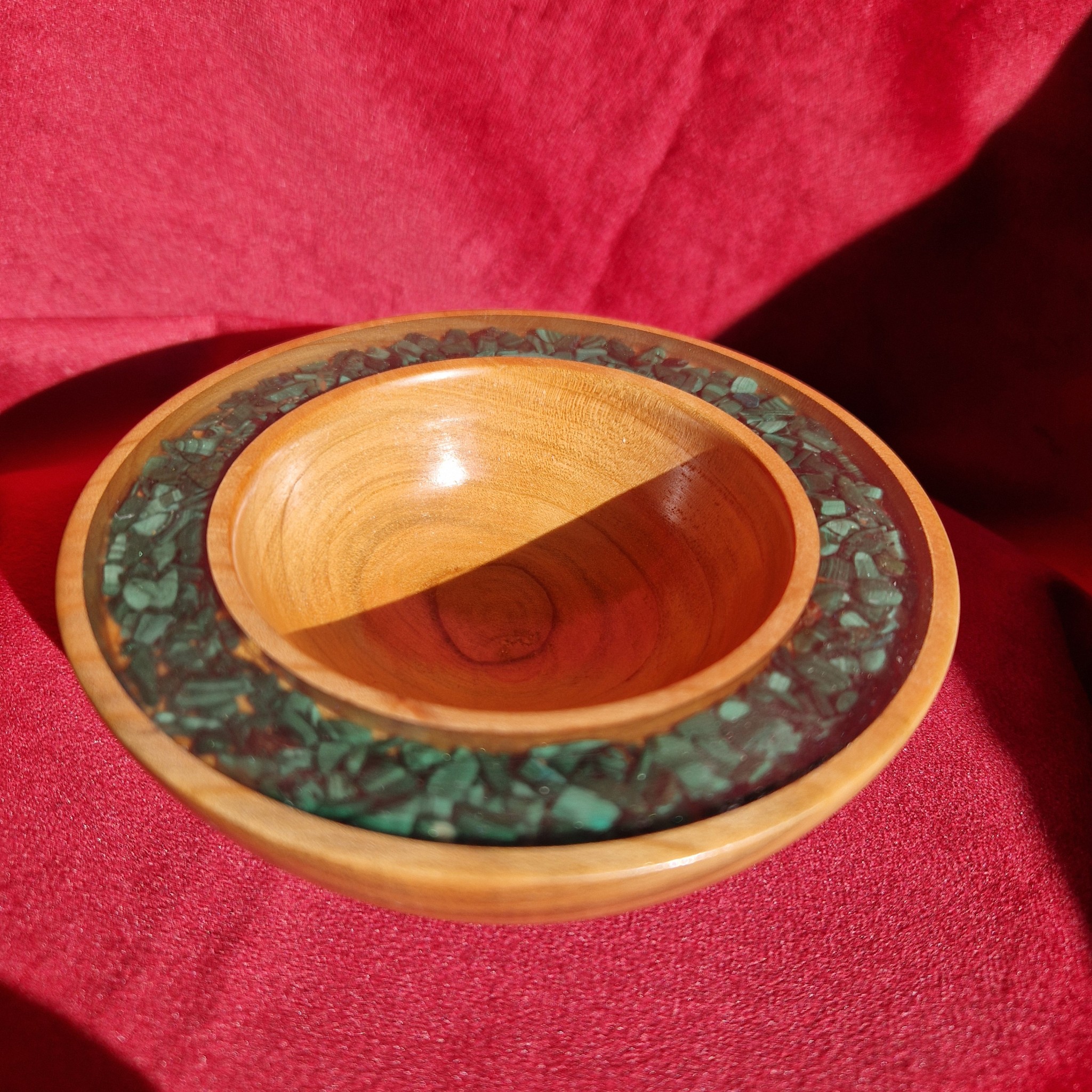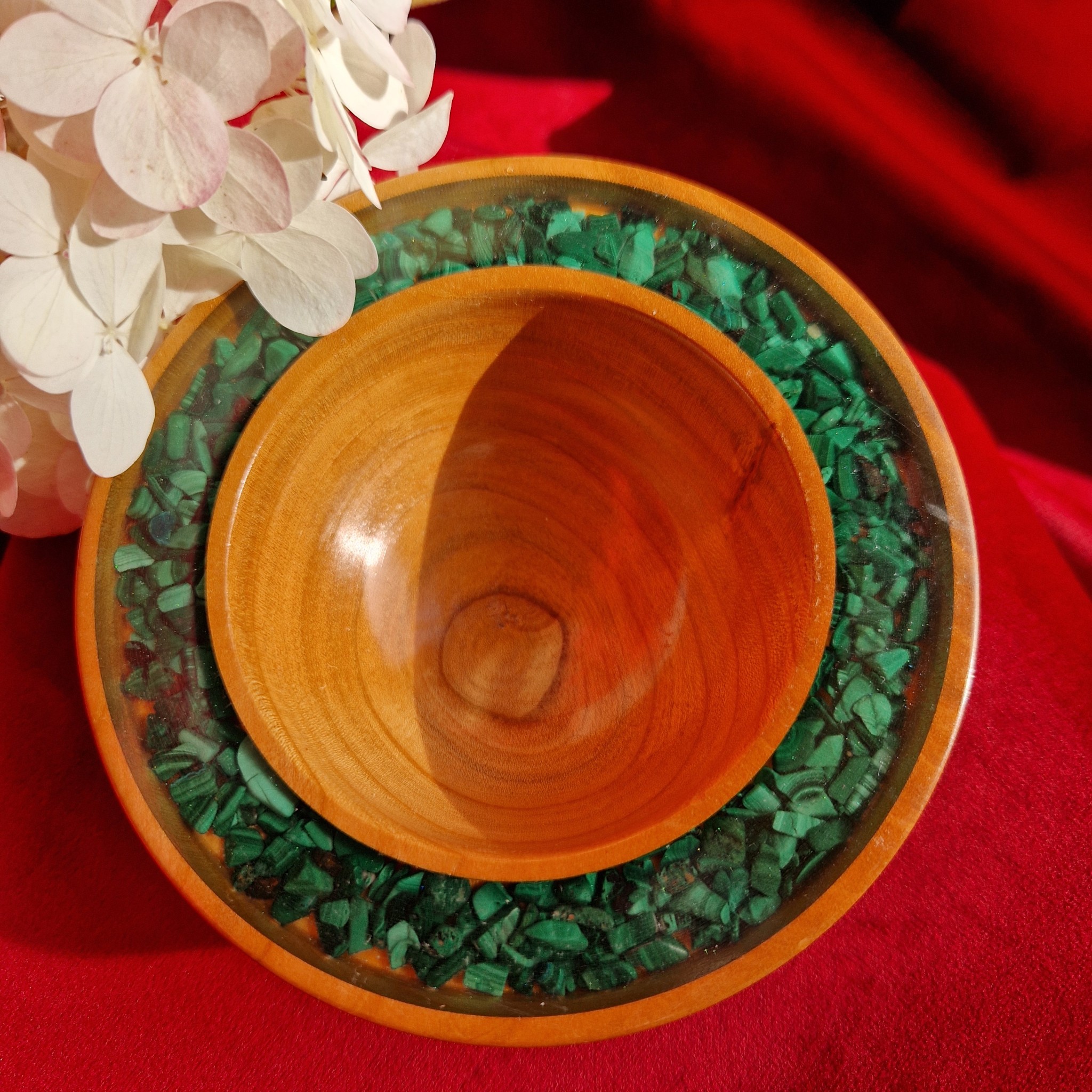 Warm, richly toned Cherry Wood meets malachite in this piece, combining natural beauty with the energy of semi-precious stones. Malachite is often used in meditation and Feng Shui, believed to inspire personal growth, channel nature’s energy, and encourage positive change. A transparent epoxy rim inlaid with stones highlights both the wood and the treasures it holds.