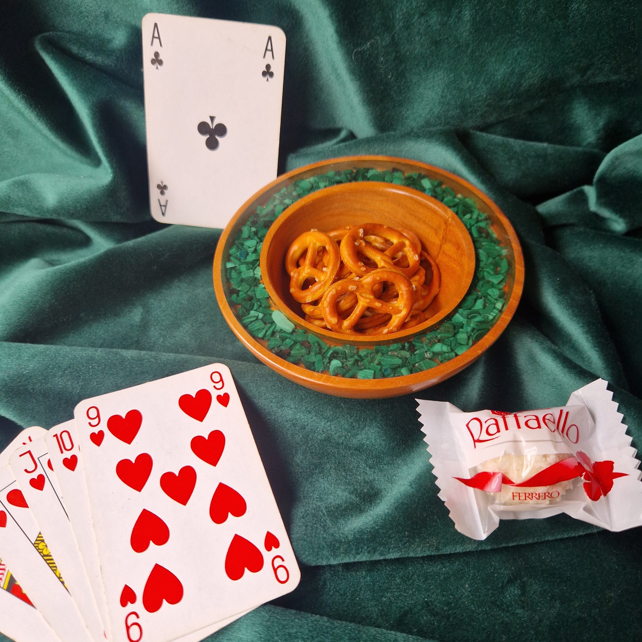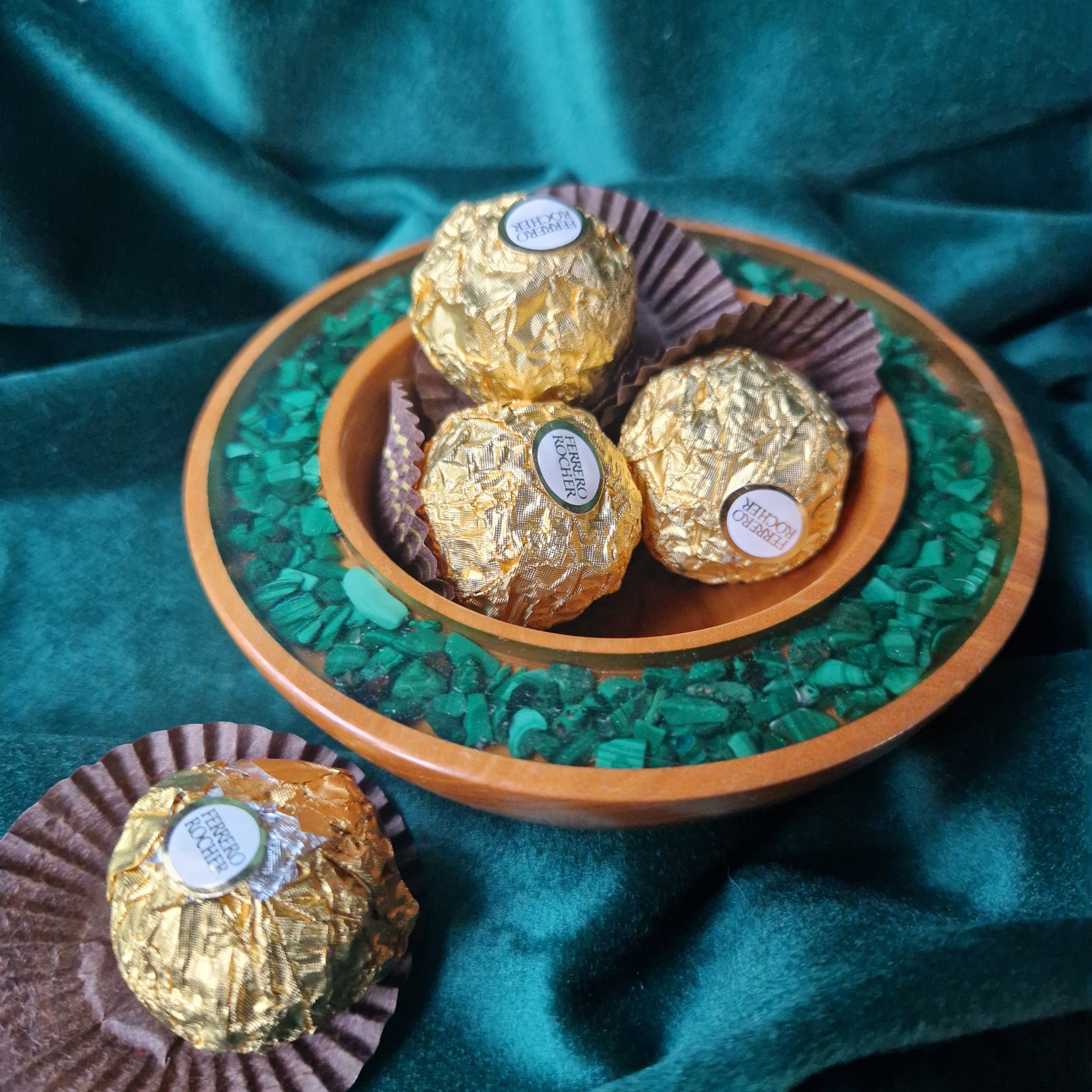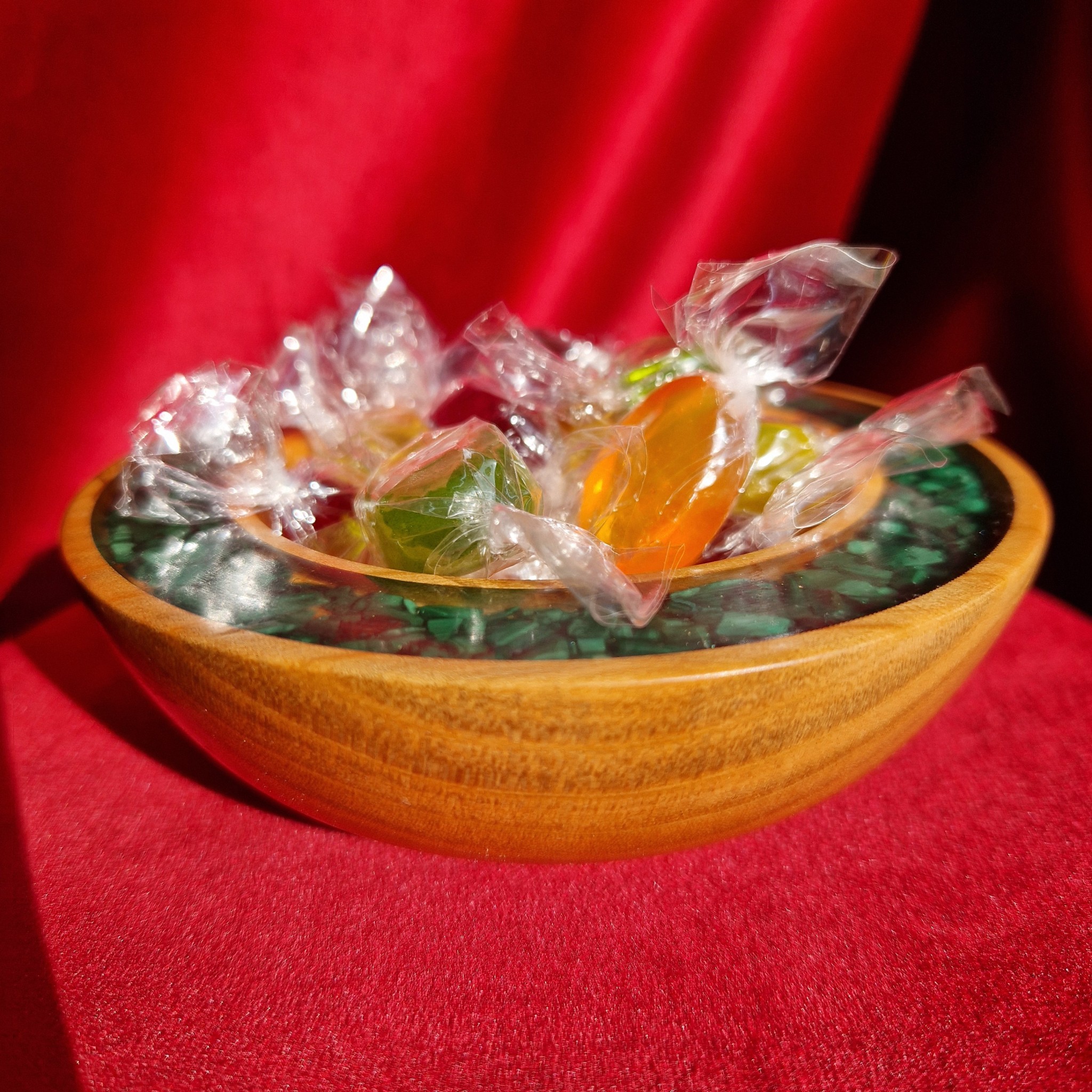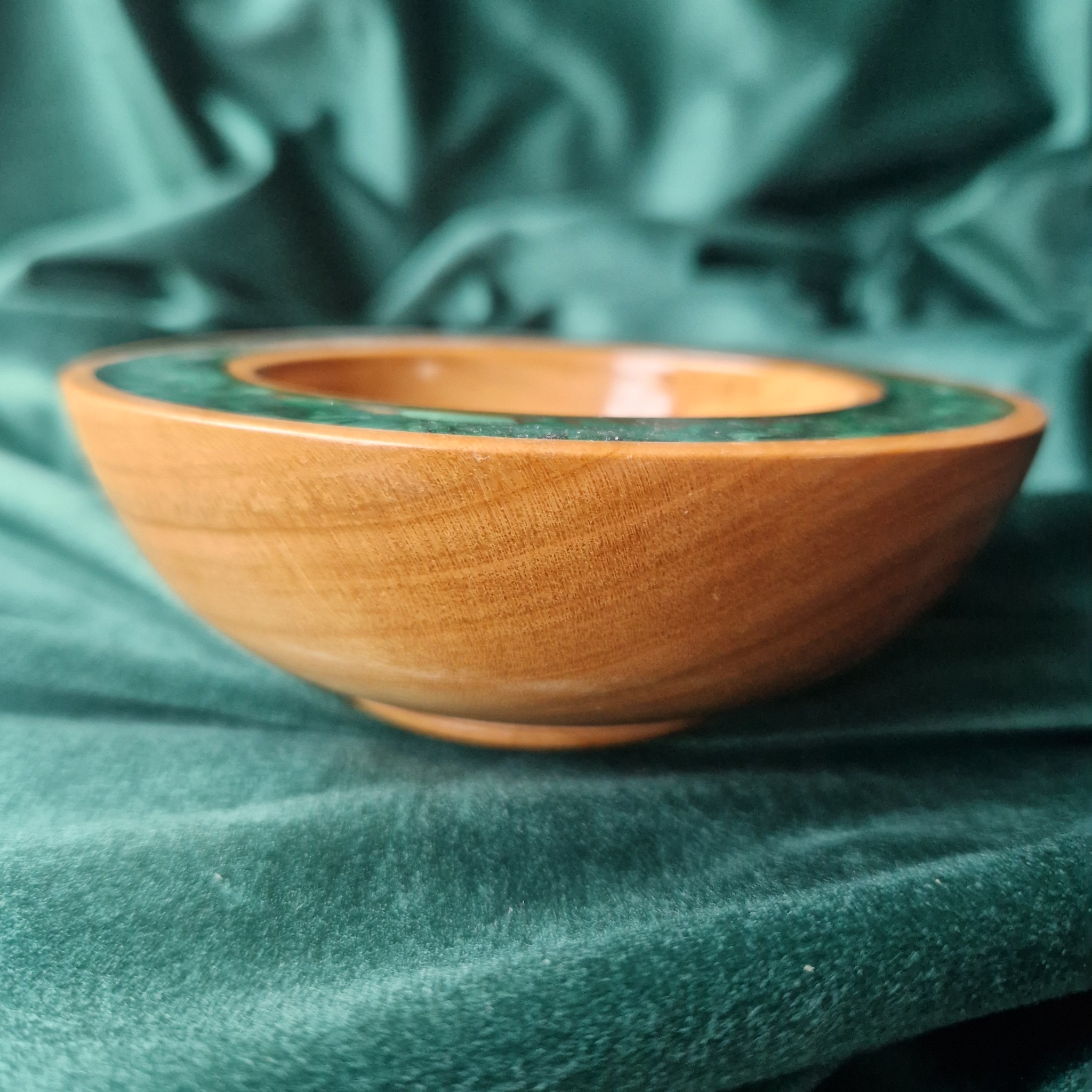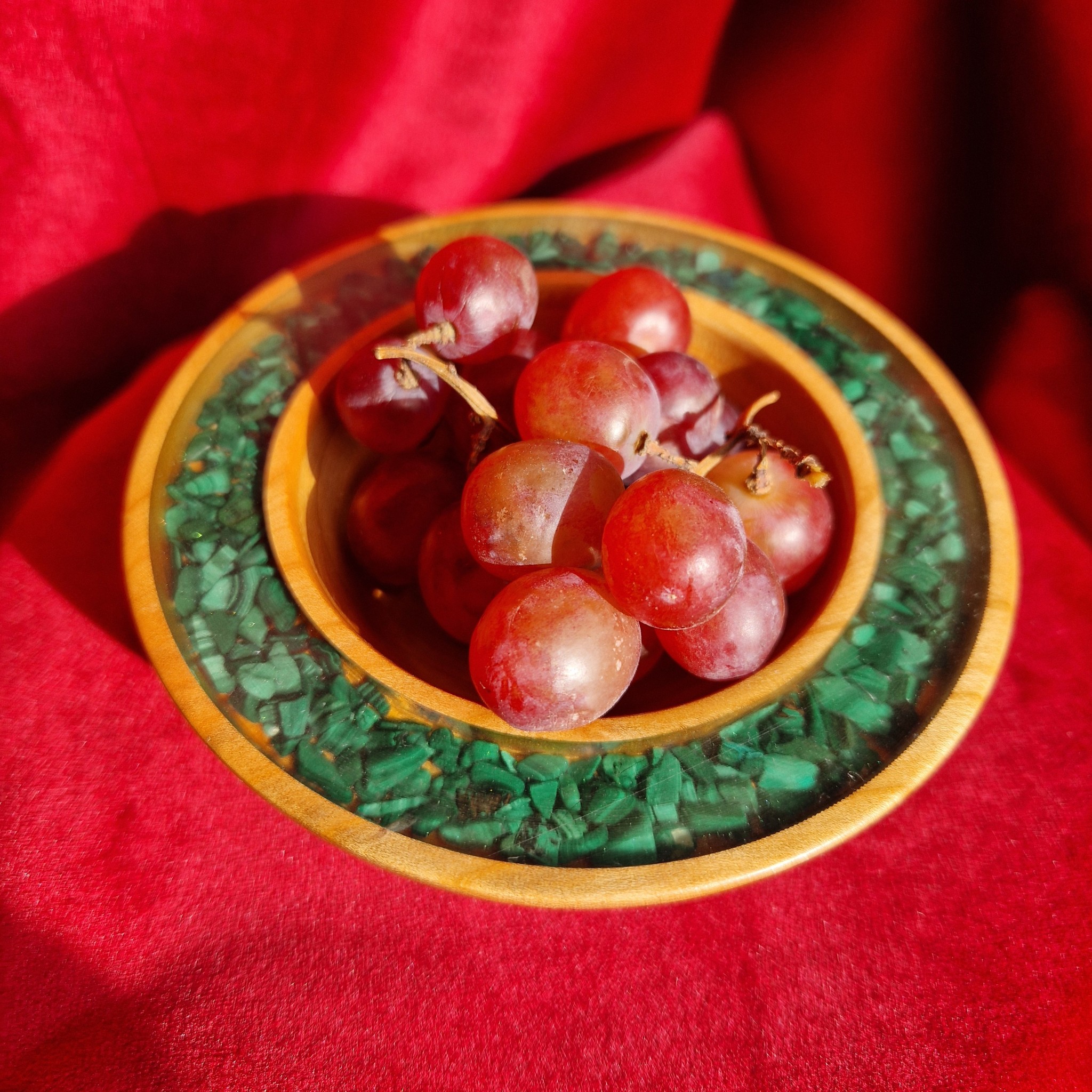 Warm, richly toned Cherry Wood meets malachite in this piece, combining natural beauty with the energy of semi-precious stones. Malachite is often used in meditation and Feng Shui, believed to inspire personal growth, channel nature’s energy, and encourage positive change. A transparent epoxy rim inlaid with stones highlights both the wood and the treasures it holds.