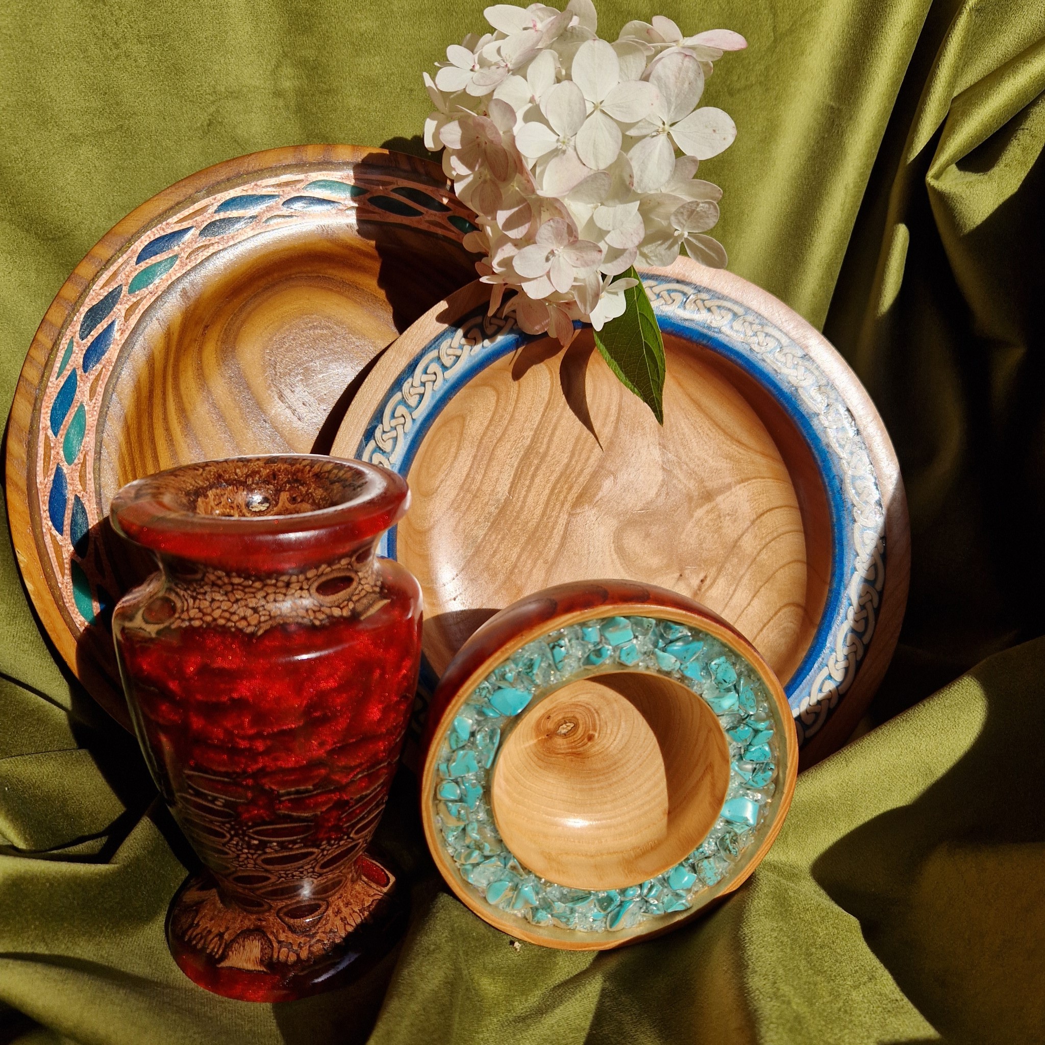 The dyed cherry wood contrasts beautifully with Turquoise Howlite in this piece, a stone known for its calming, soothing energy. It reminds us of how Hitchcock described Grace Kelly as “fire under ice”. Howlite is believed to promote restful sleep and a peaceful mind, while scattered quartz adds clarity and sparkle. (Fun fact: most “turquoise” seen today is actually Howlite.)