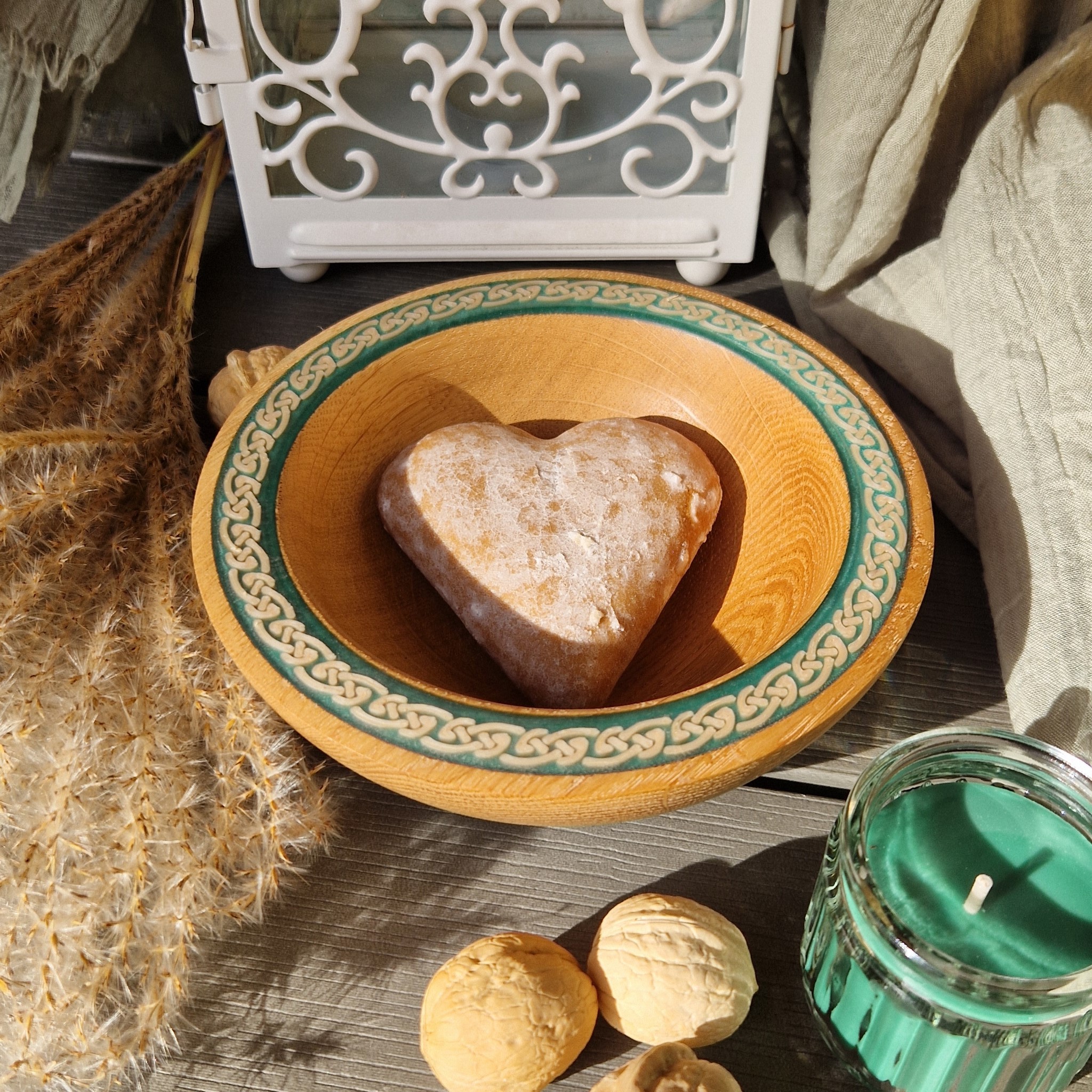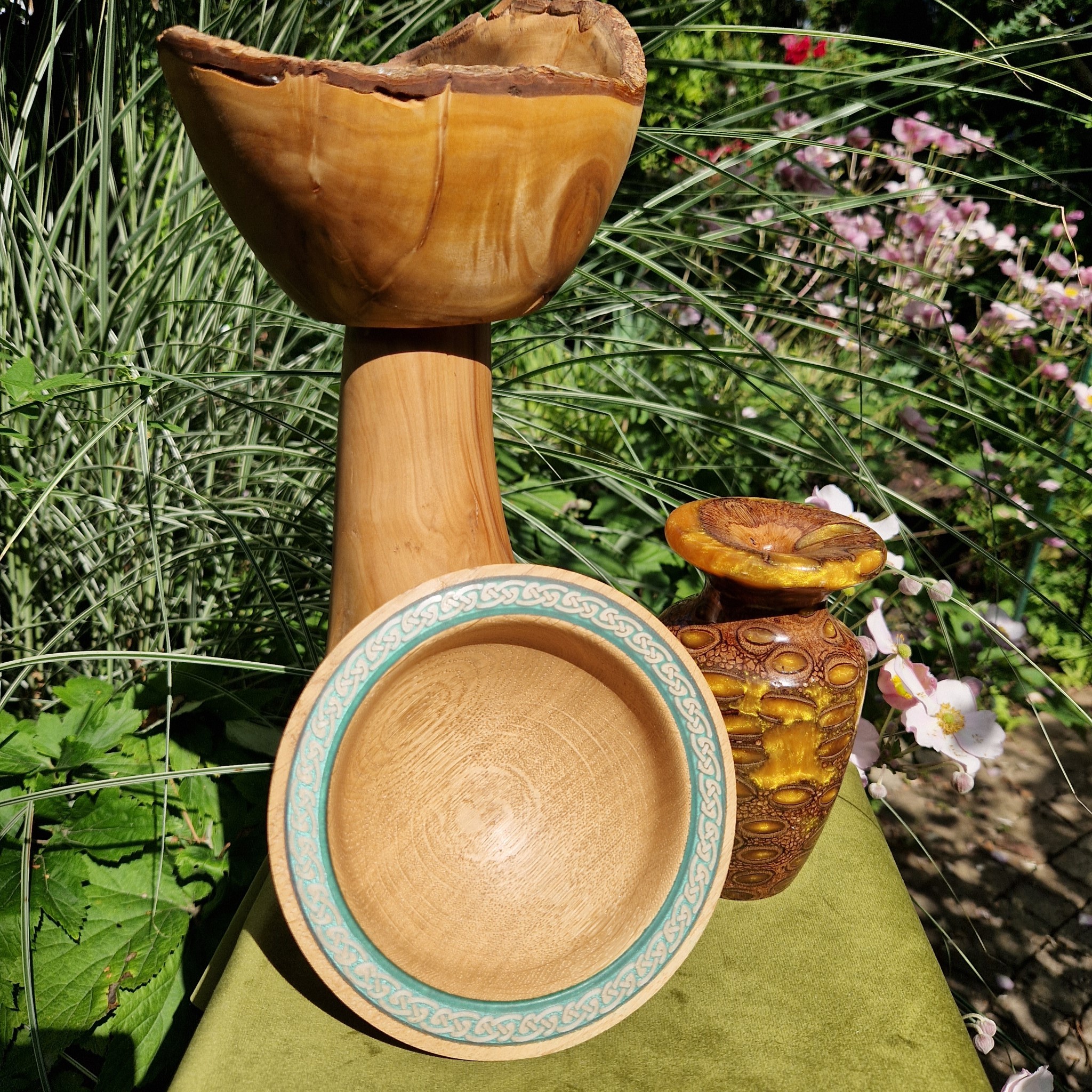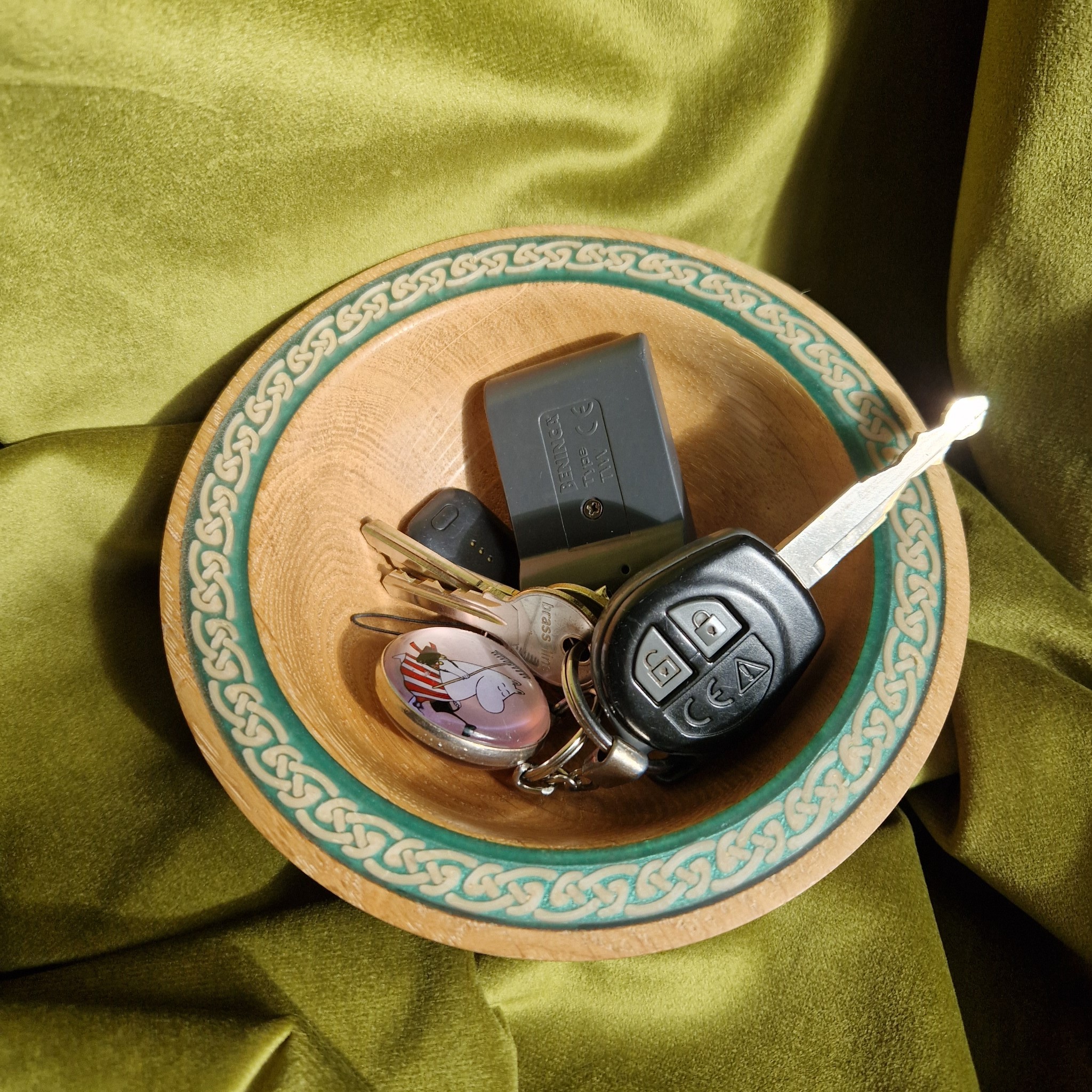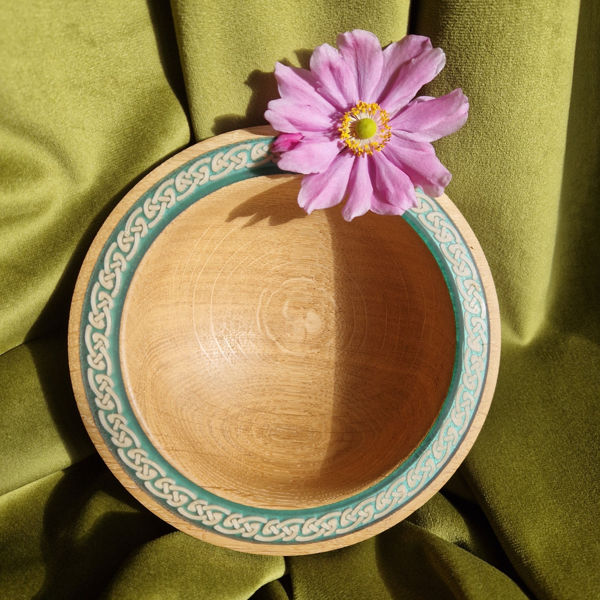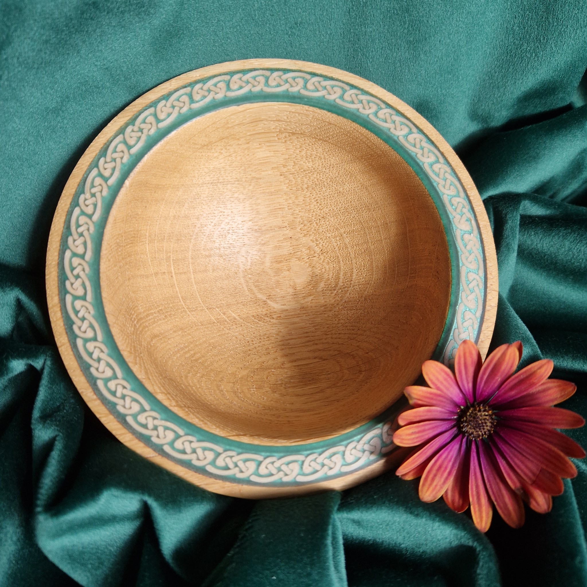 A bare Oak bowl with Celtic decoration and a green-blue rim. For olives, nuts, or chocolates—simple, tactile, quietly elegant.