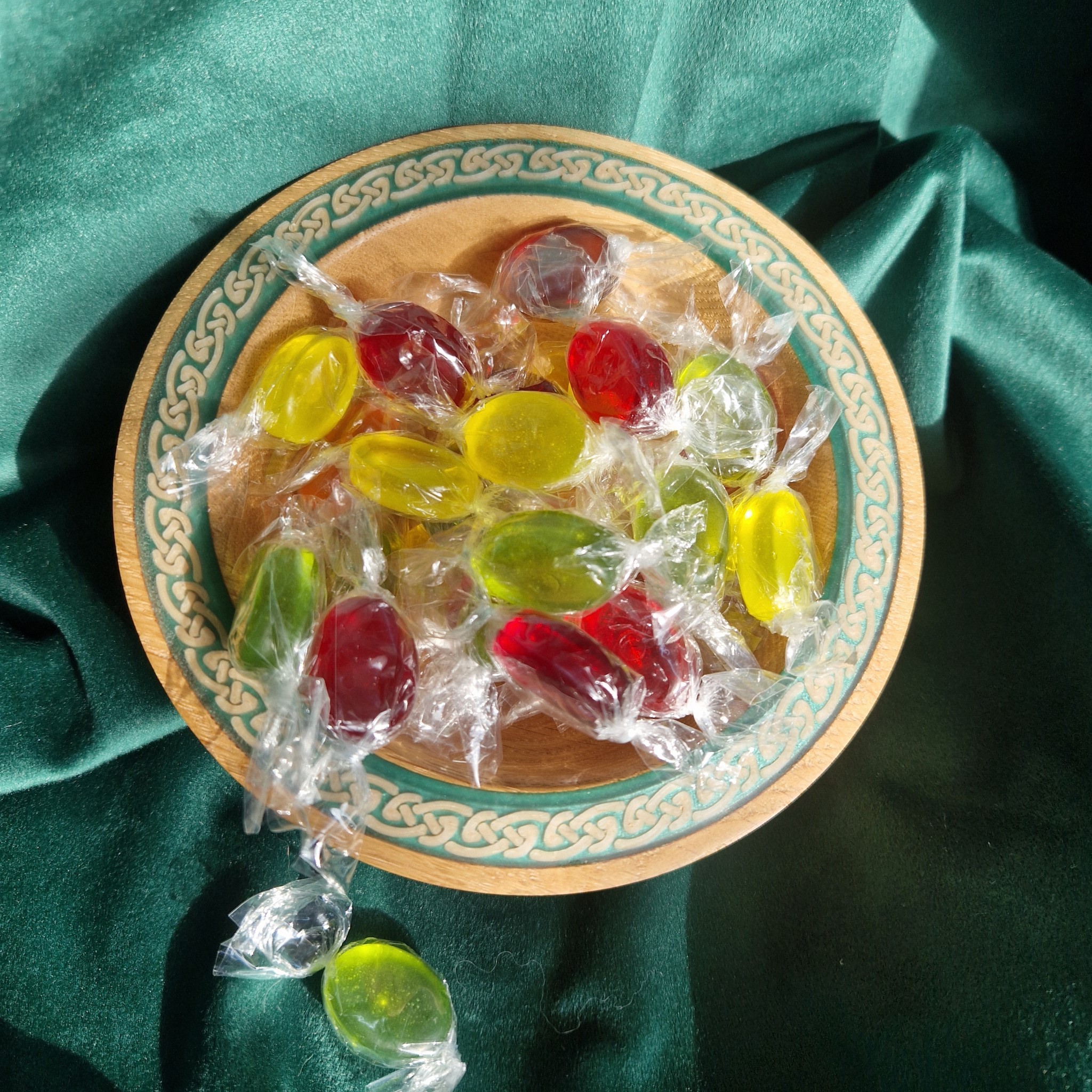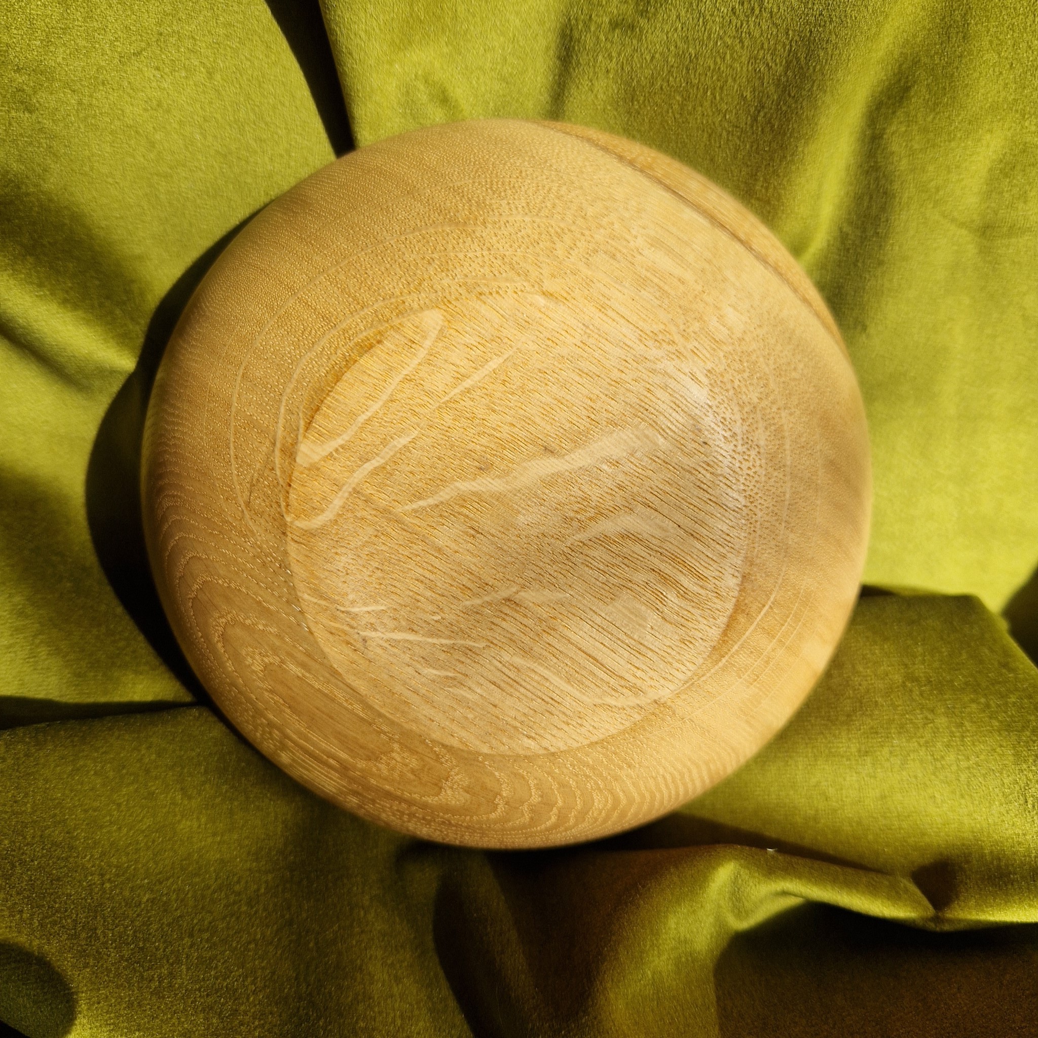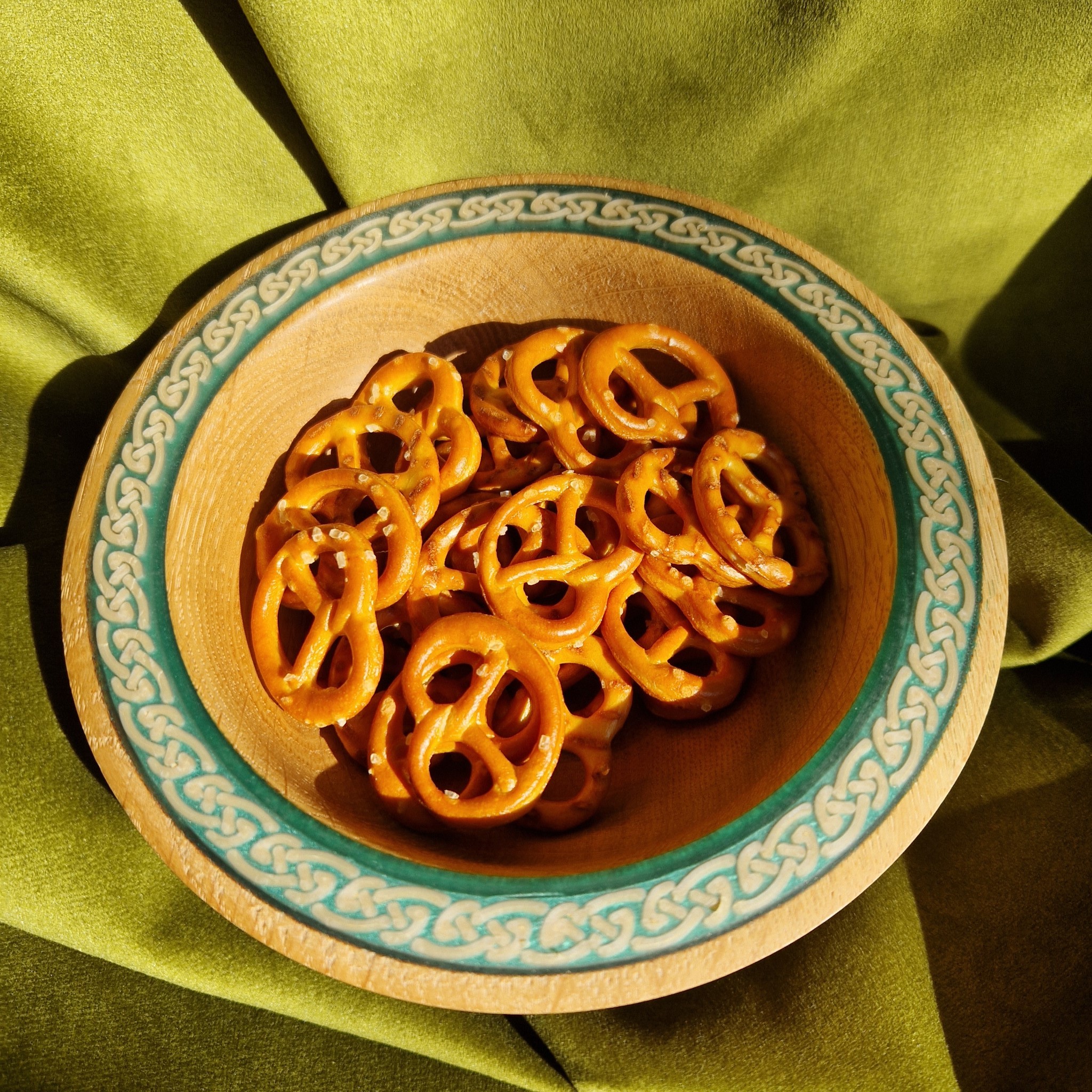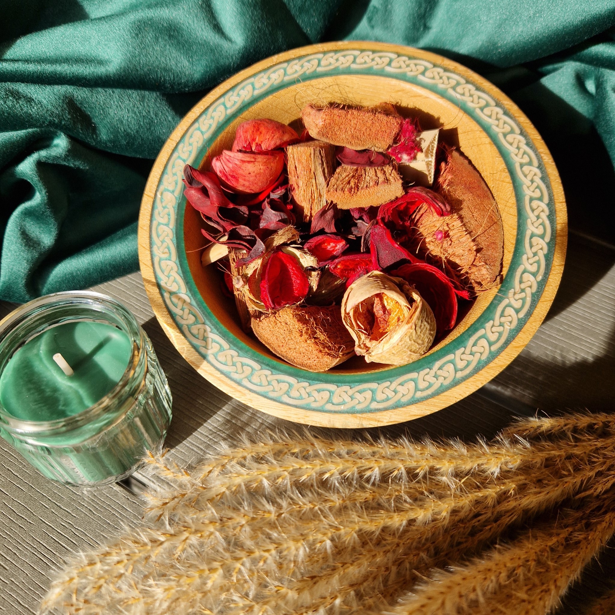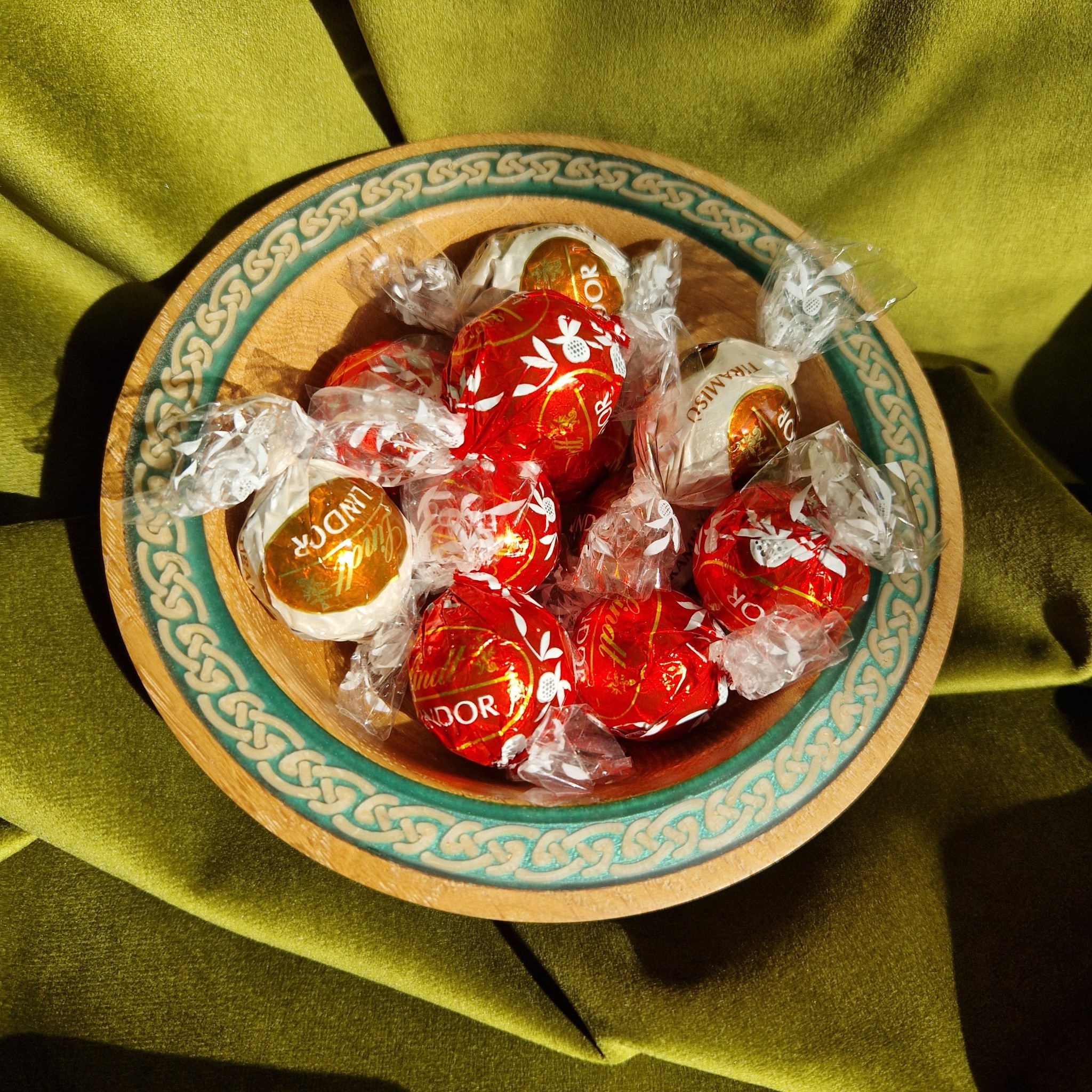 A bare Oak bowl with Celtic decoration and a green-blue rim. For olives, nuts, or chocolates—simple, tactile, quietly elegant.