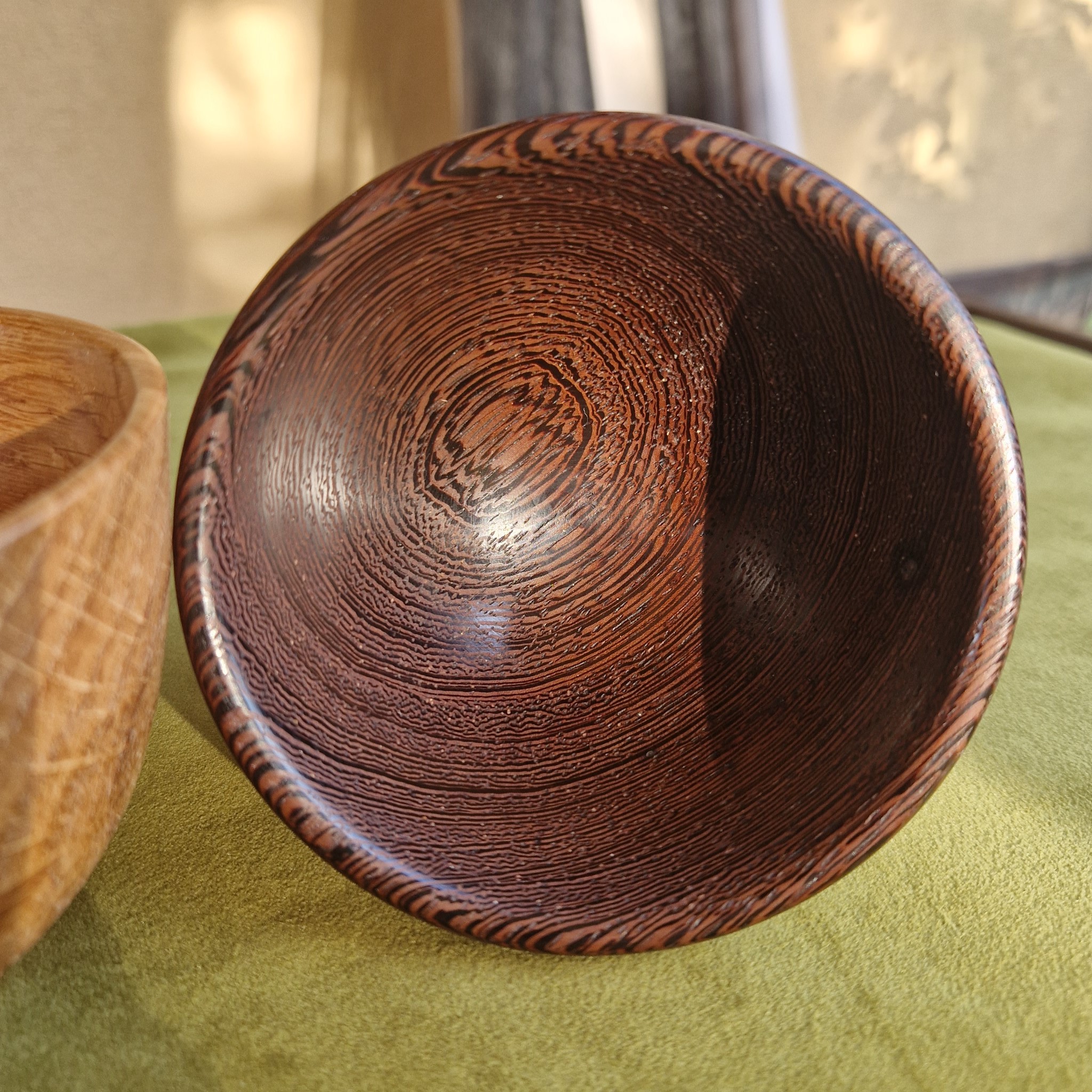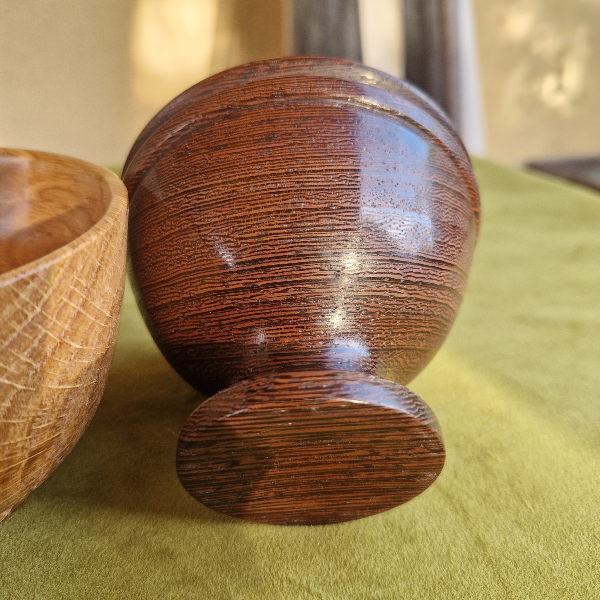 This small dark American Walnut bowl is a cross between a goblet and a bowl. The quirky shape is perfect for nuts and small snacks and you can hold it as you would a glass or goblet. A decorated rim complements the shape and the dark wood feels rich and exclusive. We have used our all natural, food safe finish on this piece and so we suggest after washing and drying that you add a few drops of oil and rub them into the surface.