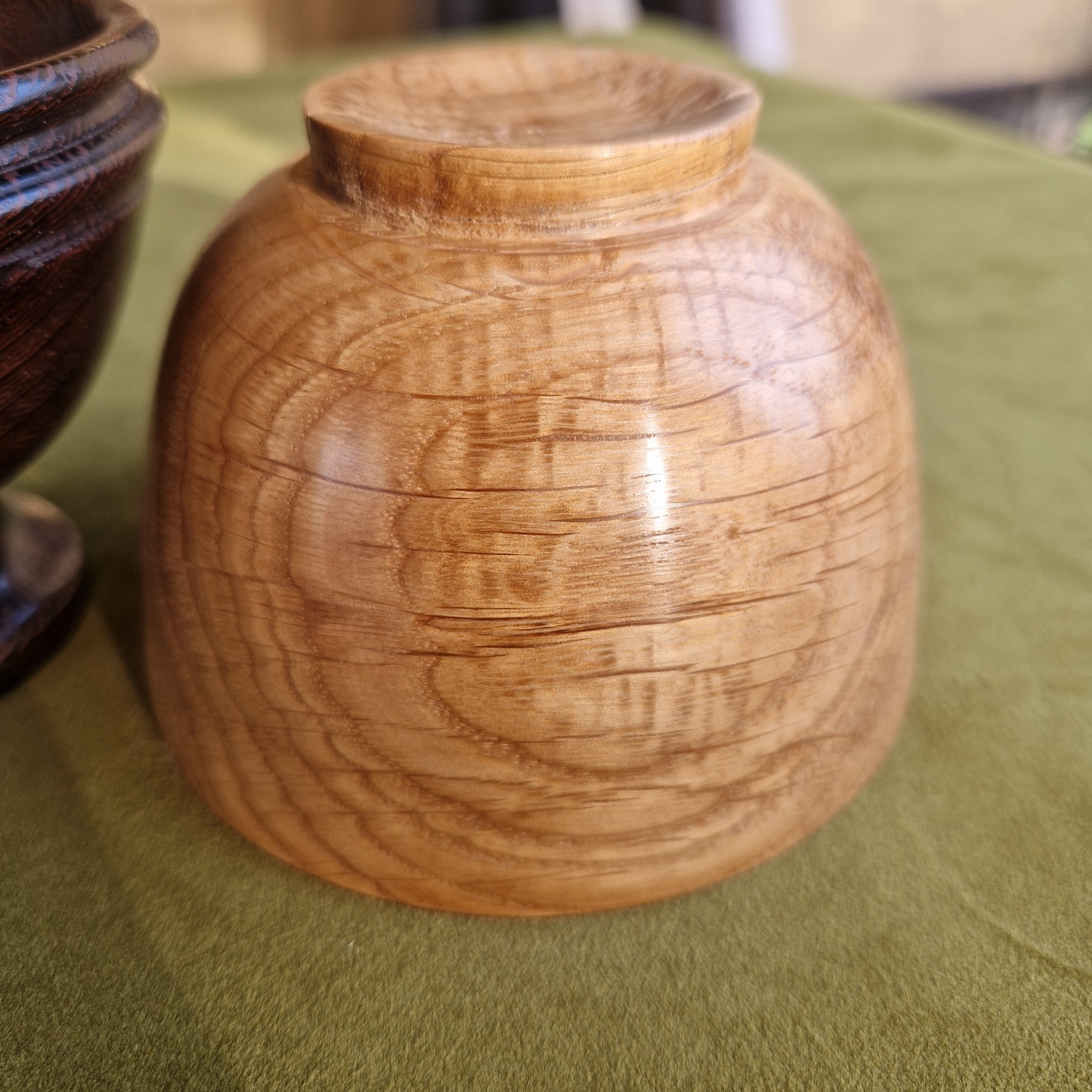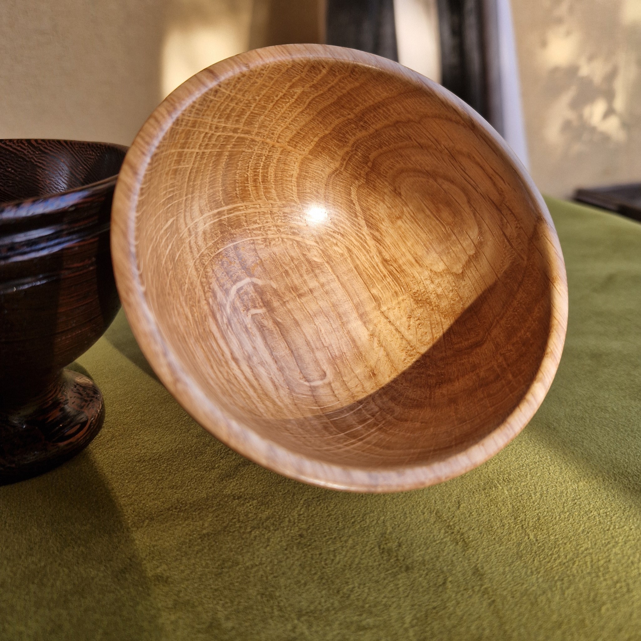 This is a small bowl for nuts or trinkets made from oak. It has a small foot at the base to give it a light look despite the dark, rich oak colour and would fit well in any cottage or cosy home. Perfect for snacking hobbits! Finished with oil and shellac, wash in warm water, dry and apply any oil for years of use. This bowl is finished to a high standard with a silky smooth interior surface.