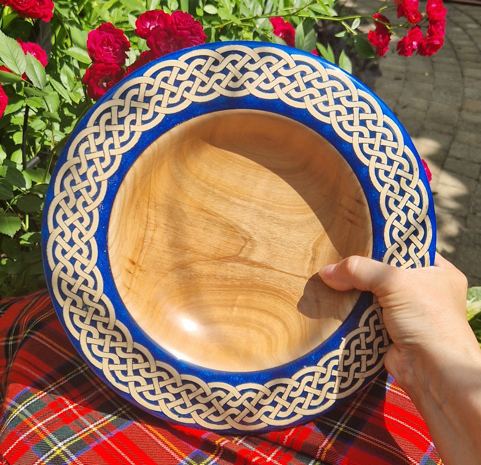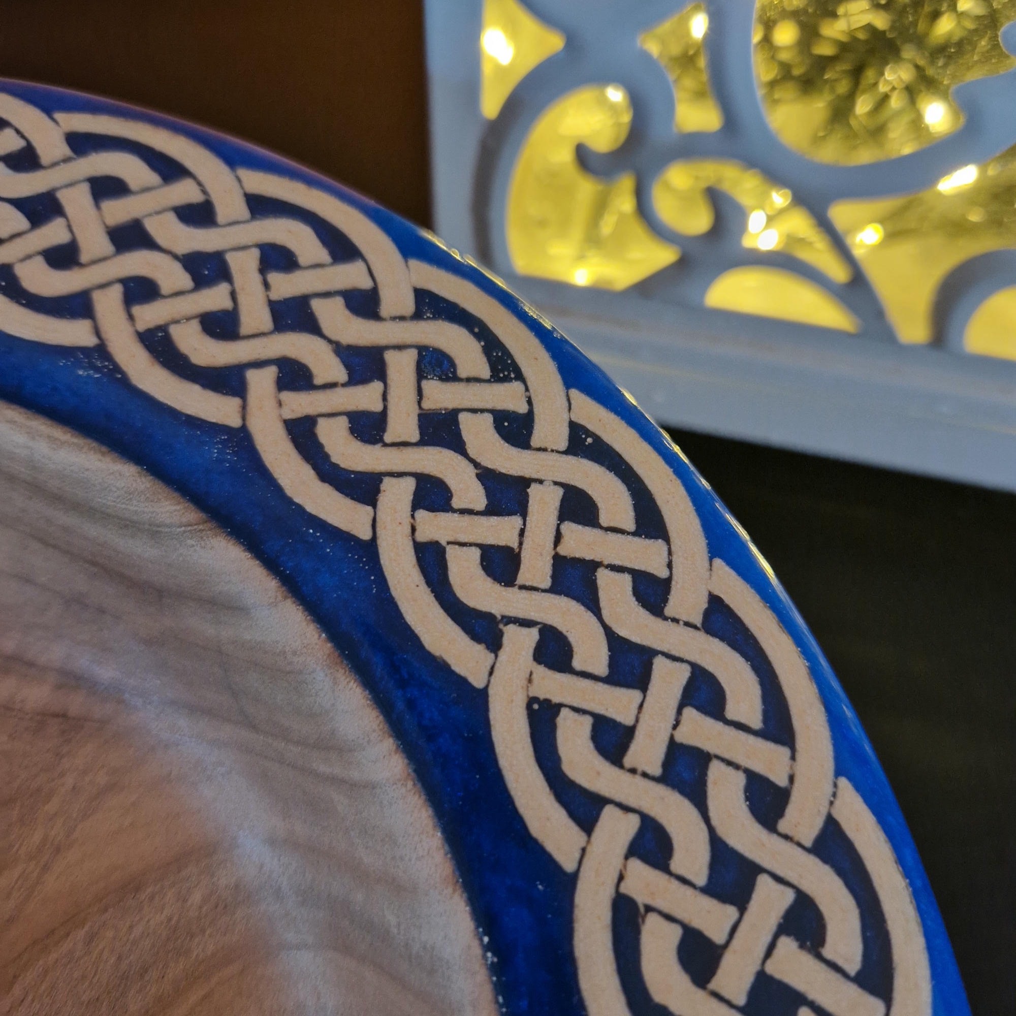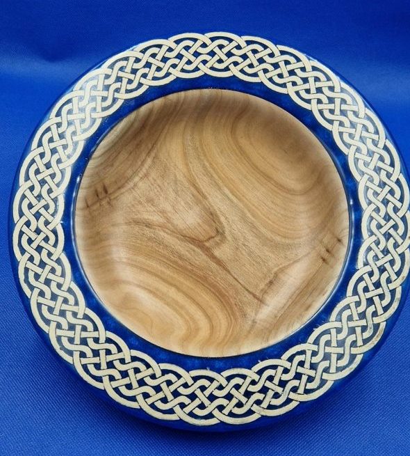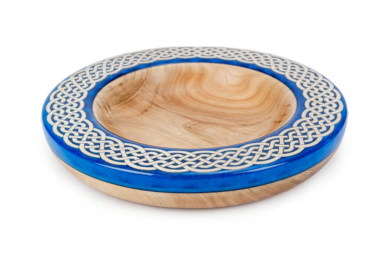 Ta duża, ciężka, celtycka misa z drewna i żywicy epoksydowej łączy w sobie elegancję, kunszt i ponadczasowy design. Wykonana ręcznie na tokarce z bogato usłojonego drewna wiązu, jest solidna w dłoni i imponująca na stole. misterny wzór celtycki okalający naczynie jest zanurzony w niebieskiej żywicy epoksydowej, która pod każdym kątem – z góry, z boku, a nawet od spodu sprawia wrażenie trójwymiarowej.