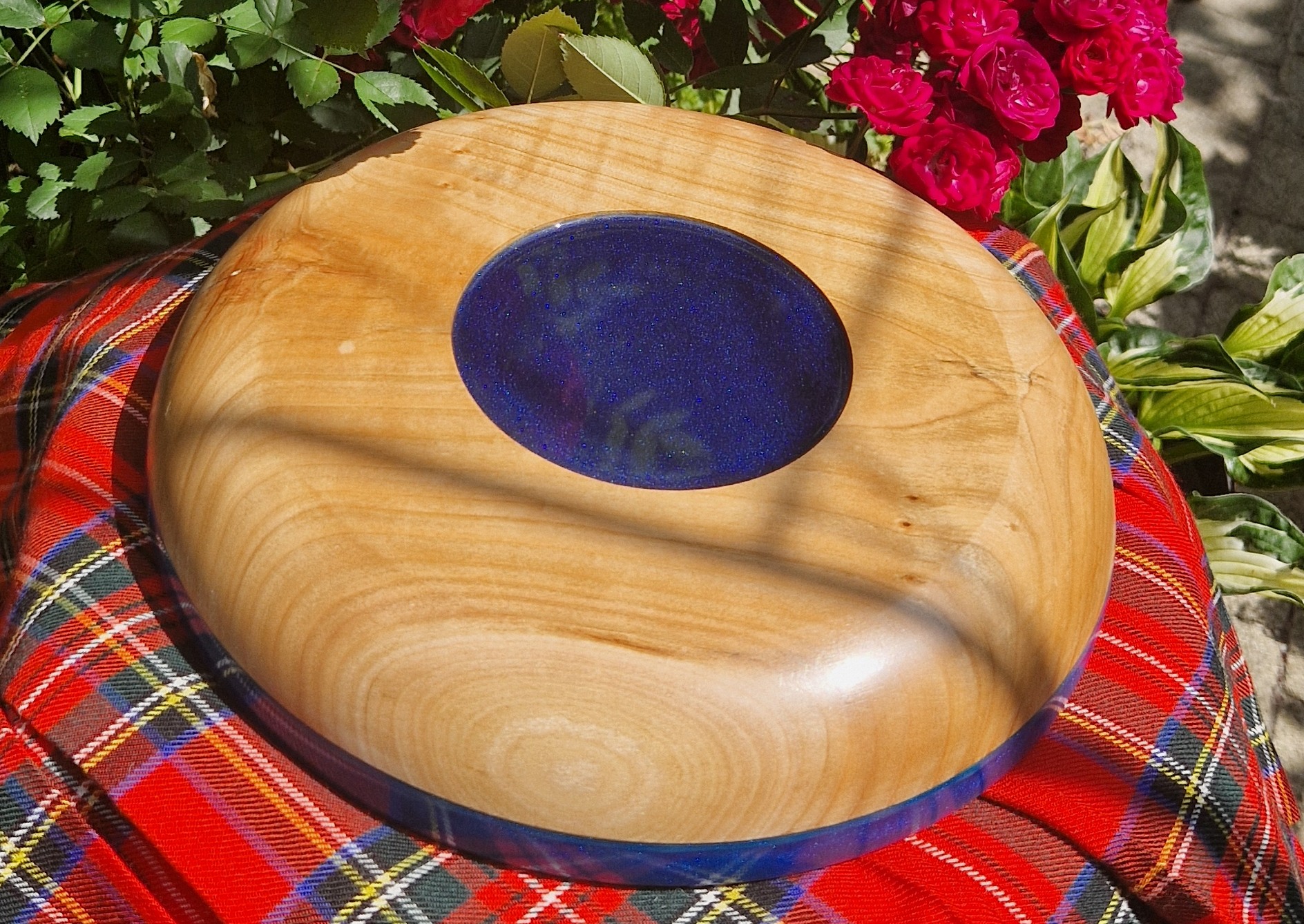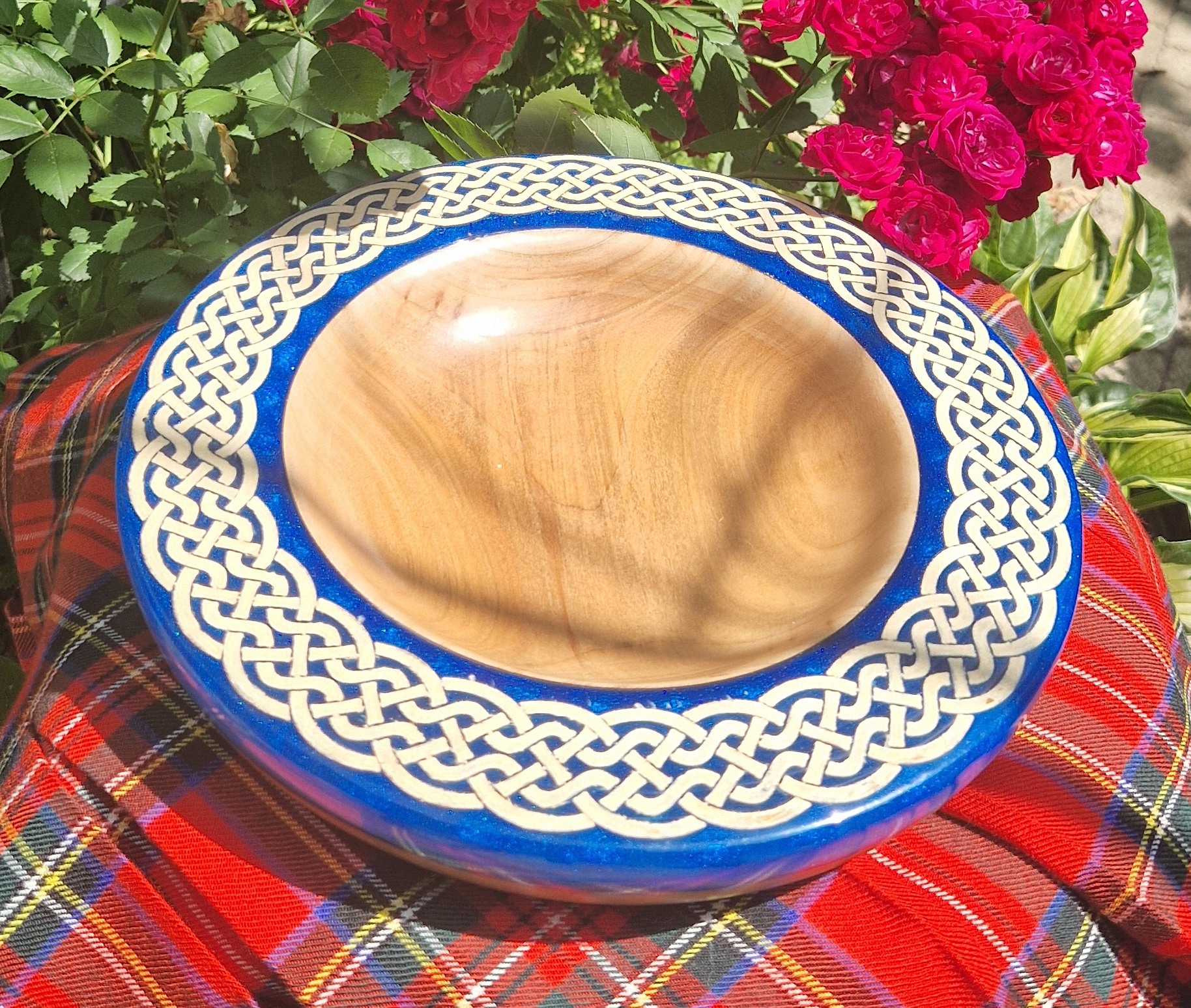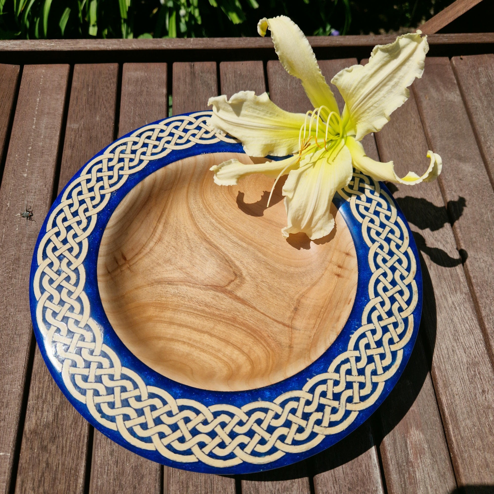 Ta duża, ciężka, celtycka misa z drewna i żywicy epoksydowej łączy w sobie elegancję, kunszt i ponadczasowy design. Wykonana ręcznie na tokarce z bogato usłojonego drewna wiązu, jest solidna w dłoni i imponująca na stole. misterny wzór celtycki okalający naczynie jest zanurzony w niebieskiej żywicy epoksydowej, która pod każdym kątem – z góry, z boku, a nawet od spodu sprawia wrażenie trójwymiarowej.