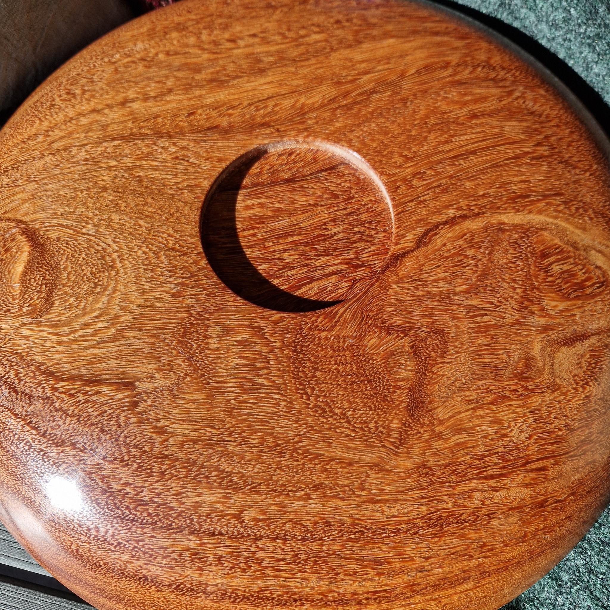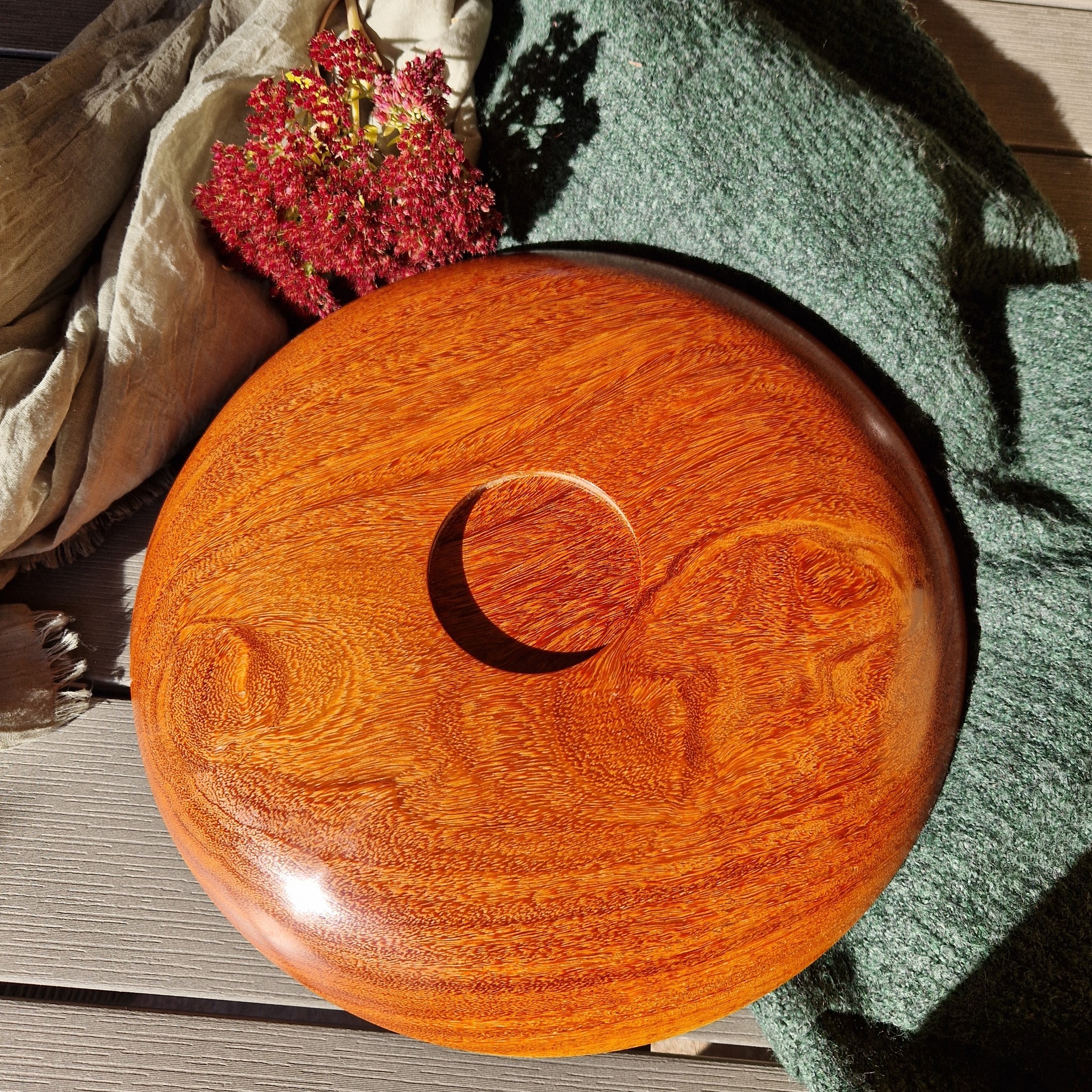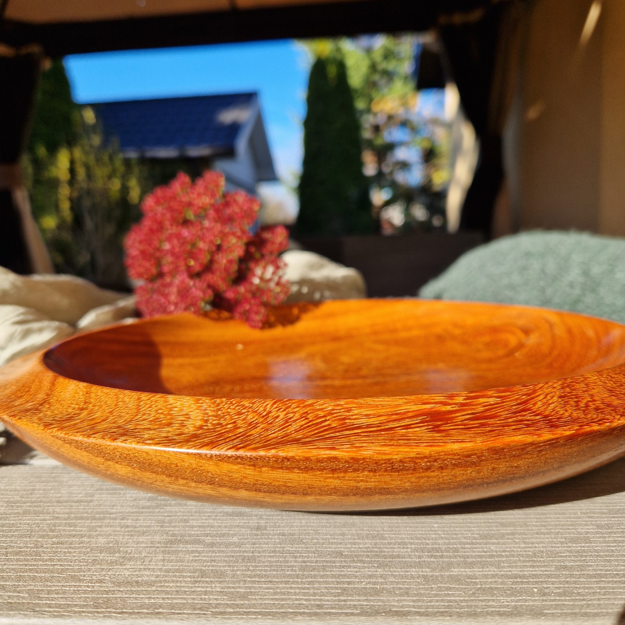 Ta ciężka patera z brazylijskiego drewna cumaru idealnie nadaje się do podawania potraw podczas bufetu lub będzie stanowić mocny akcent na środku stołu. Wzór słojów przypomina futro egzotycznego zwierzęcia. Talerz jest bardzo ciężki ponieważ cumaru to gęste, twarde i wytrzymałe drewno. Czerwono-brązowe, wirujące usłojenie mówi samo za siebie, dlatego ograniczyliśmy projekt do minimum, dodając jedynie lekko wklęsłą krawędź. Ten produkt charakteryzuje się prawdziwą prezencją i pomimo swojej prostoty wygląda na drogi i elegancki. Pod gładką powierzchnią nadal można wyczuć słoje drewna, co w dotyku jest bardzo satysfakcjonujące.