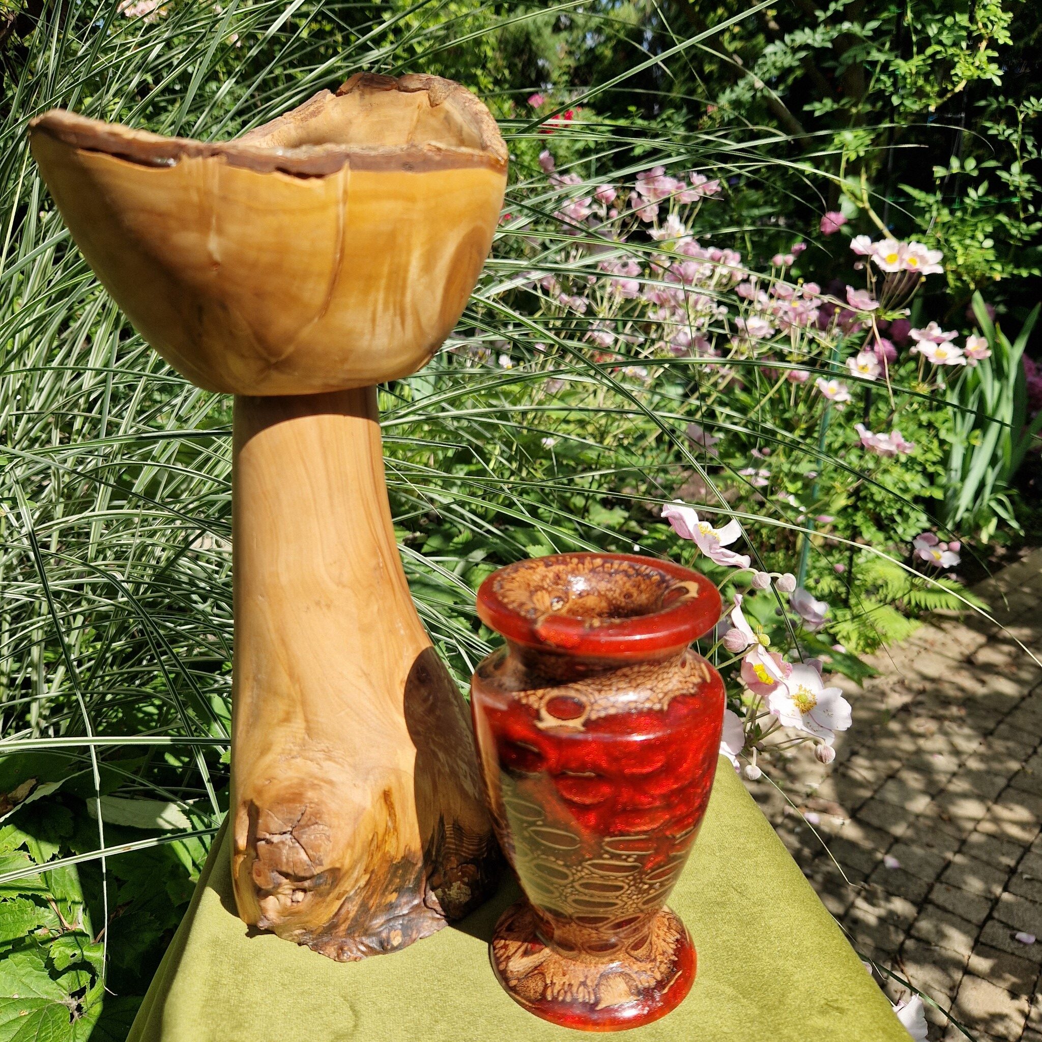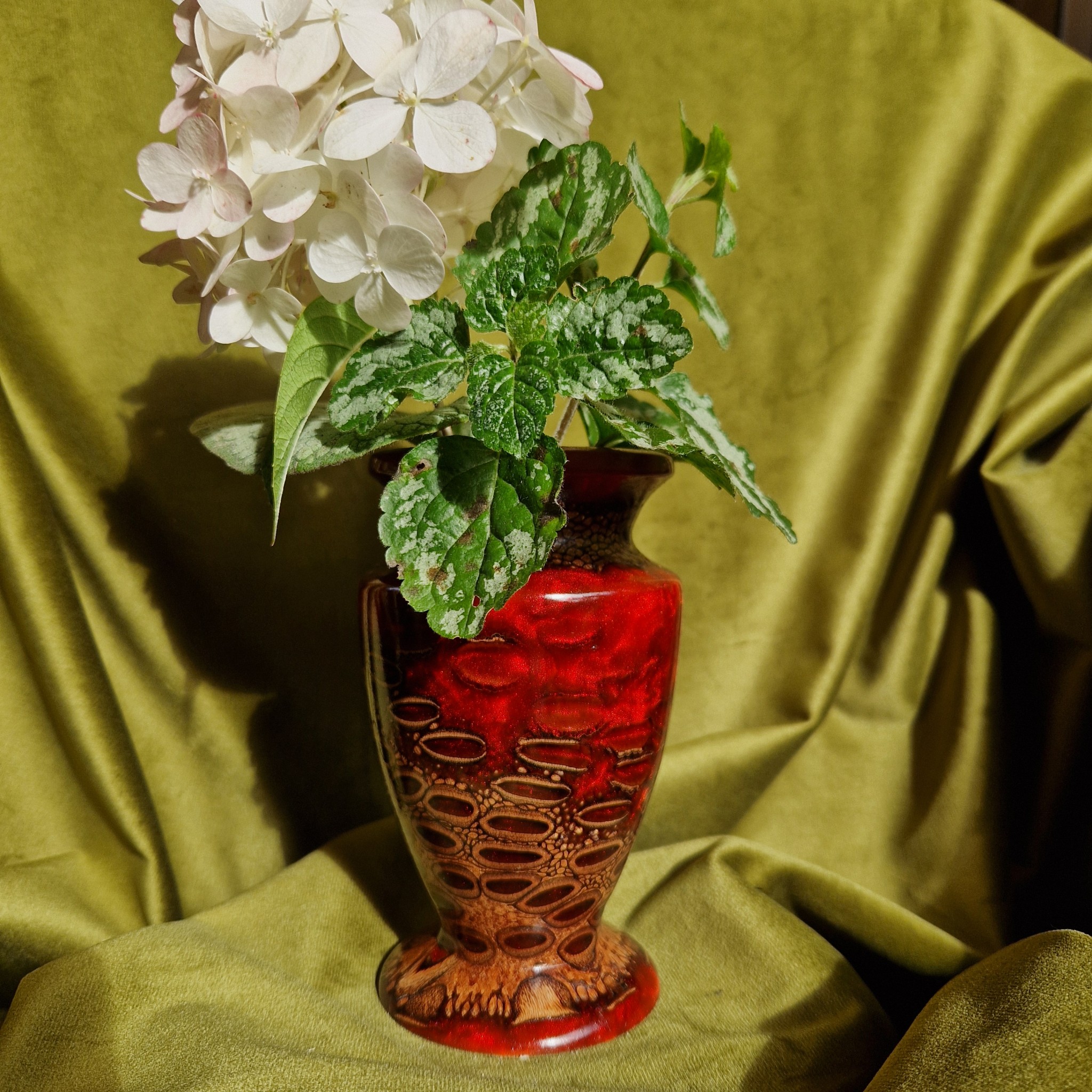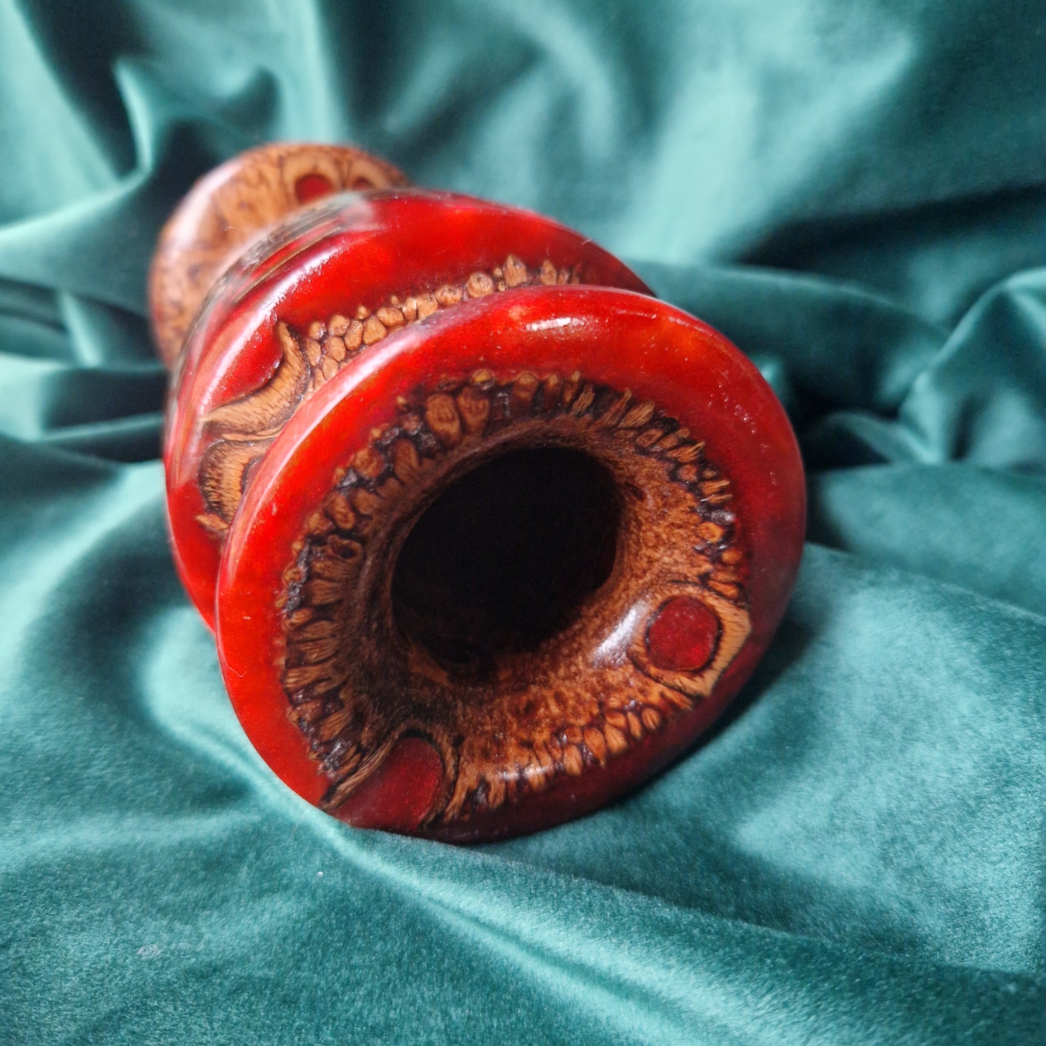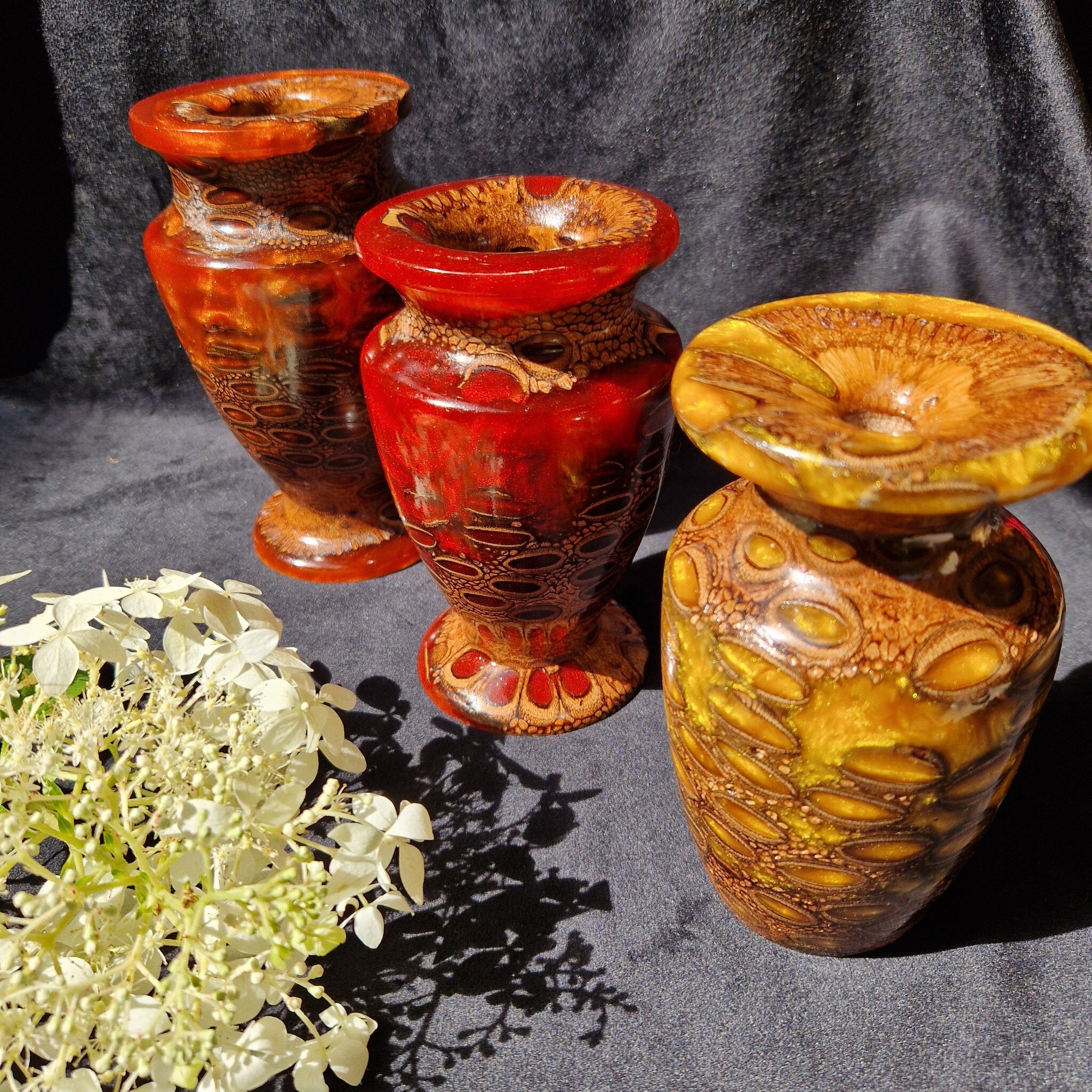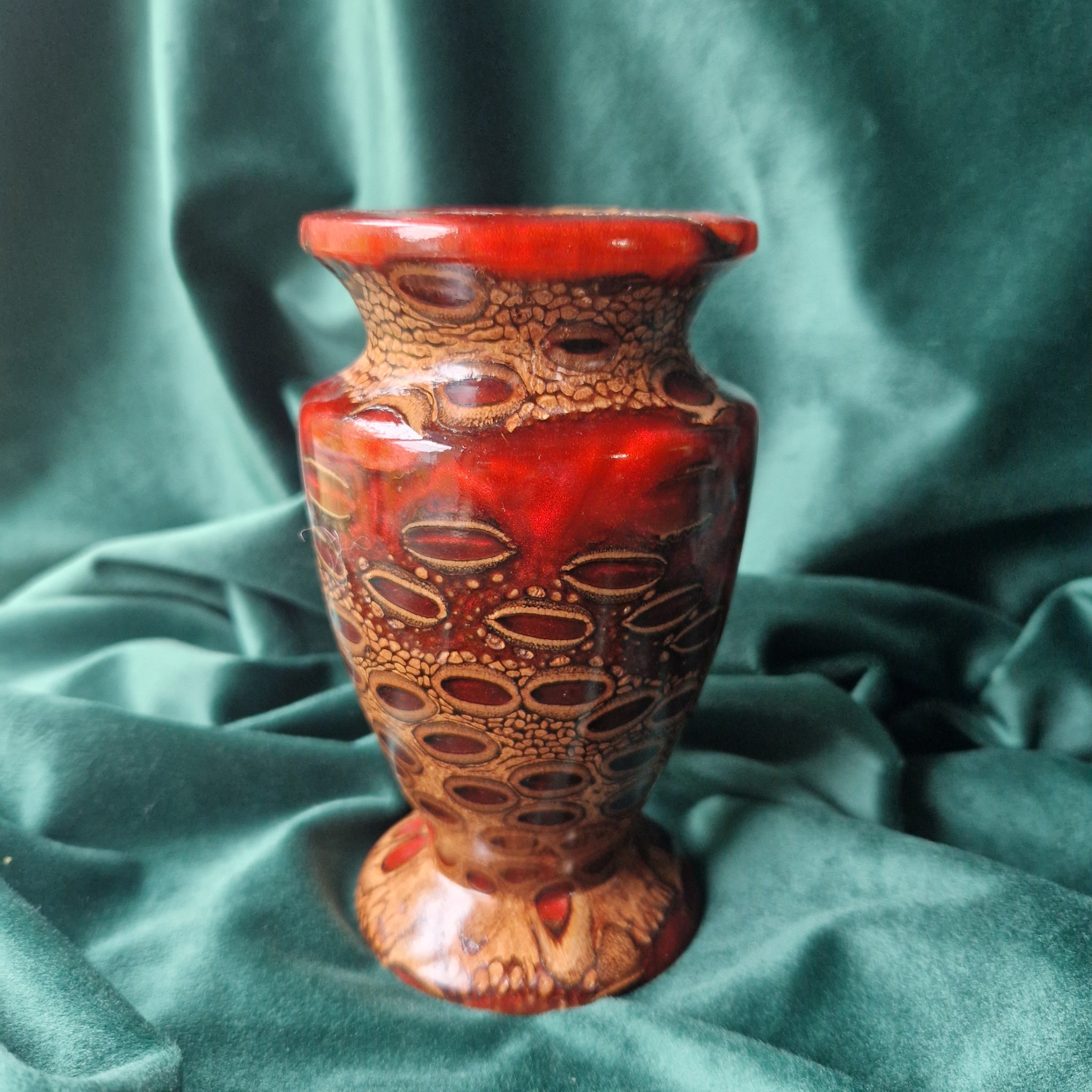 Mały wazon epoksydowy prezentuje naturalne piękno niezwykłego strąka nasiennego Banksia, zawieszonego w karminowej żywicy z wirującymi czarnymi akcentami. Skomplikowane, organiczne wzory tego australijskiego strąka tworzą hipnotyzujący efekt, dzięki czemu wazon jest odważnym i przyciągającym wzrok elementem centralnym.