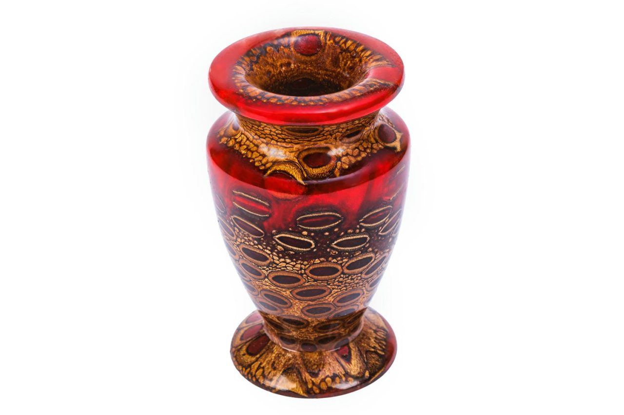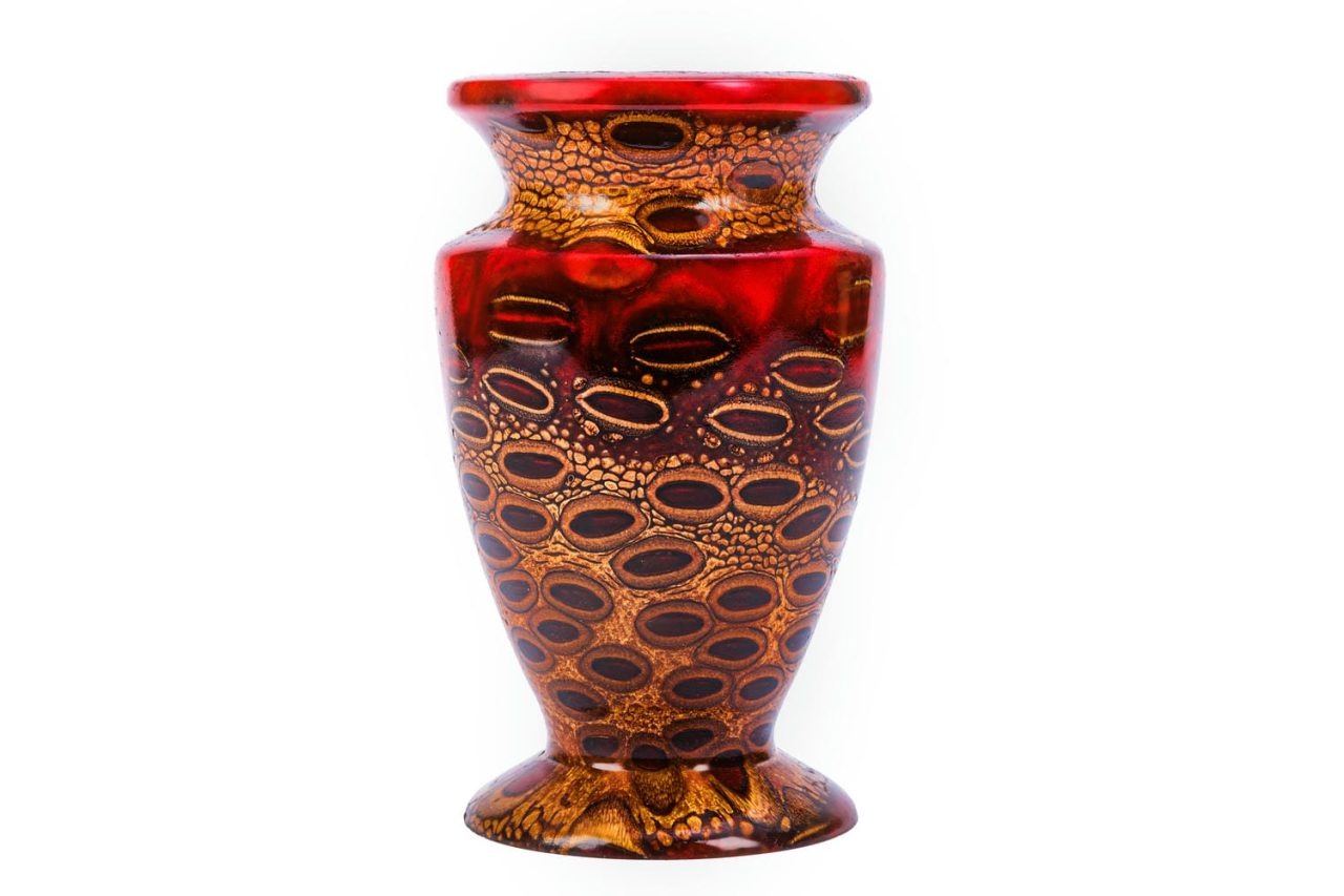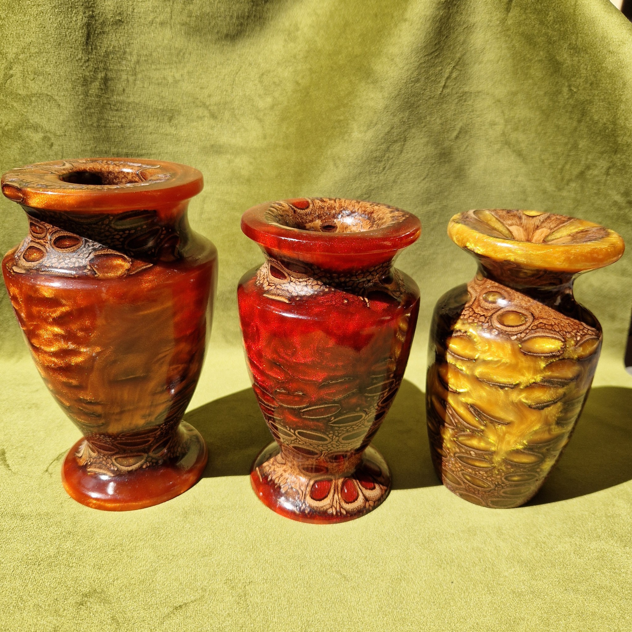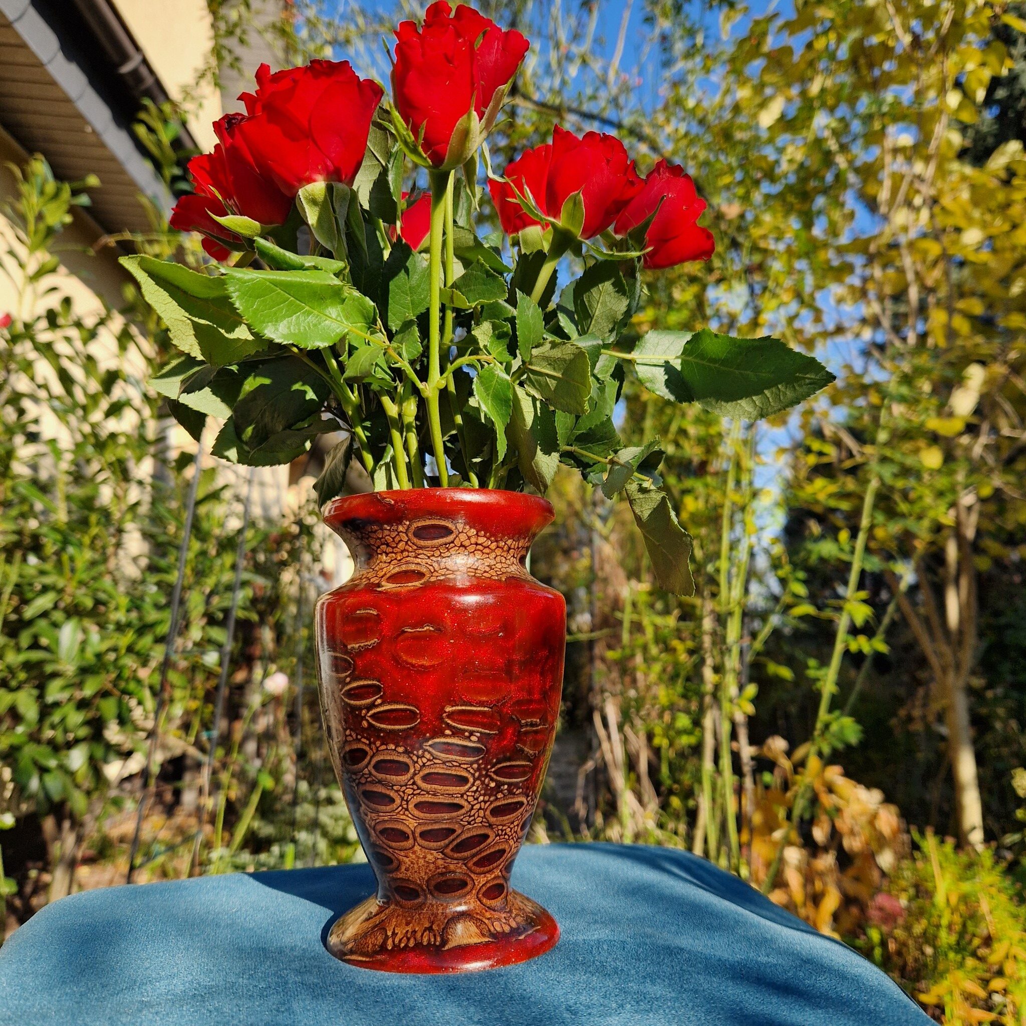 Odważny w kolorze i wzorze, z wirującymi elipsoidami i wzorem przypominającym łuski smocze, ten mały wazon epoksydowy dopasuje się do swojego właściciela. Jego kompaktowy rozmiar sprawia, że idealnie nadaje się do ekspozycji na biurkach, półkach lub w bardziej intymnych miejscach wymagających ozdoby.