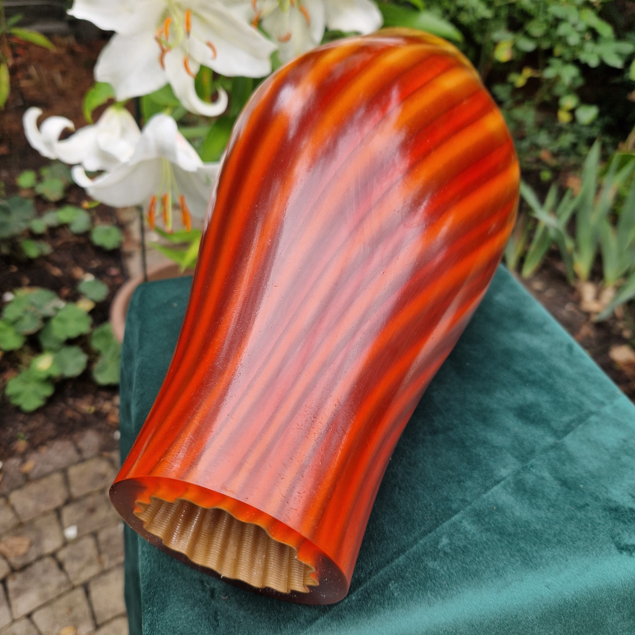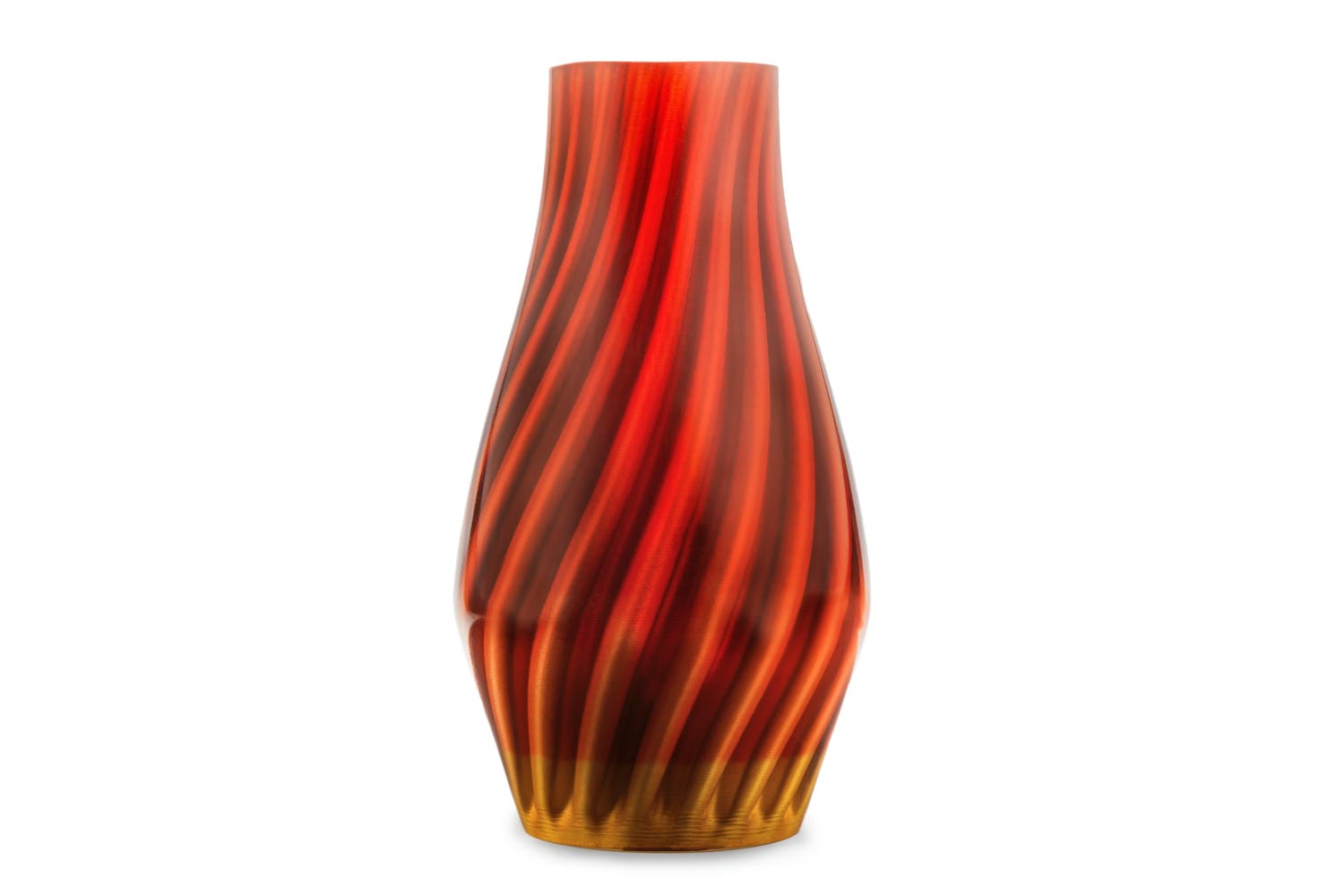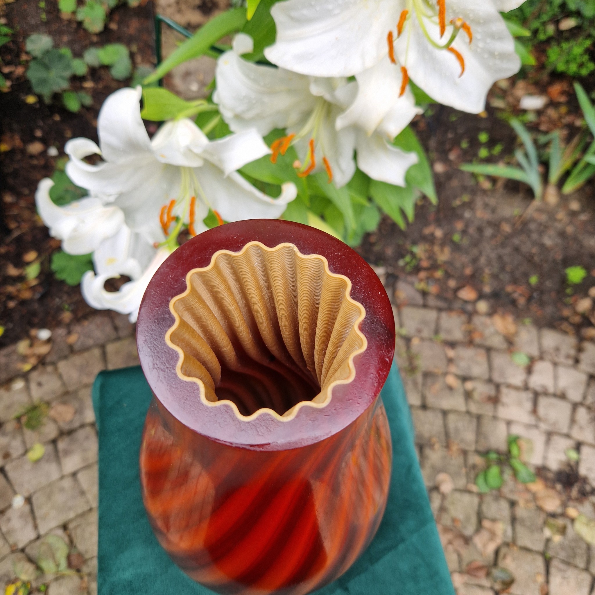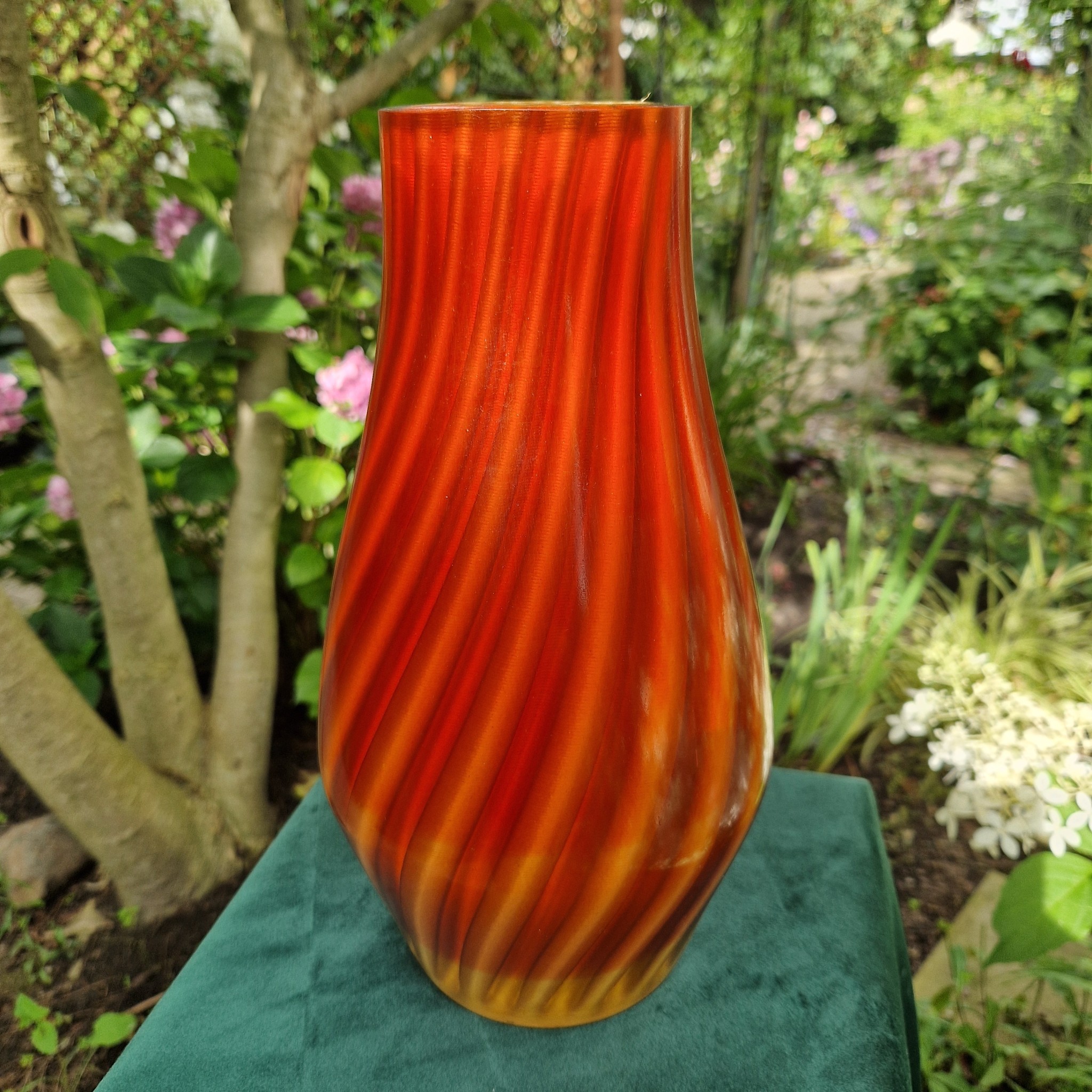 Ten duży i ciężki wazon łączy technologię z elegancją, tworząc jedyny w swoim rodzaju element dekoracyjny. Jego wewnętrzna struktura zawiera rzeźbioną wielokrotność spirali wykonaną z polimeru z domieszką drewna wydrukowanego w 3D, zamkniętą w grubej, przezroczystej żywicy epoksydowej. Żywica powiększa i pokazuje bogactwo i złożoność warstwowego wnętrza, dodając hipnotyzującej głębi i intrygi.