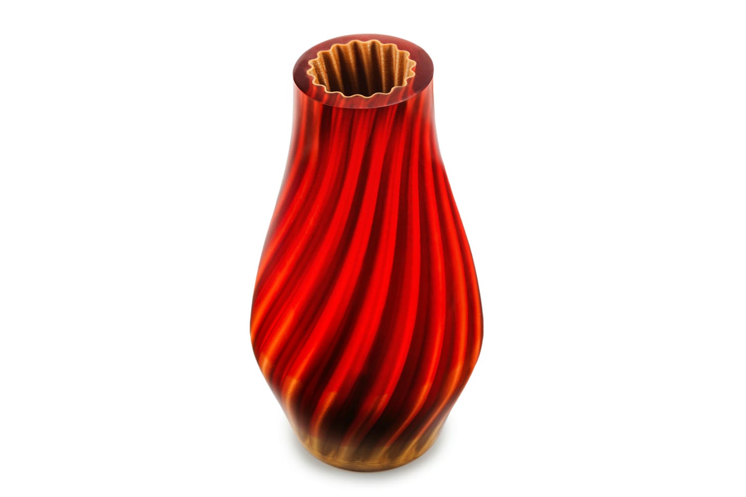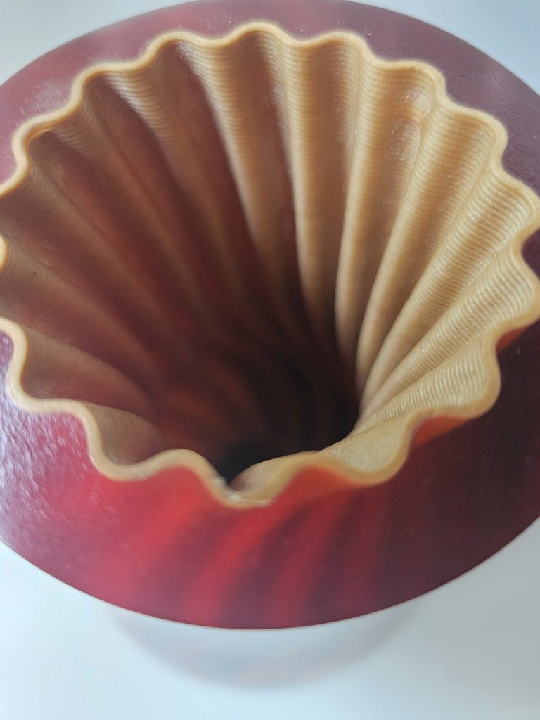 Klasyczna, toczona na tokarce sylwetka pięknie kontrastuje z organiczną, nowoczesną geometrią wnętrza. Subtelne półbłyszczące wykończenie igra ze światłem, prowadząc wzrok od znajomej zewnętrznej formy do złożonych warstw wewnątrz.