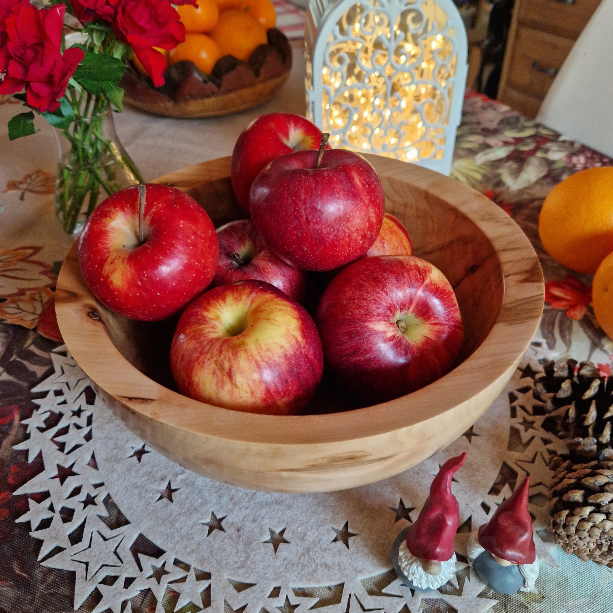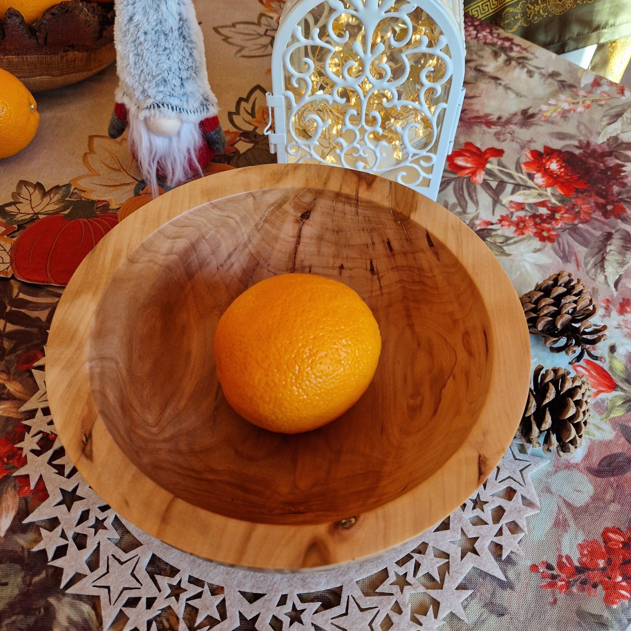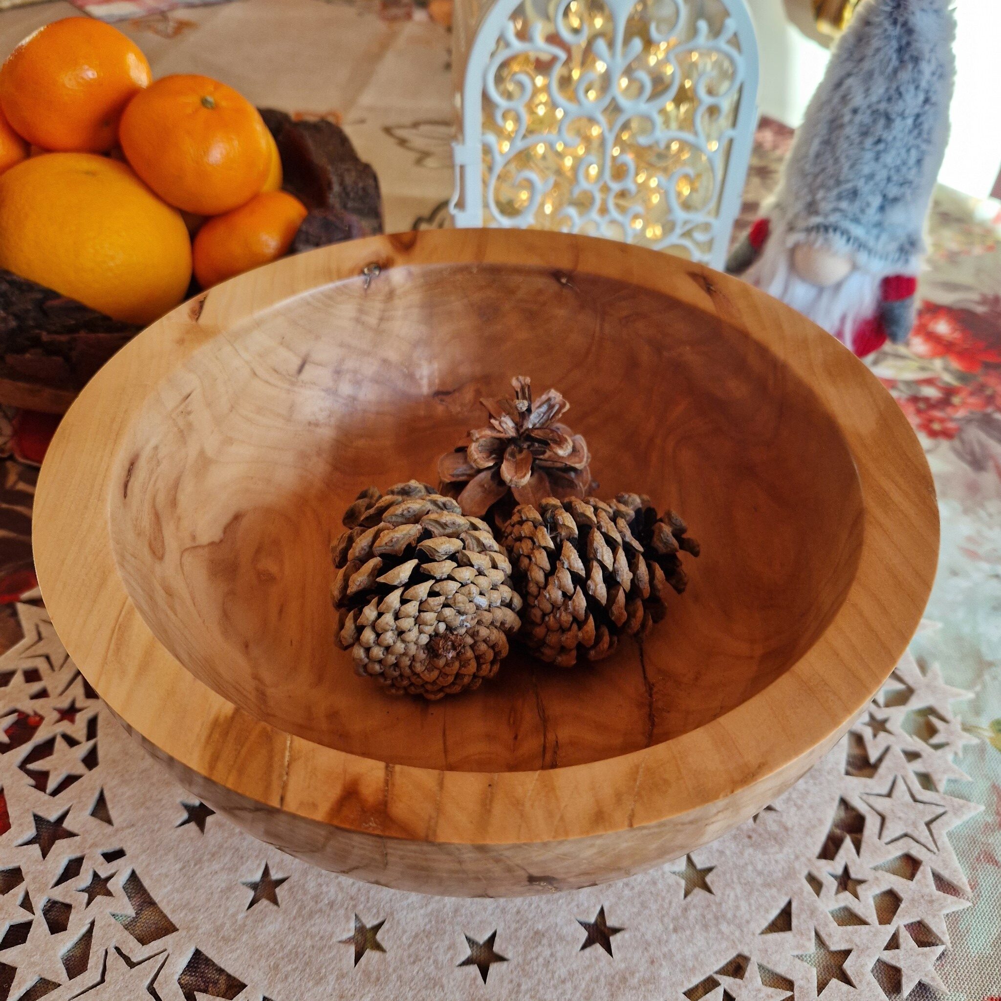 Duża misa na owoce lub inne pyszne produkty została wykonana z drewna drzewa owocowego – jabłoni. Ciąży w dłoni i ma wyrazisty charakter. Naturalne pęknięcia charakterystyczne dla drzew owocowych zostały wypełnione klejem żywicznym z kryształkami złotej miki w japońskim stylu Kintsugi. Spód misy okala cokolik, który nadaje jej masywnej postaci lekkości i unosi ją nad stołem. Kształt charakteryzuje się pochyłą, nowoczesną, grubą krawędzią. Jest to efektowny przedmiot z naturalnego drewna, który ozdobi każdy stół.