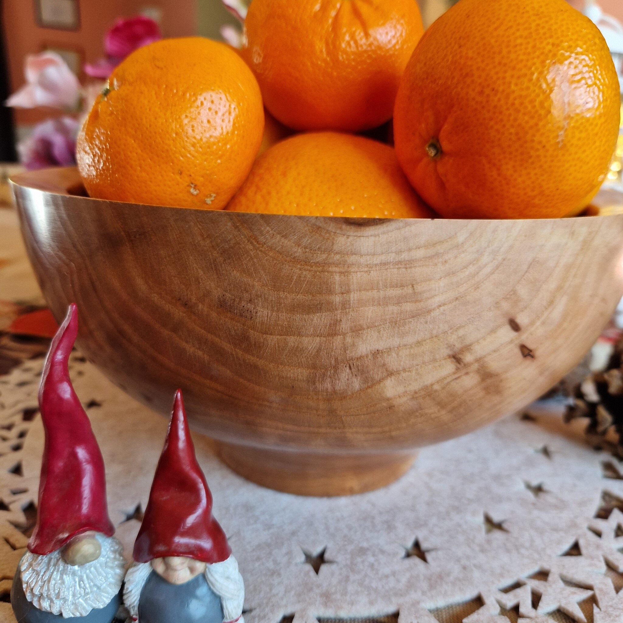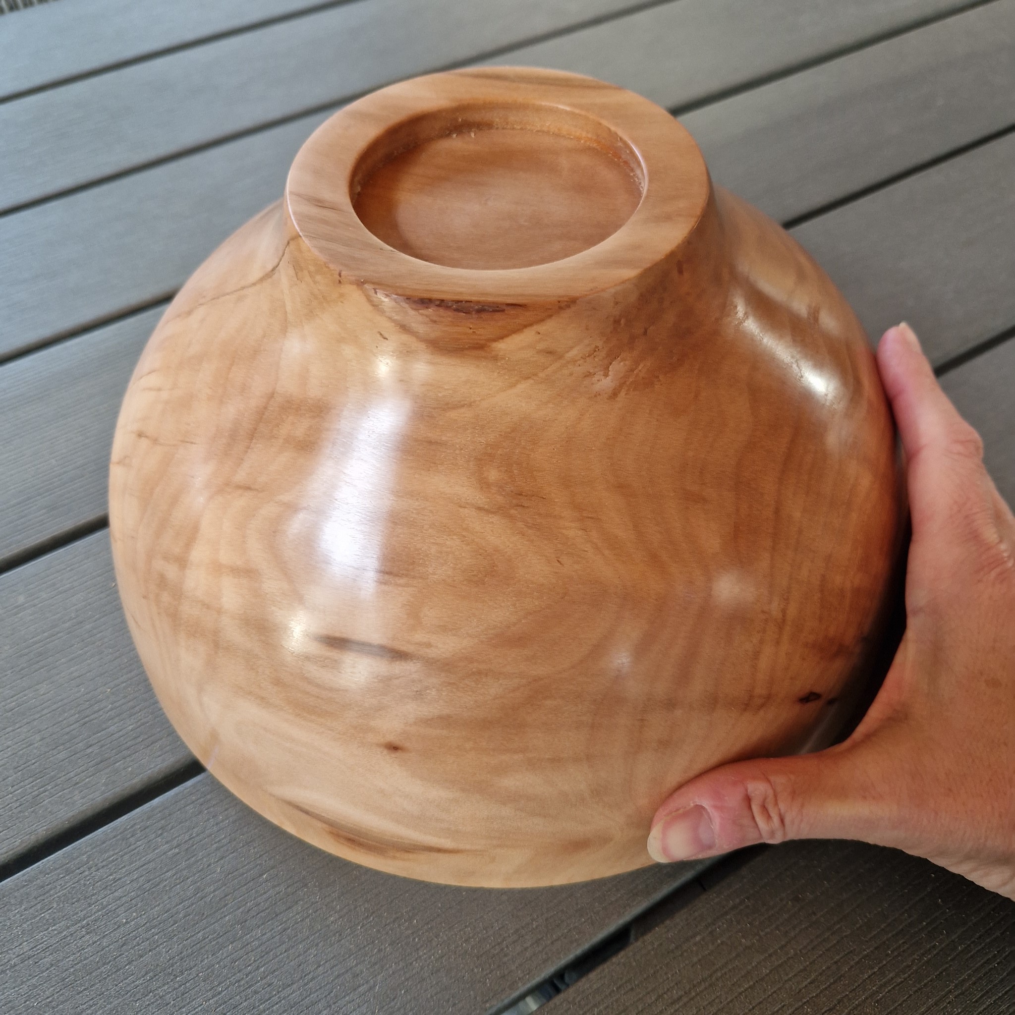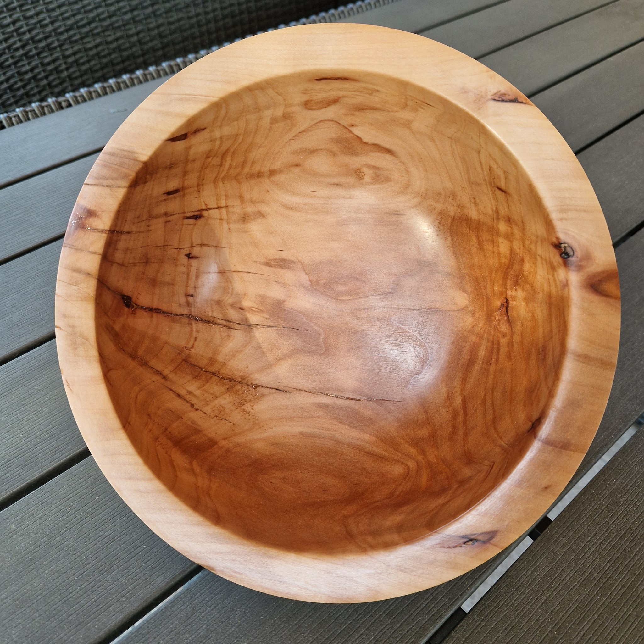 Duża misa na owoce lub inne pyszne produkty została wykonana z drewna drzewa owocowego – jabłoni. Ciąży w dłoni i ma wyrazisty charakter. Naturalne pęknięcia charakterystyczne dla drzew owocowych zostały wypełnione klejem żywicznym z kryształkami złotej miki w japońskim stylu Kintsugi. Spód misy okala cokolik, który nadaje jej masywnej postaci lekkości i unosi ją nad stołem. Kształt charakteryzuje się pochyłą, nowoczesną, grubą krawędzią. Jest to efektowny przedmiot z naturalnego drewna, który ozdobi każdy stół.