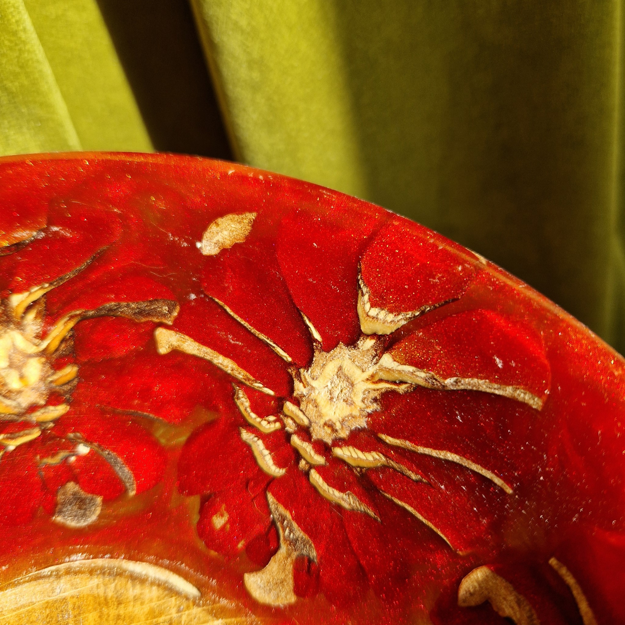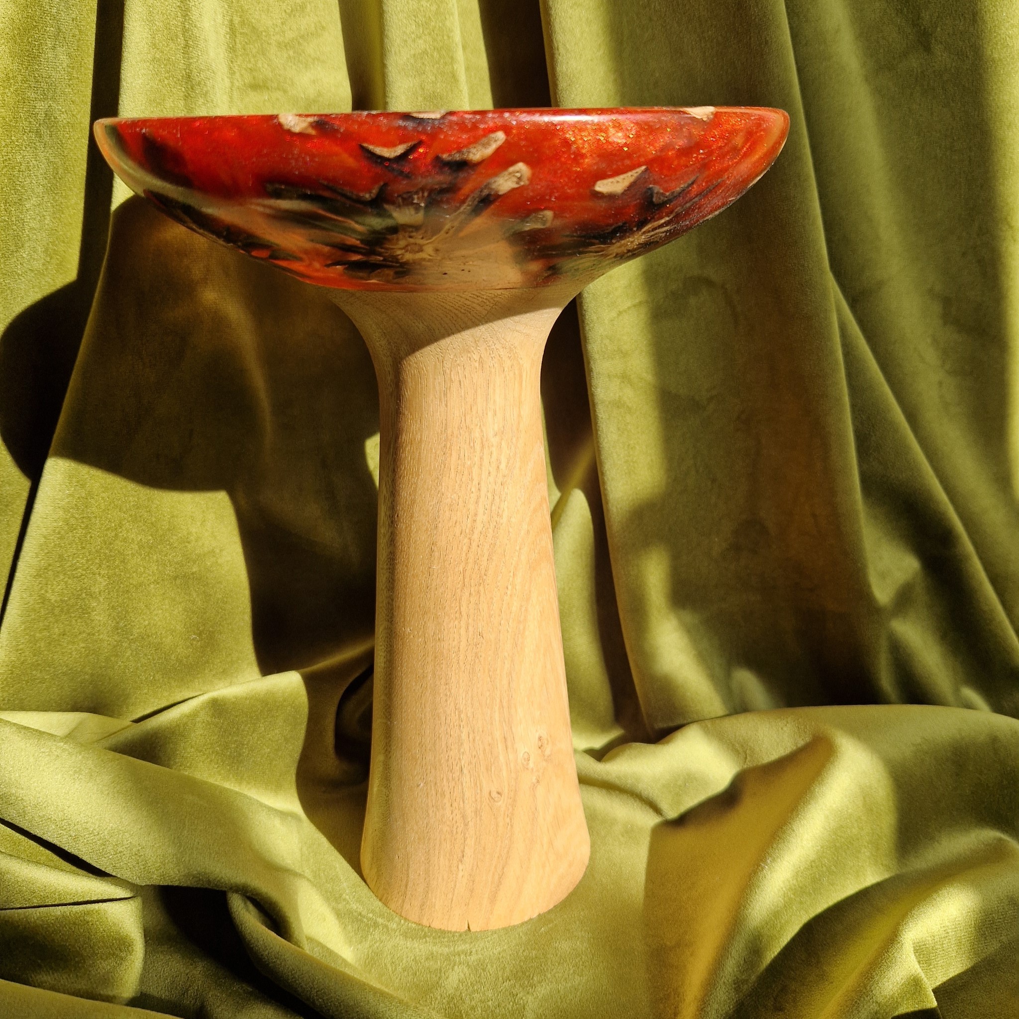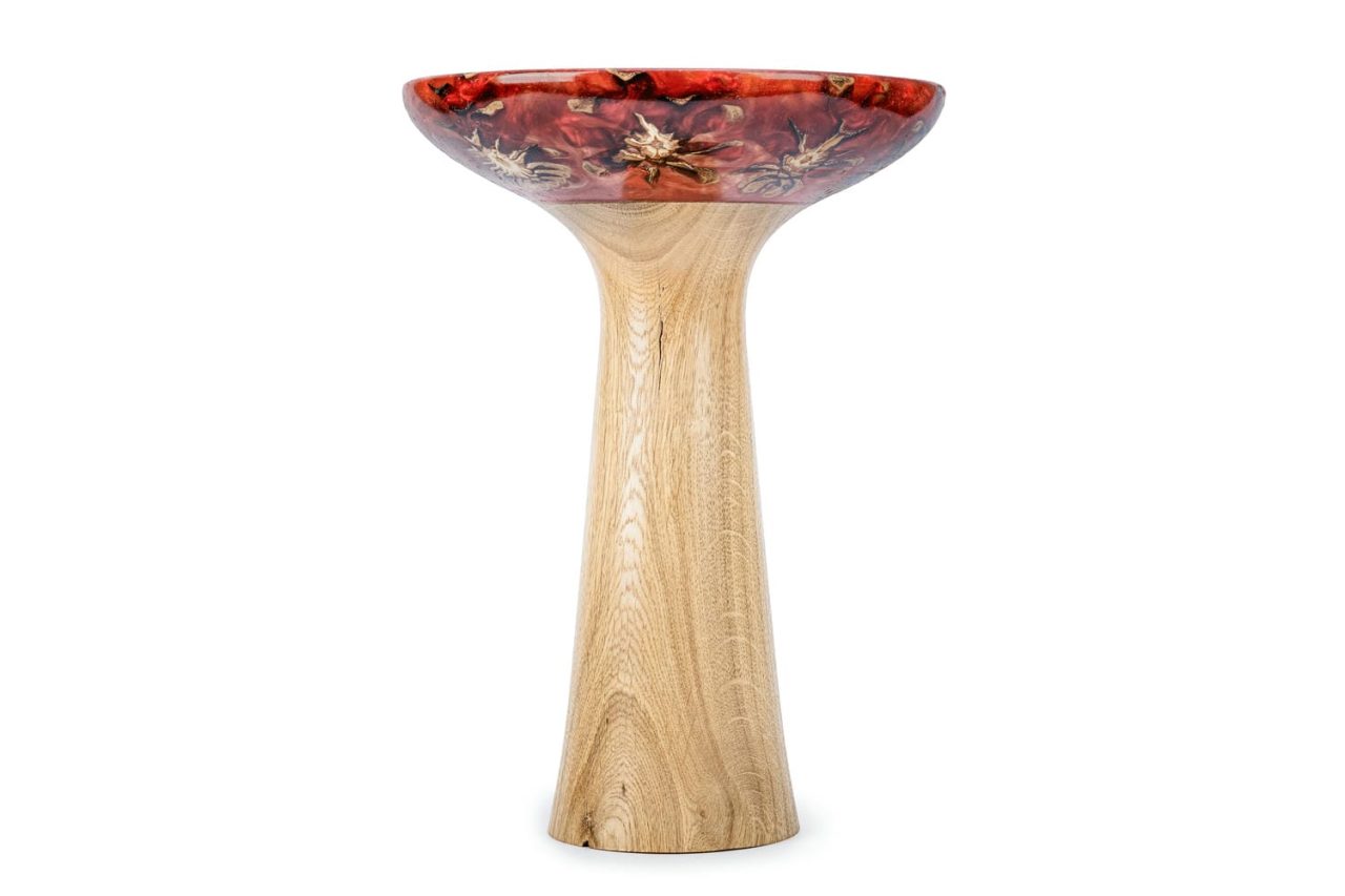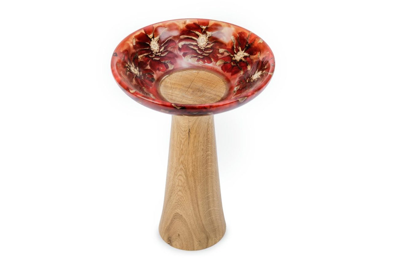 Nasza wysoka i solidna patera łączy elegancki design z naturalnym pięknem. Sam niewielki talerz, o głębokim czerwonym kolorze spoczywa na mocnym dębowym cokole, tworząc rzucającą się w oczy sylwetkę, która łączy płynne, minimalistyczne krzywe z organiczną teksturą. Widoczne wnętrza szyszek sosnowych są zawieszone w karminowej żywicy i ujawniają hipnotyzujące szczegóły poruszając wyobraźnię. Ciężka dębowa podstawa i świecąca drobinkami złotej miki czerwona żywica epoksydowa sprawiają, że ten przedmiot jest odważny, dramatyczny i niezapomniany.