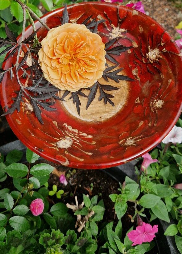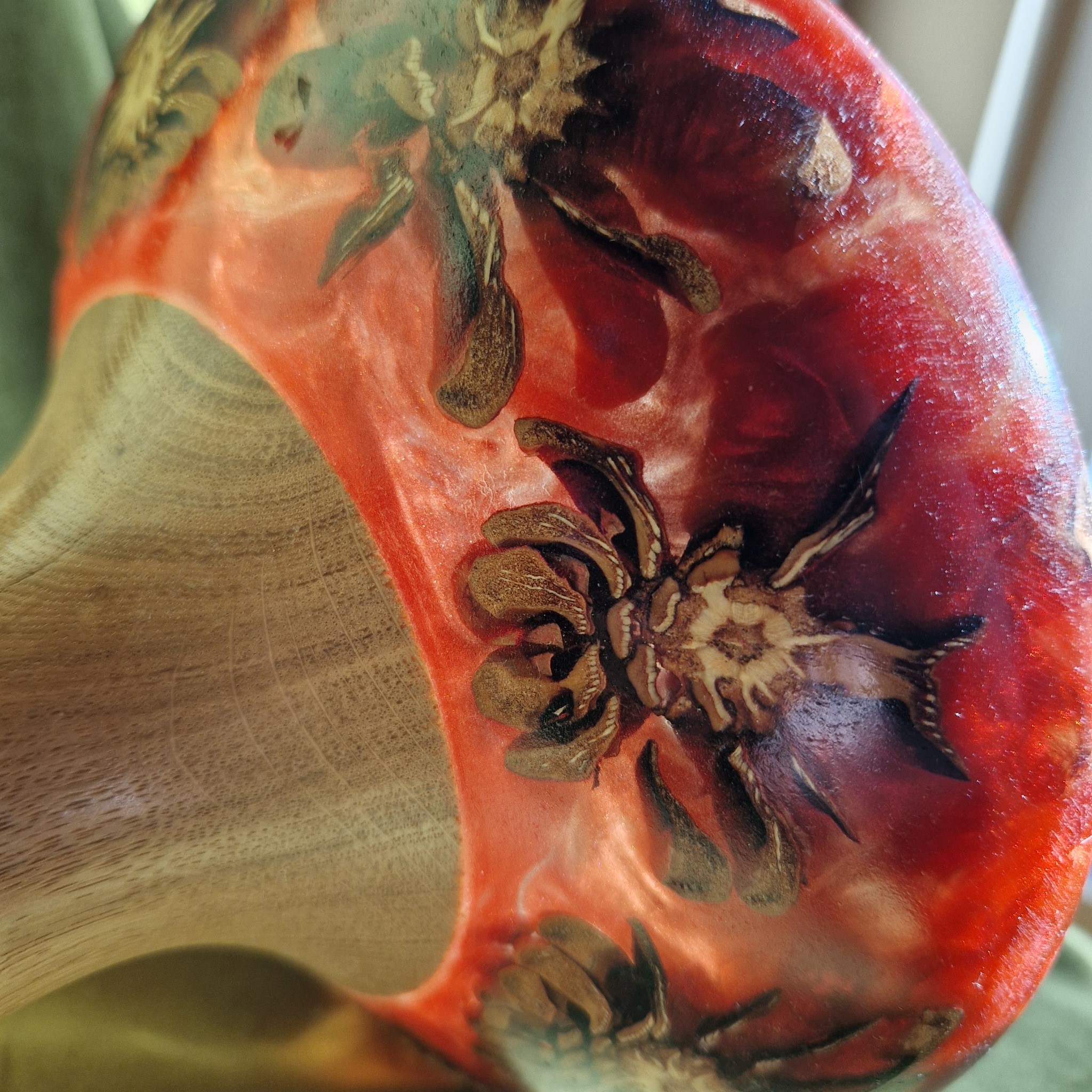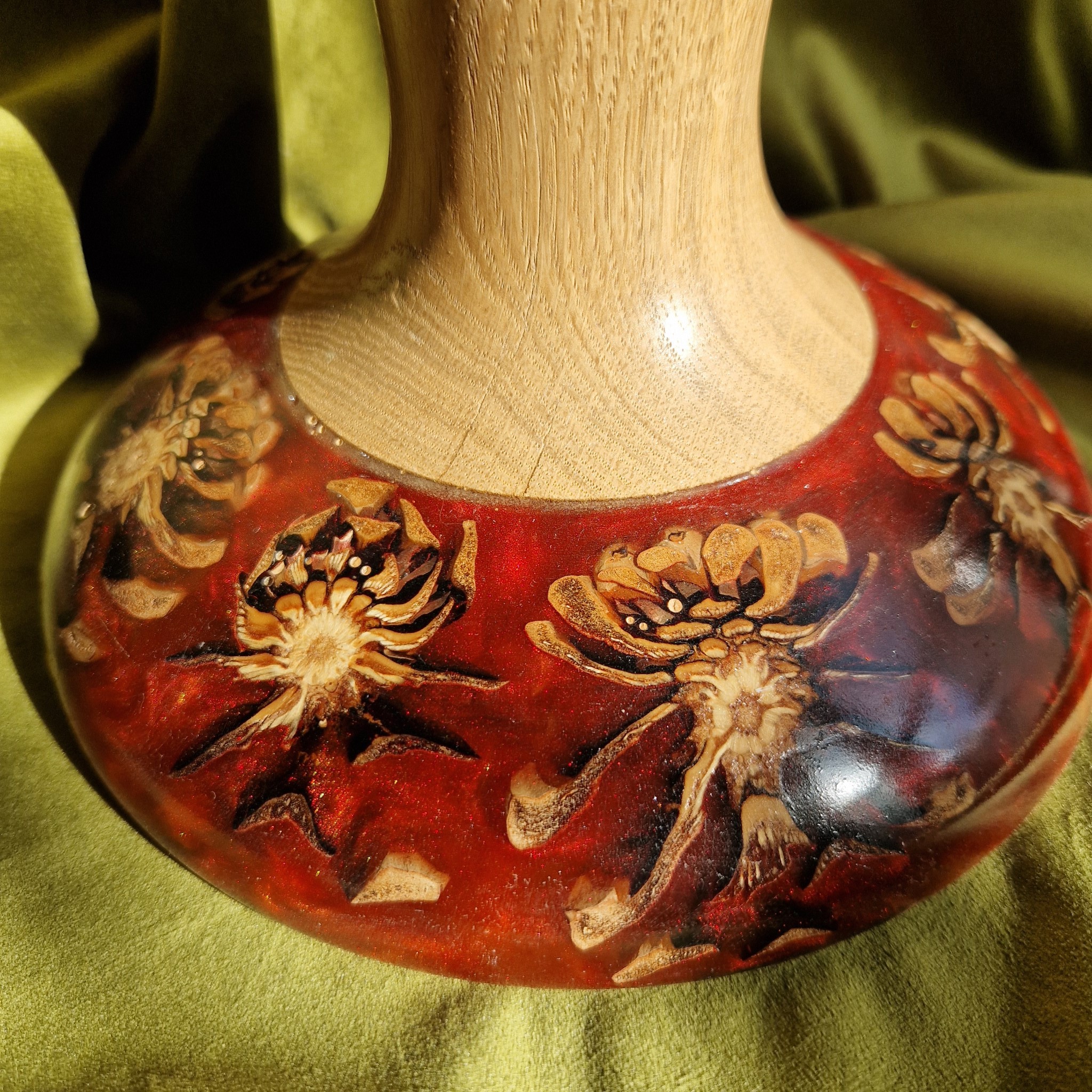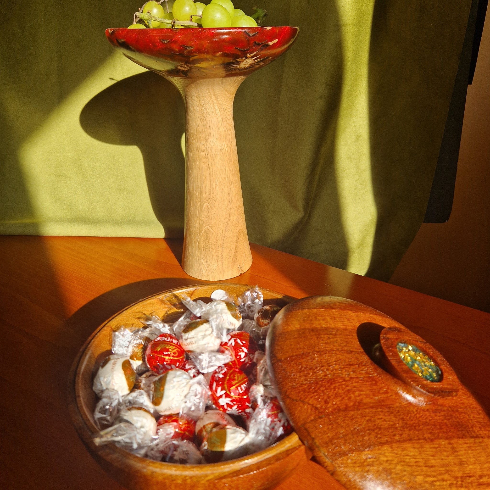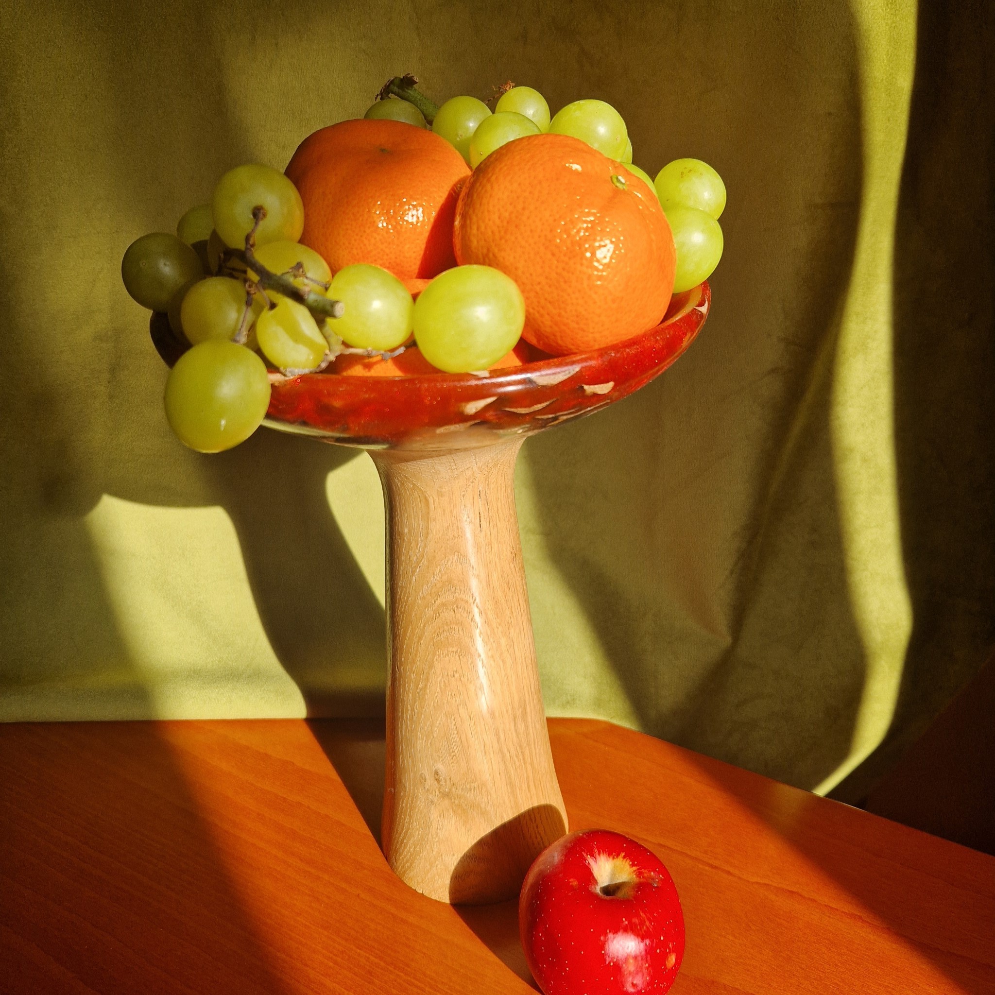 Nasza wysoka i solidna patera łączy elegancki design z naturalnym pięknem. Sam niewielki talerz, o głębokim czerwonym kolorze spoczywa na mocnym dębowym cokole, tworząc rzucającą się w oczy sylwetkę, która łączy płynne, minimalistyczne krzywe z organiczną teksturą. Widoczne wnętrza szyszek sosnowych są zawieszone w karminowej żywicy i ujawniają hipnotyzujące szczegóły poruszając wyobraźnię. Ciężka dębowa podstawa i świecąca drobinkami złotej miki czerwona żywica epoksydowa sprawiają, że ten przedmiot jest odważny, dramatyczny i niezapomniany.