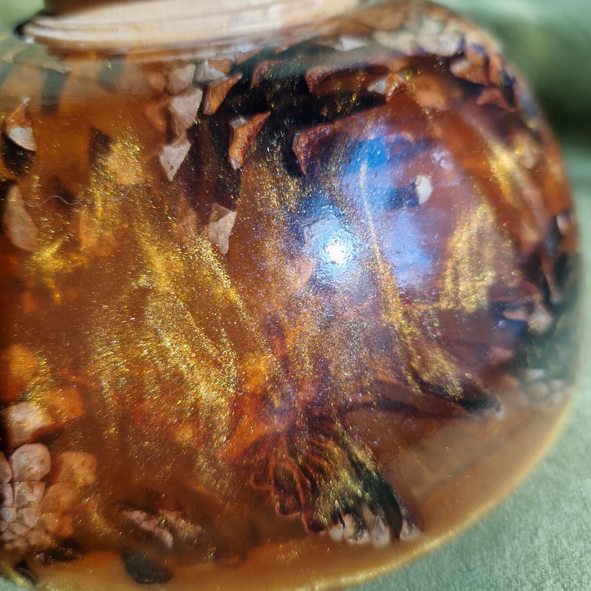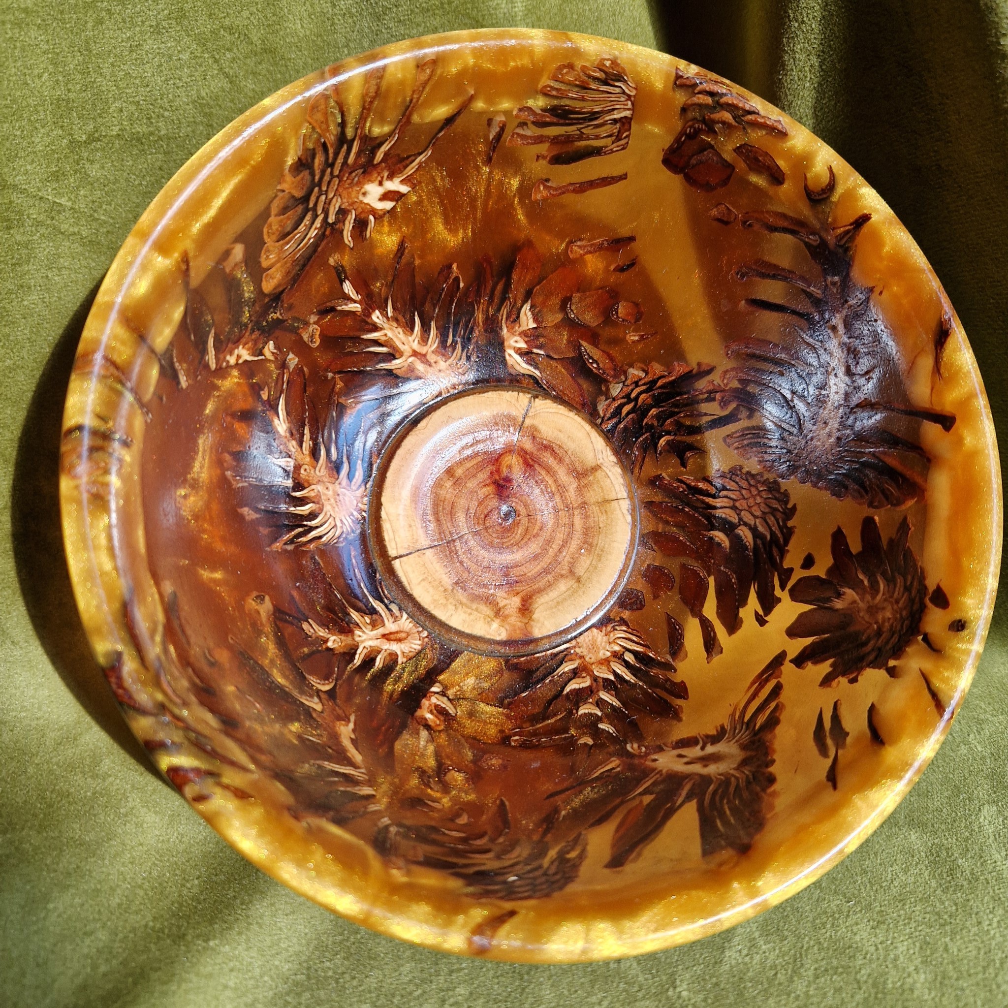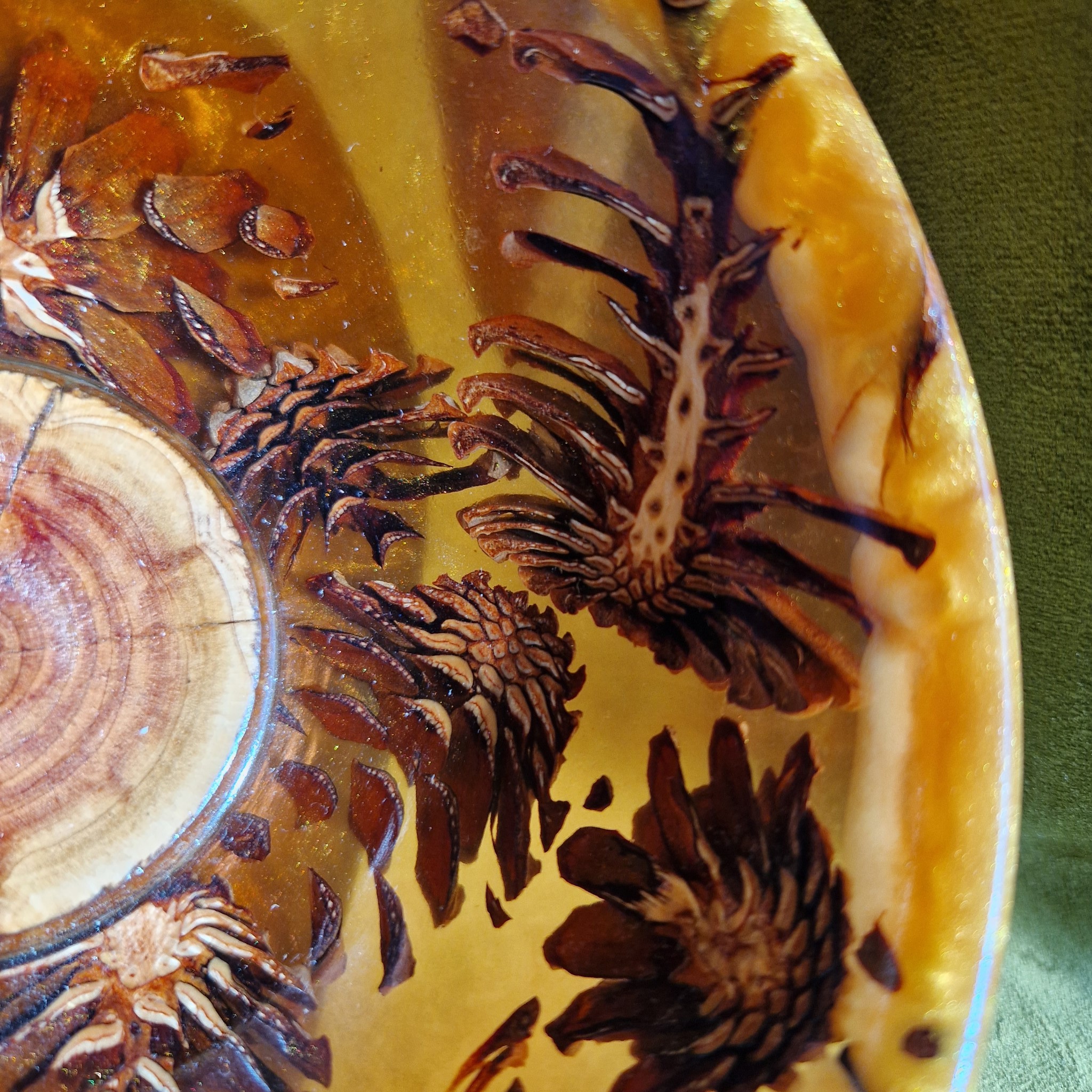 Zaprojektowana tak, aby pomieścić delikatną świecę lub lampkę nocną, misa utrzymuje stabilny płomień dzięki wysokiej krawędzi. Jest w pełni wodoodporna, dlatego można w niej umieścić pływające świece w łazience, salonie lub kuchni. Można ja również wypełnić pachnącymi płatkami potpourrie lub łakociami. Górna krawędź łączy w sobie zawirowaną złotą i pomarańczową żywicę epoksydową, wzmacniając jej promienny, żywy wygląd. Każdy szczegół sosnowych szyszek pozostaje widoczny, zmieniając naturalne formy w urzekający spektakl.