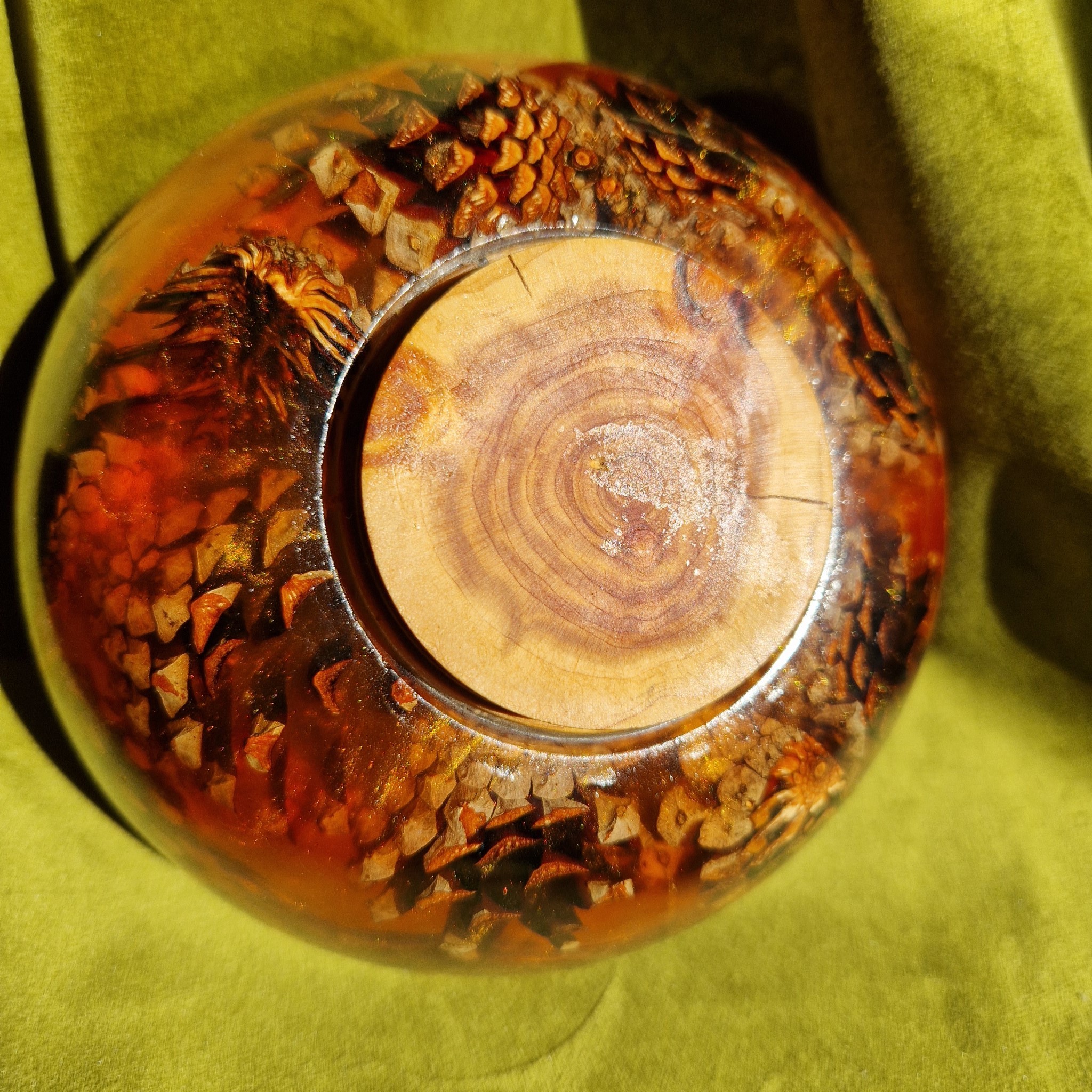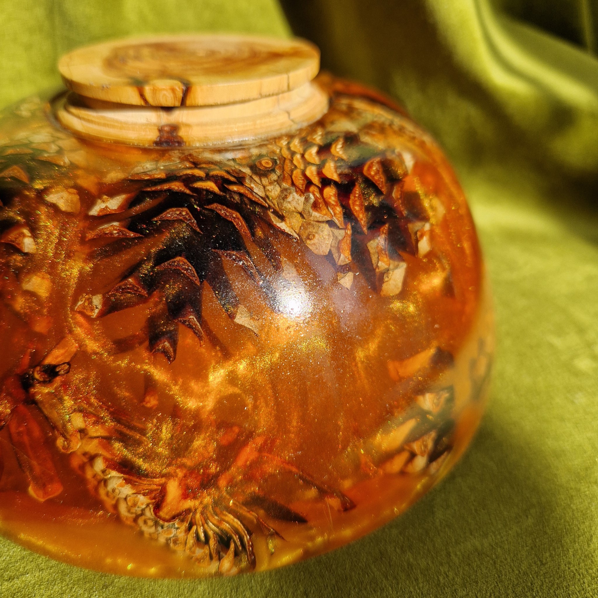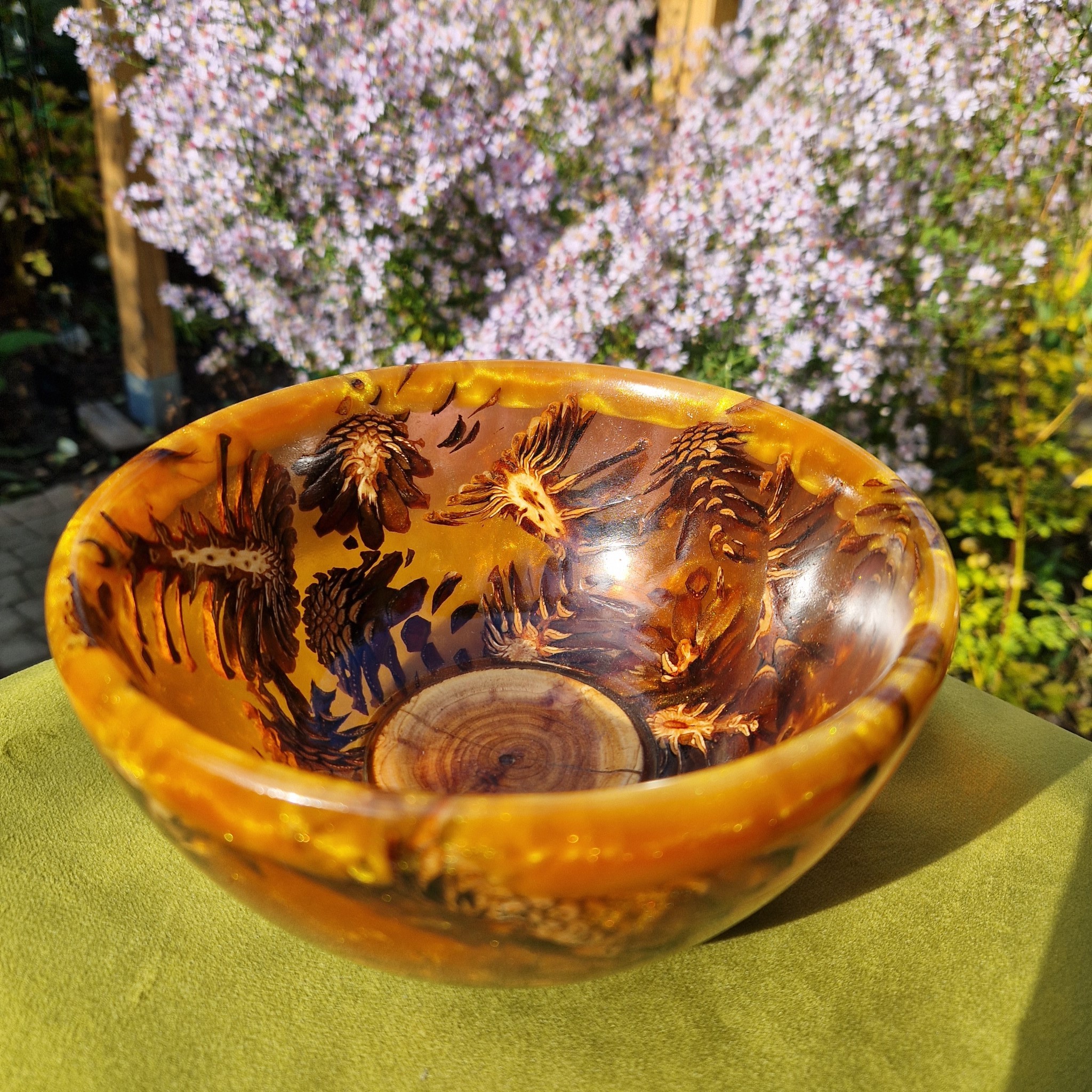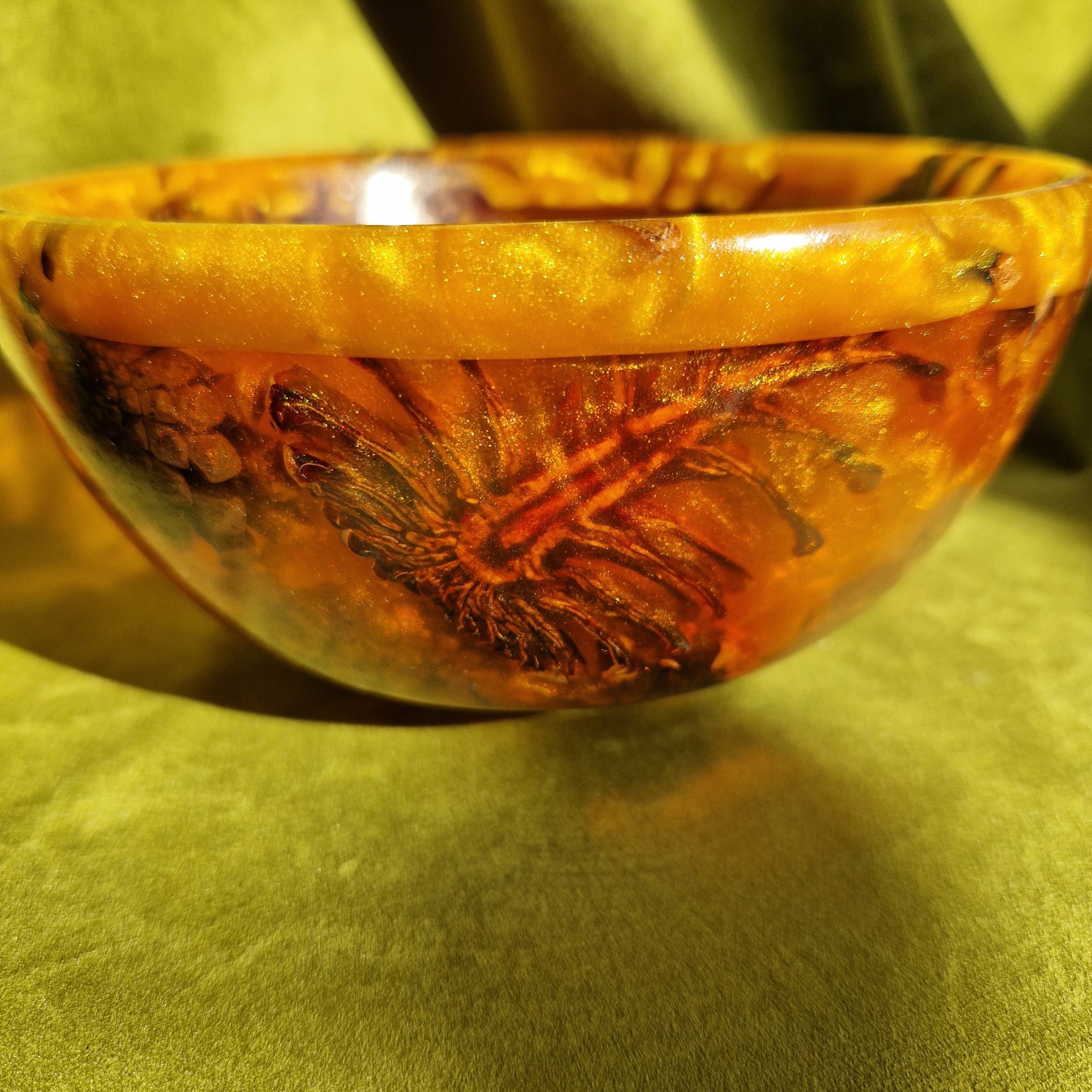 Ta miska celebruje piękno natury dzięki elementom szyszek sosnowych zawieszonych w wirującej, przezroczystej pomarańczowej żywicy epoksydowej. Światło słoneczne rzuca ciepłą poświatę i delikatne cienie przez ścianki naczynia na każdą powierzchnię, podkreślając skomplikowany efekt 3D cienko pokrojonych szyszek. Ta dekoracyjna misa wnosi ciepło porannego światła do domu i pasuje do każdego nasłonecznionego miejsca.