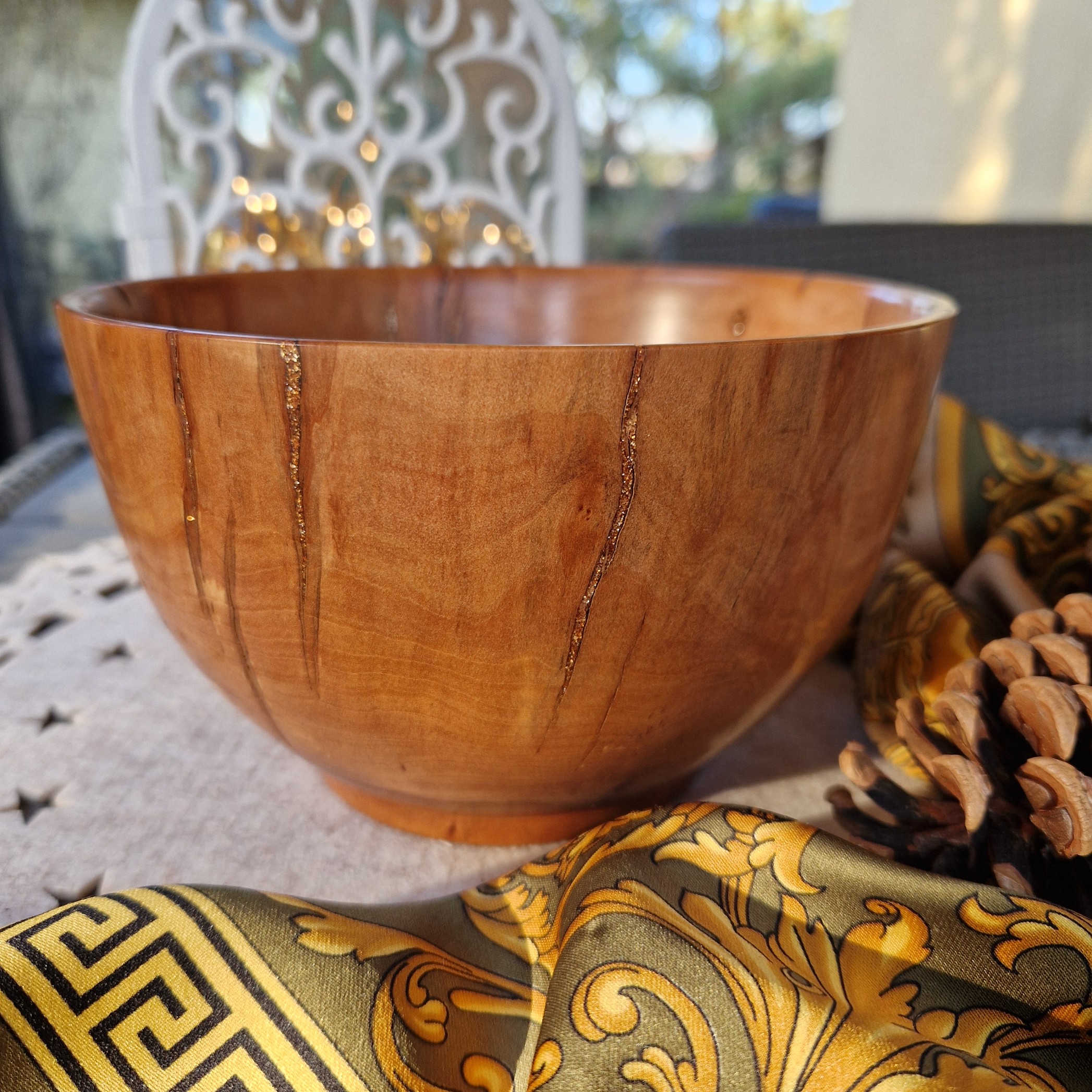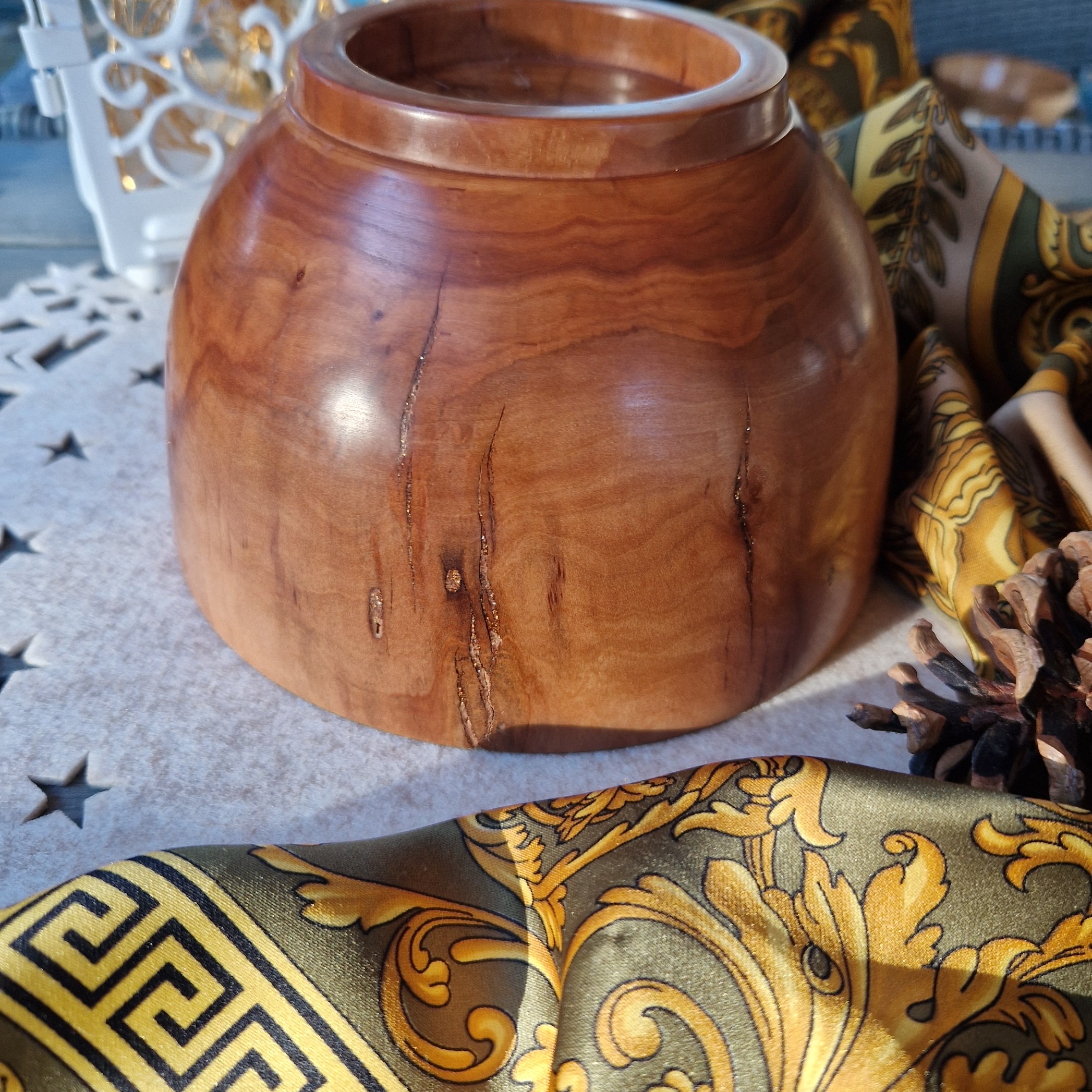 Nasza miska z drzewa śliwy celebruje piękno niedoskonałości — ukształtowana przez naturę, dopracowana ręką człowieka i wykończona złotym akcentem.